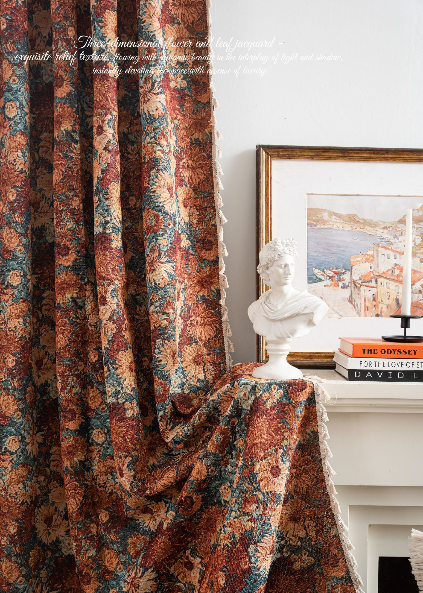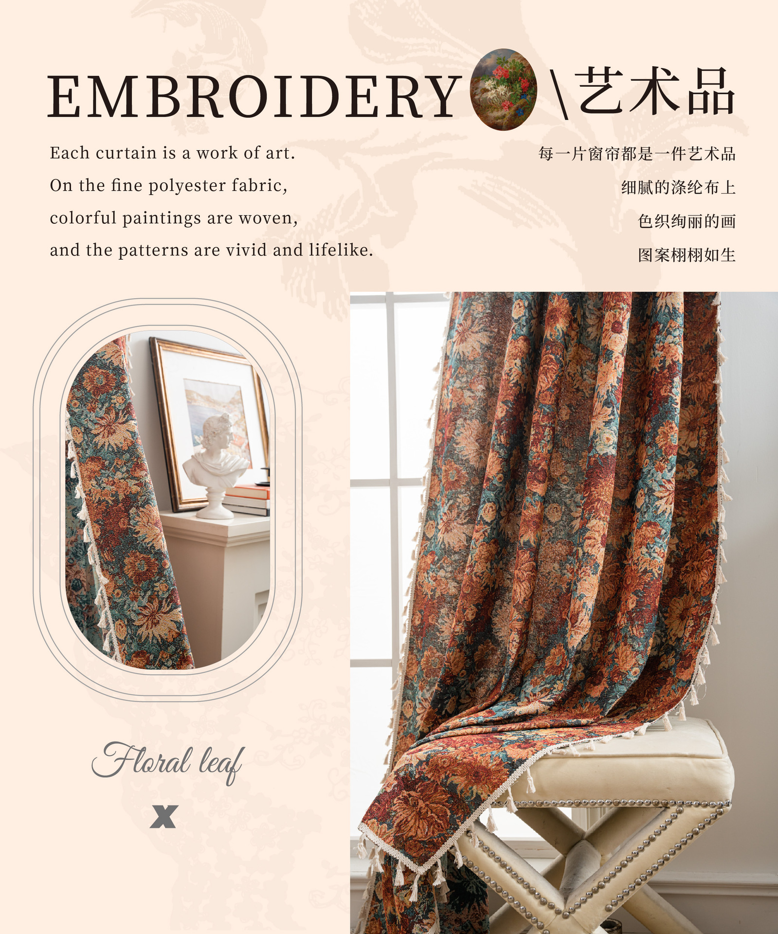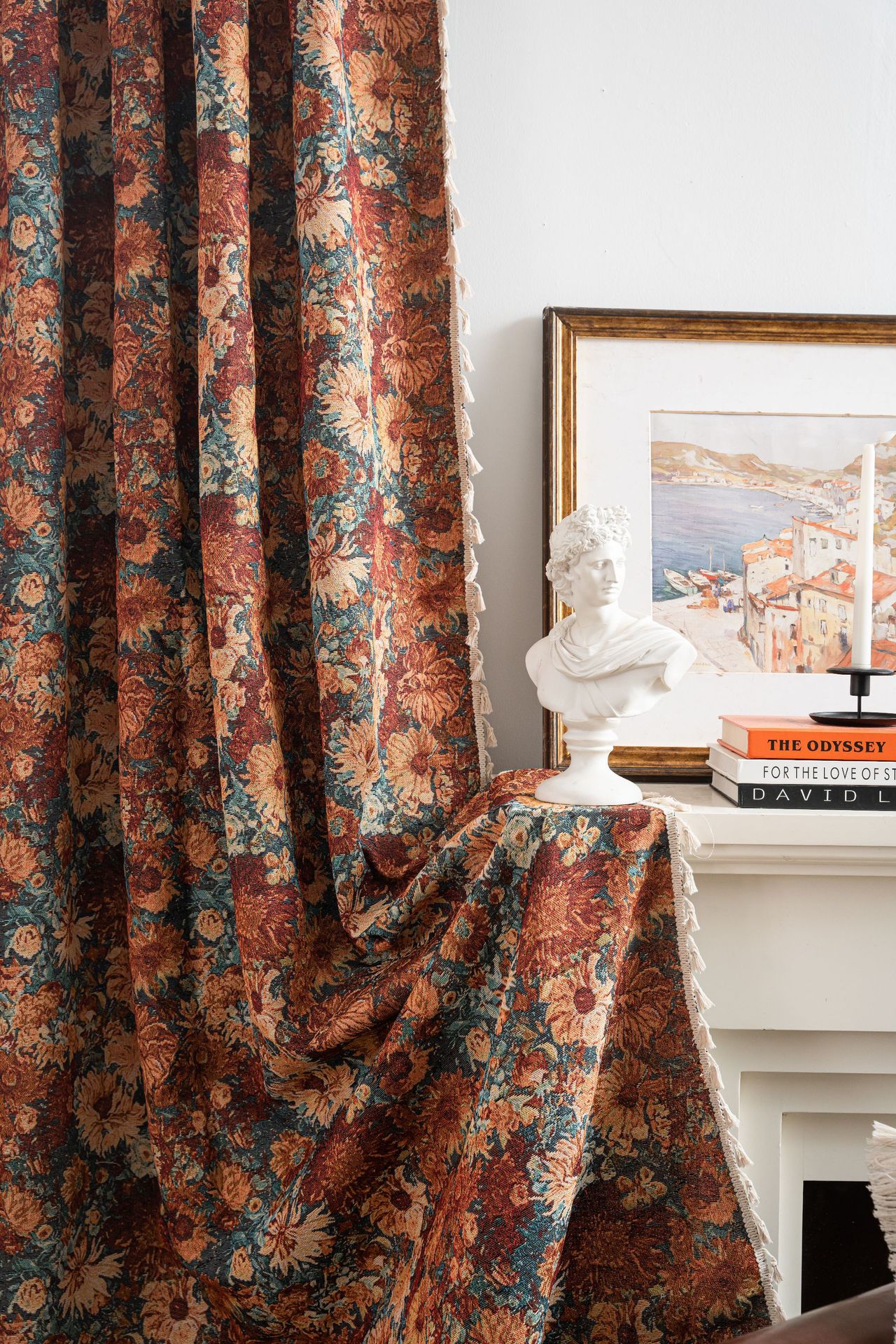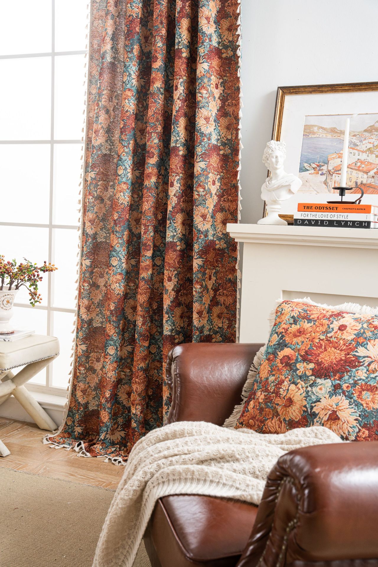 이만 키 라임 프렌치 커튼 마감 자카드 오렌지 플라워 술 커튼 반음영 거실 클래식 두껍게