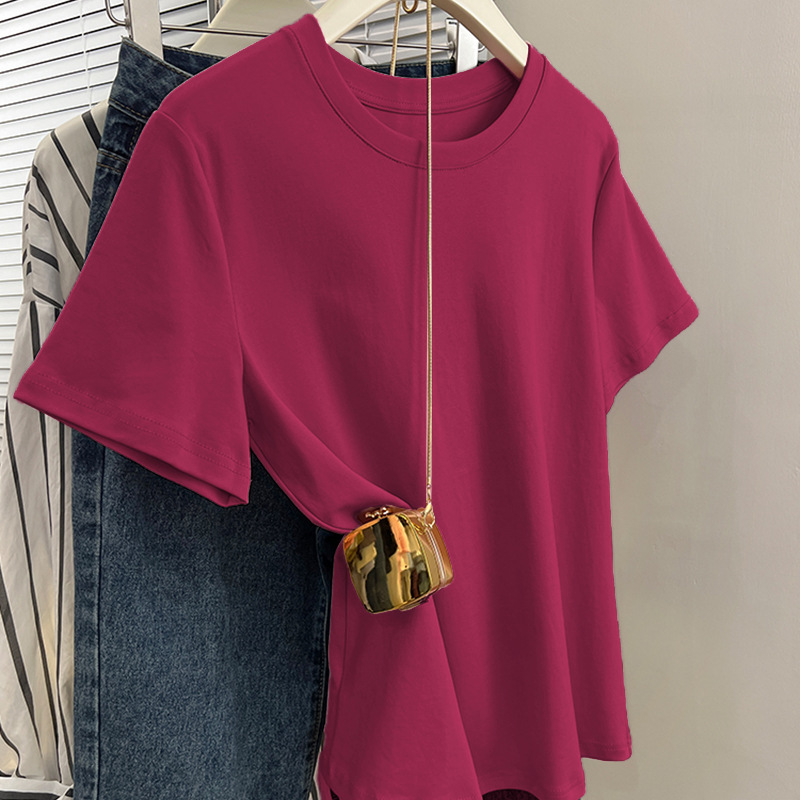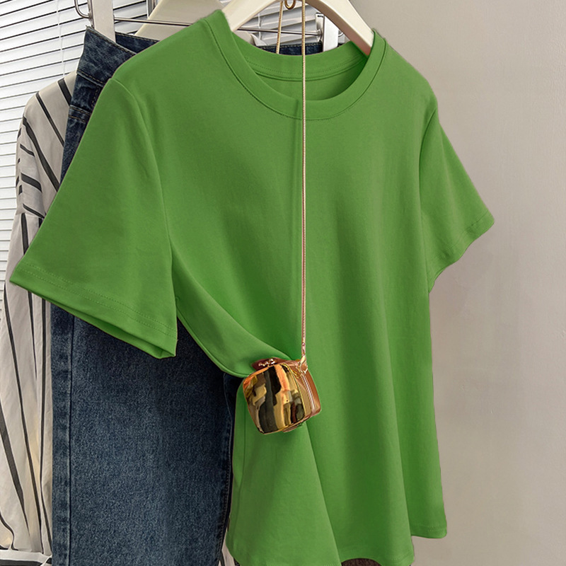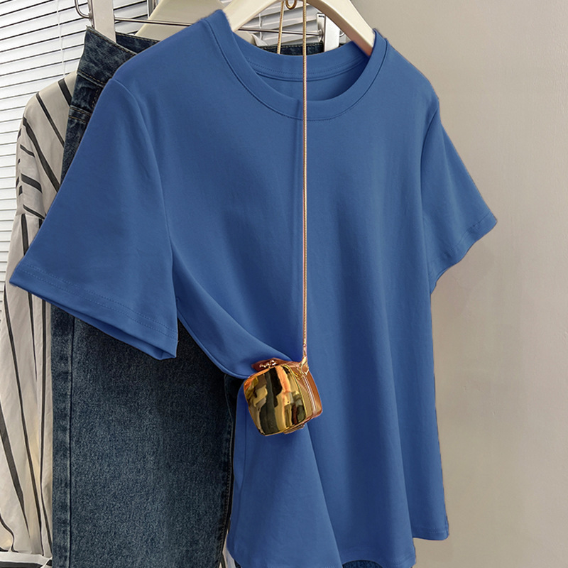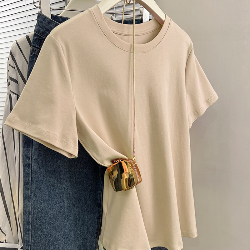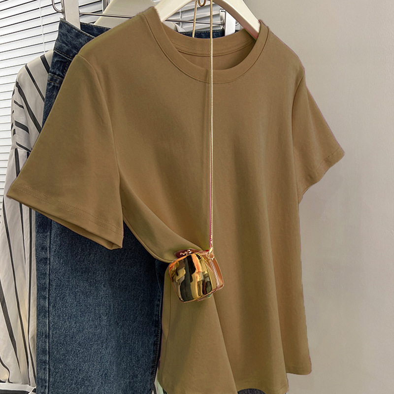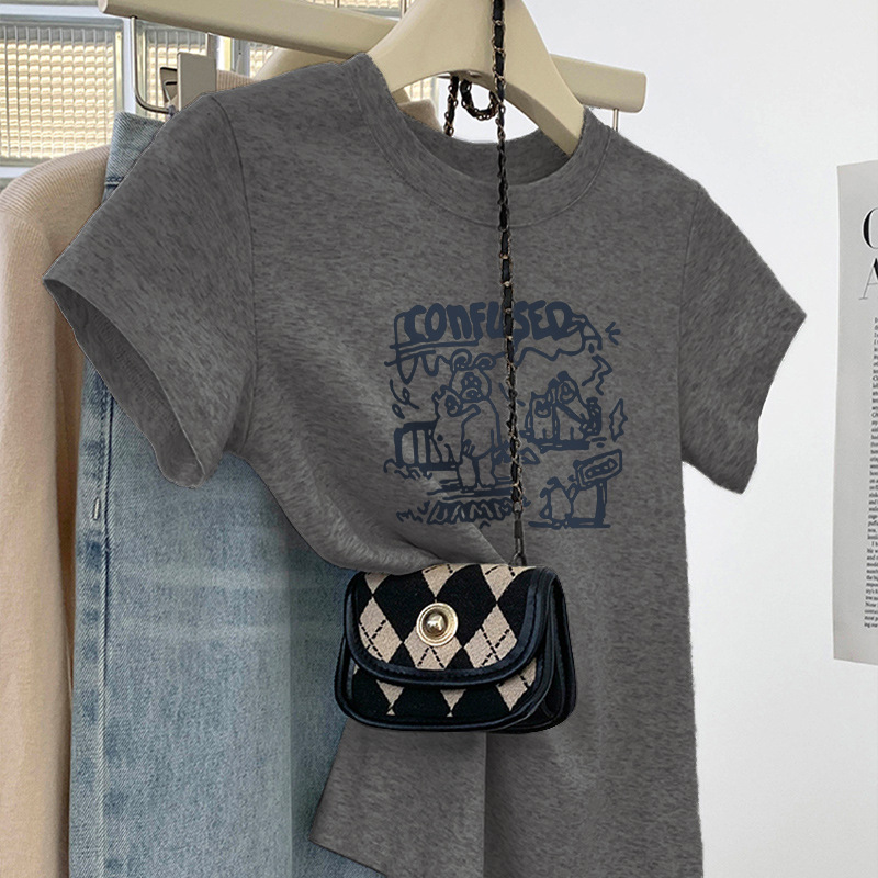 그레이 크루 넥 어깨 반팔 티셔츠 여자 2024 년 여름 새로운 슬림 핏 슬리밍 올매치 코튼 반소매 티셔츠 탑스토어 가기