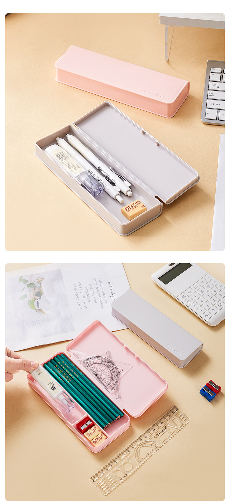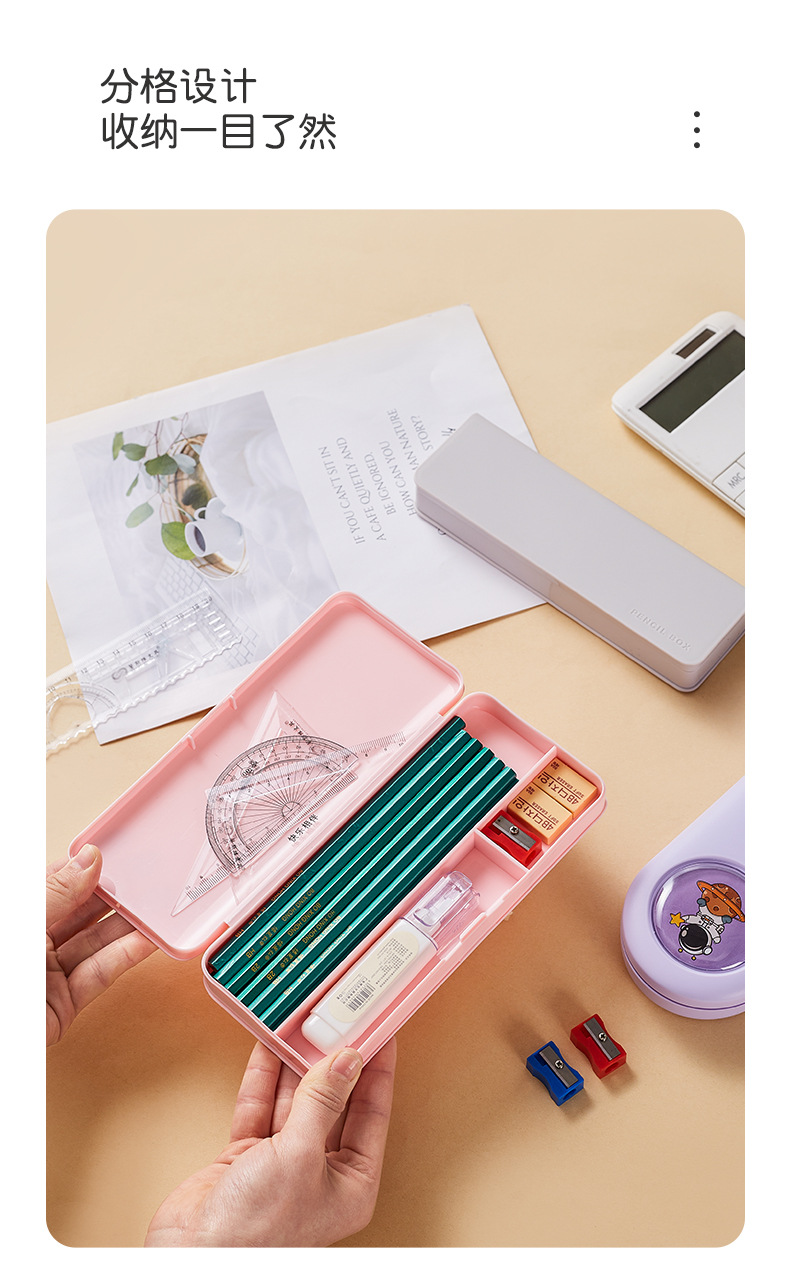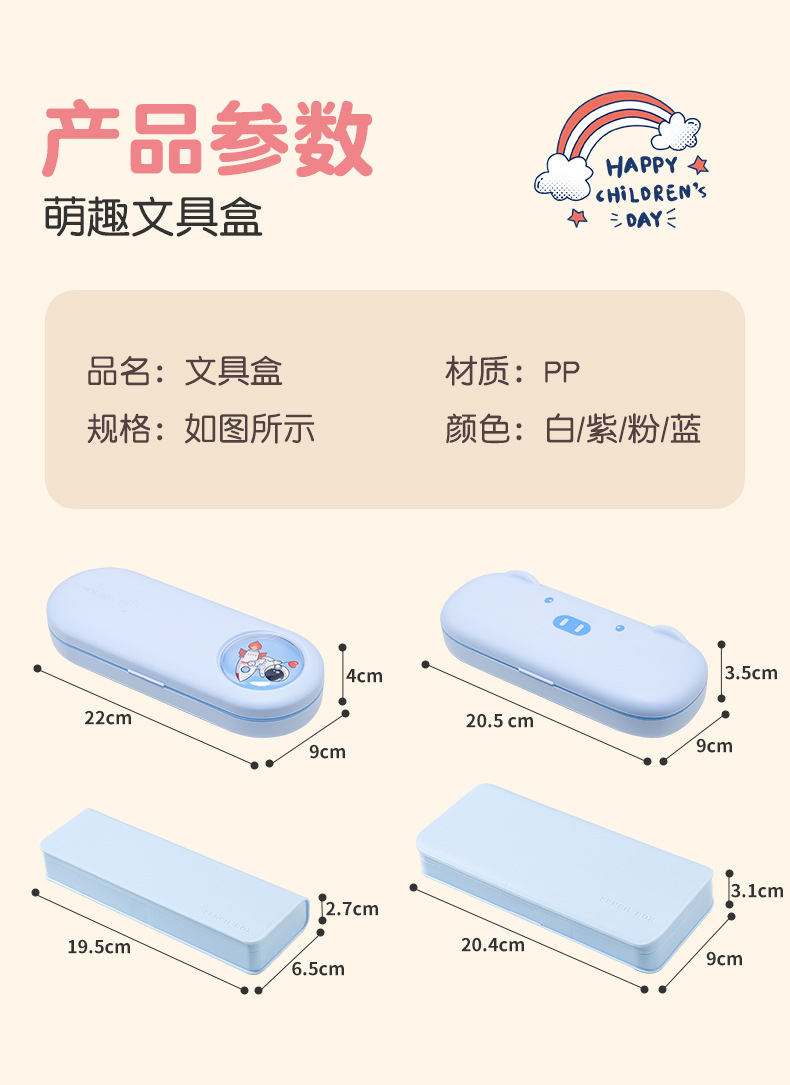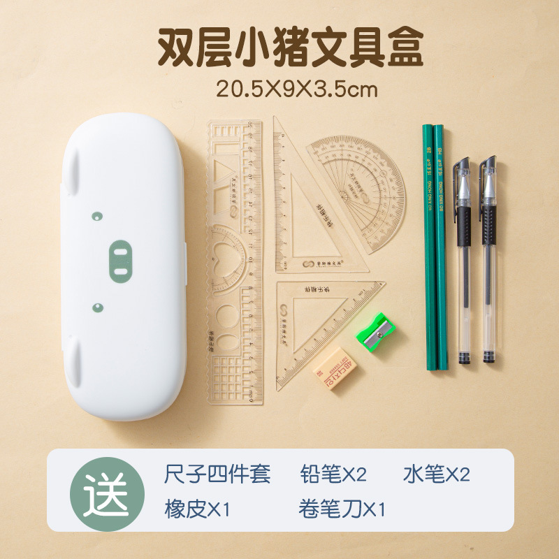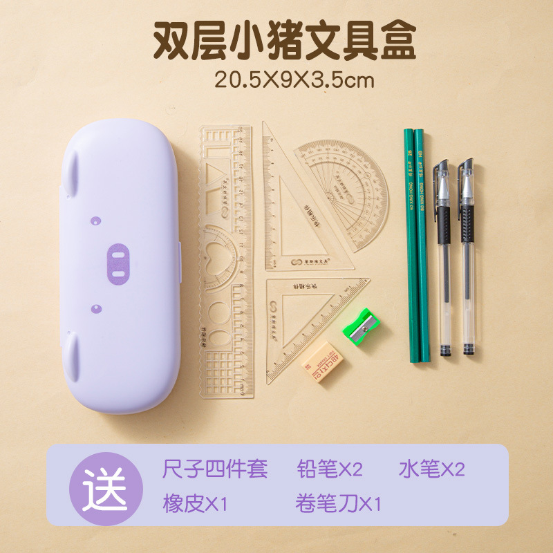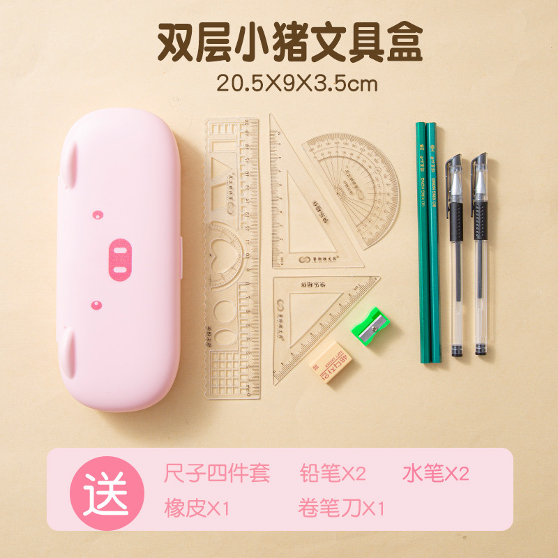 小猪双层文具盒:装箱数150 尺寸:长20.5宽9高3.5 重量:115克