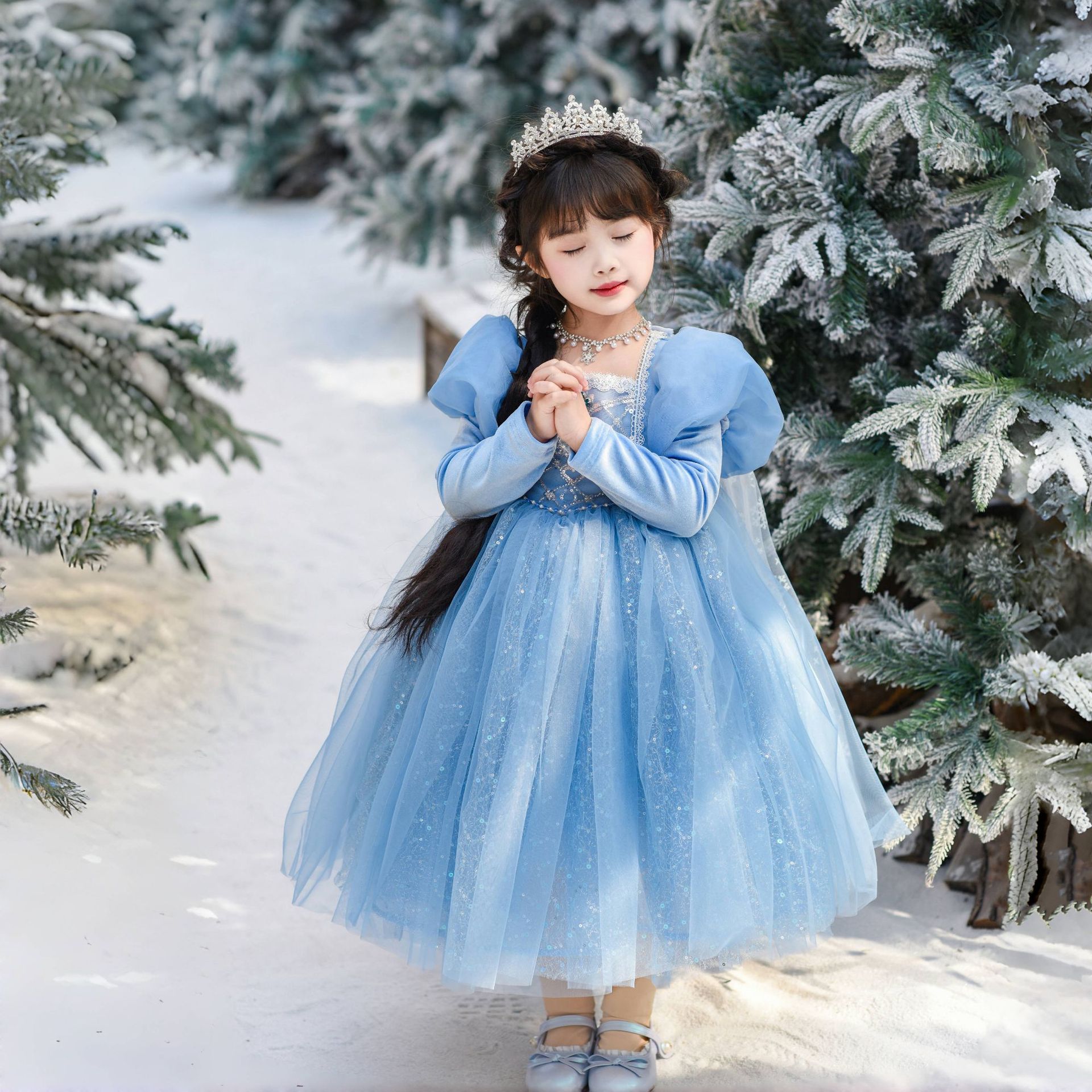 봄과 여름 2025 새로운 도착 푹신한 원피스 베일 원피스 소녀 공연 공주 아이샤 원피스 눈송이 망토 냉동 생일