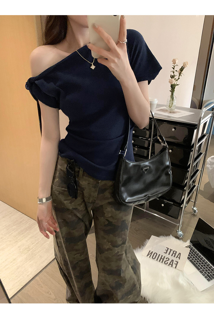 뜨거운 소녀 디자인 순수한 욕망 와플 잉크 슬란 트 어깨 반팔 티셔츠 여성용 2025 년 여름 새 어깨 탑