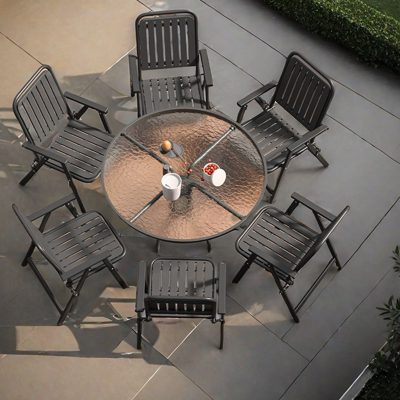 • 브라운 - 세로 패턴 접이식 의자 6개 + 105CM 물 패턴 조립 원형 테이블 두꺼운 플랫 튜브