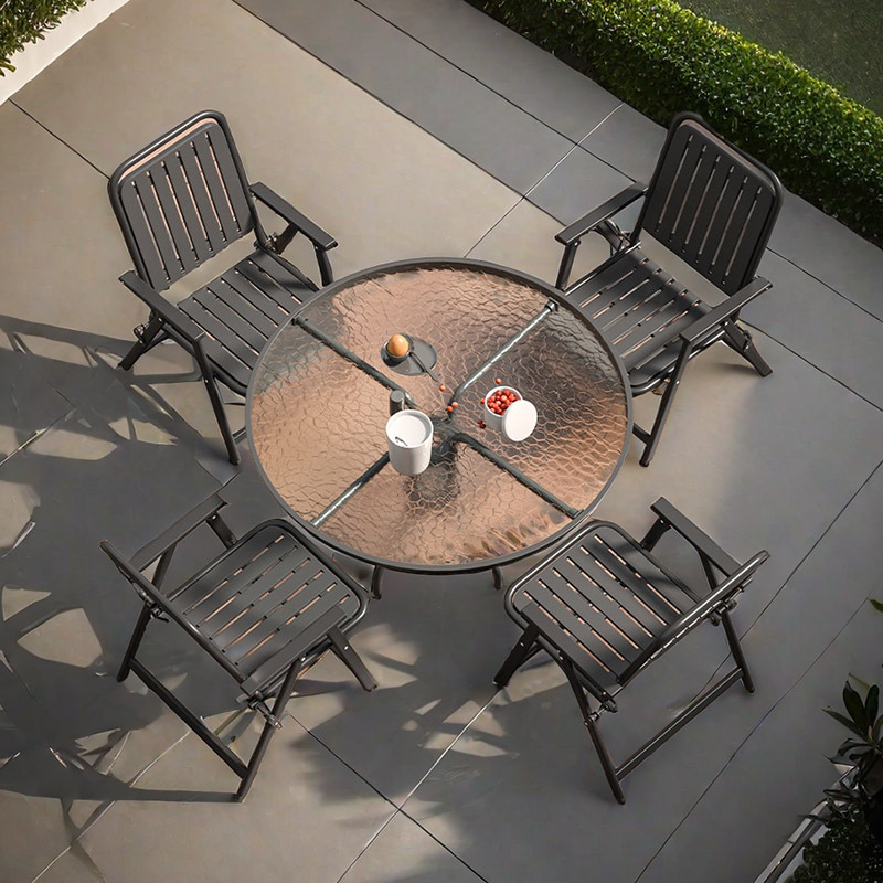 • 브라운 - 세로 패턴 접이식 의자 4개 + 105CM 물 패턴 조립 원형 테이블 두꺼운 플랫 튜브