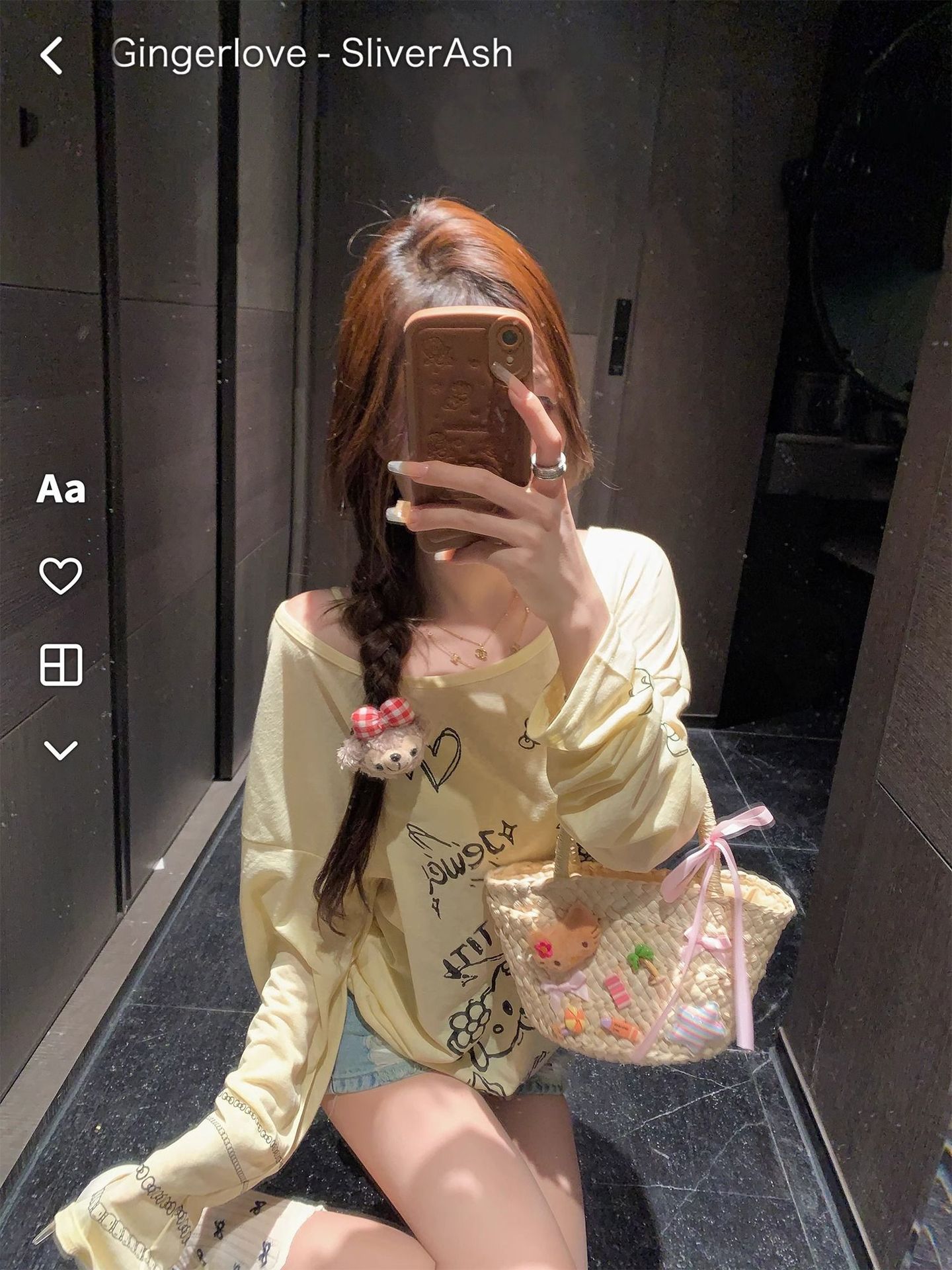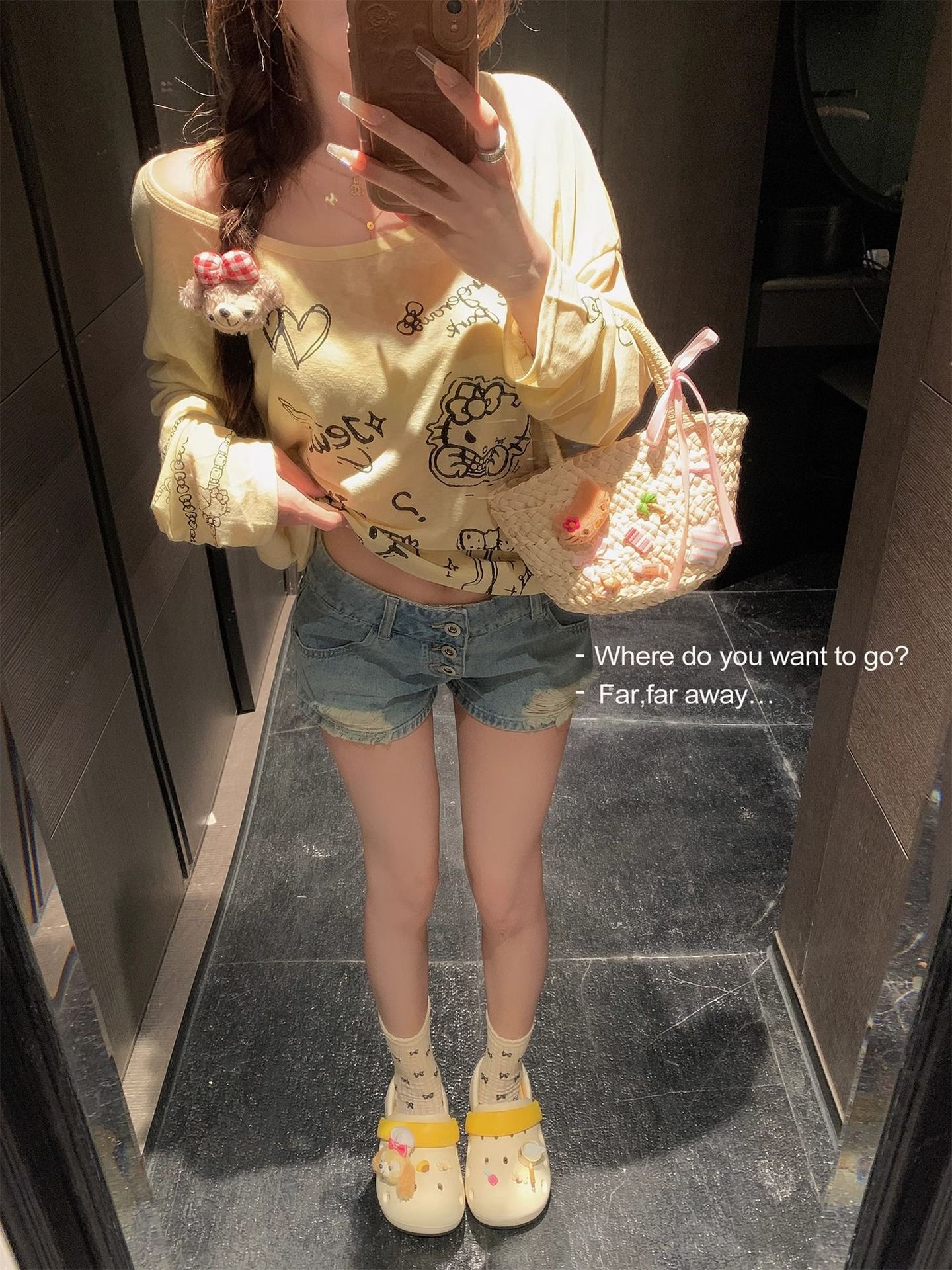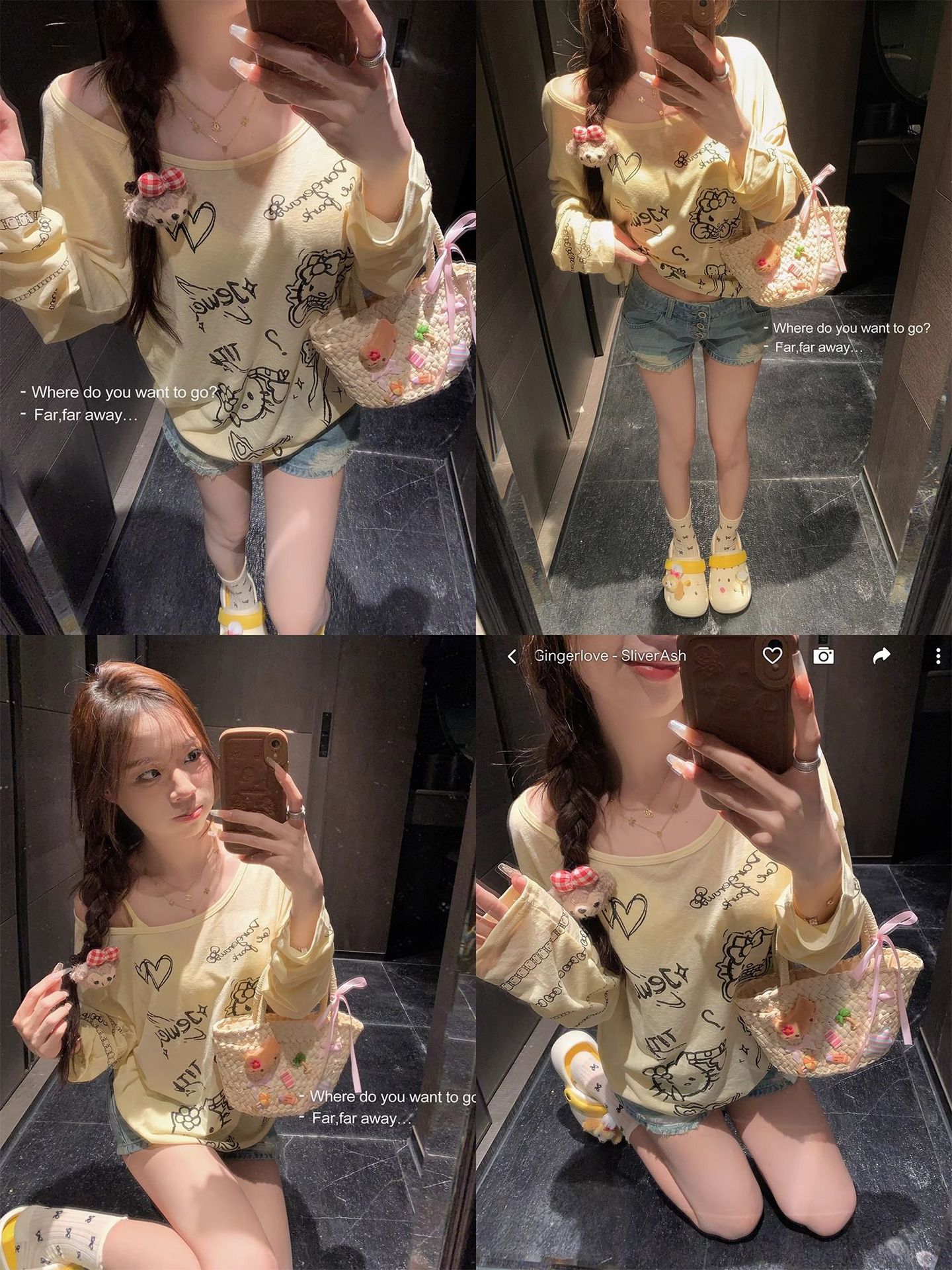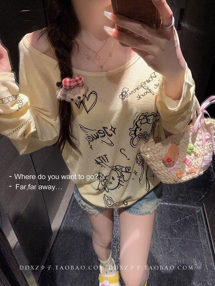 게으른 스타일 만화 인쇄 얇은 기본 셔츠 여성의 2025 가을 새로운 디자인 감각 경사 어깨 태양 보호 블라우스 탑스토어 가기
