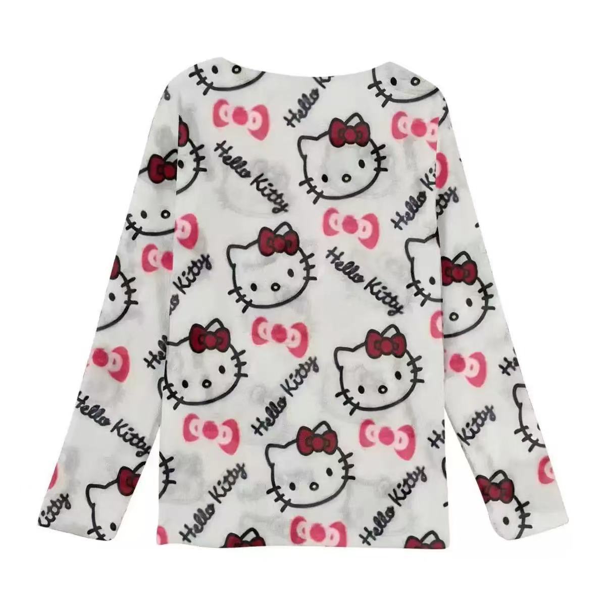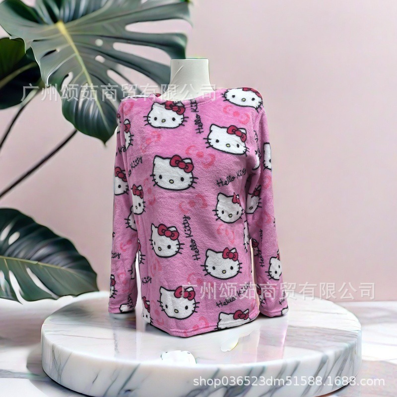 새로운 만화 KT 고양이 인쇄 긴팔 파자마 두꺼운 여성 산호 양털 가을과 겨울 홈 캐주얼 플란넬 탑 외부 착용