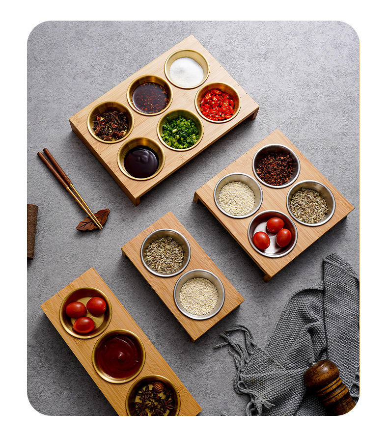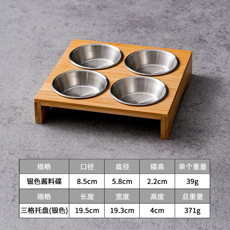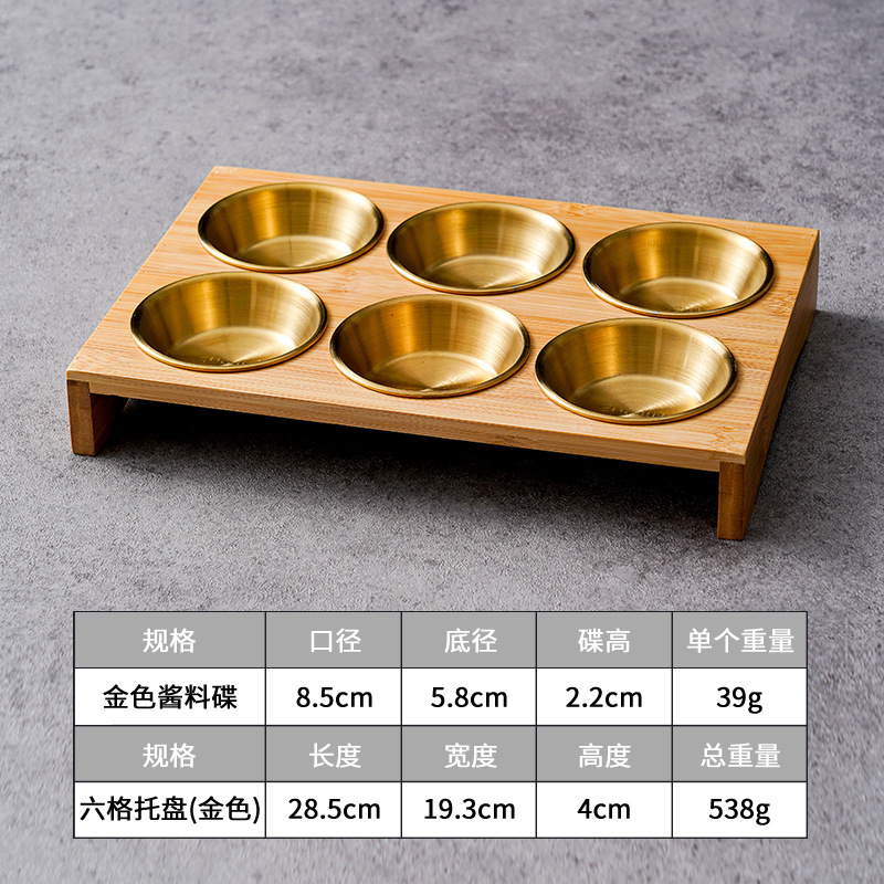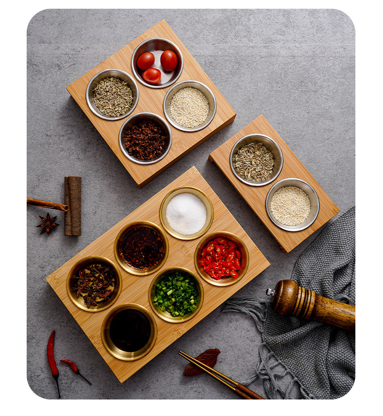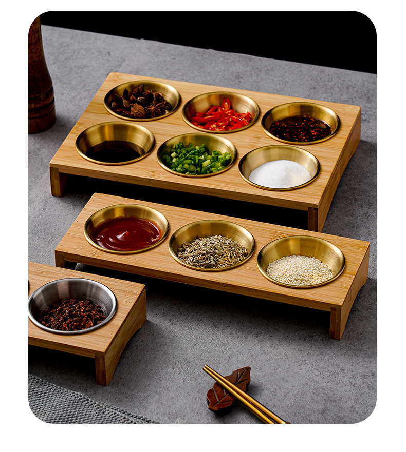 국경 간 창조적 조미료 304 스테인레스 스틸 풍미 접시 한식 바베큐 냄비 차가운 접시 칸막이와 나무 트레이 디핑 접시