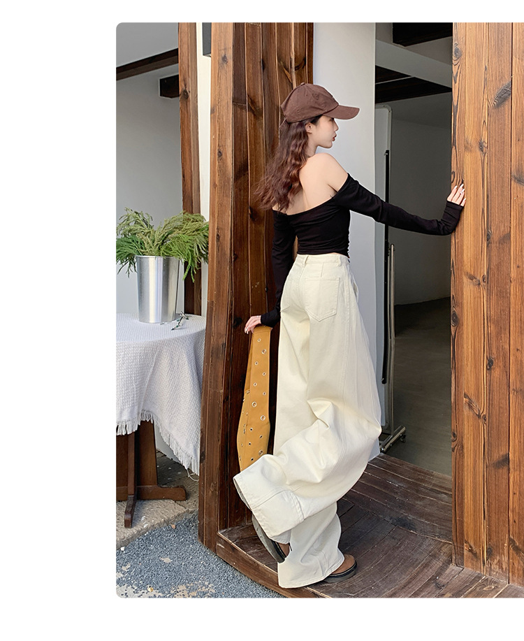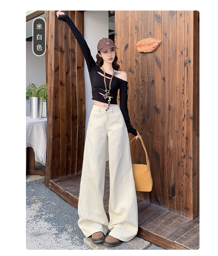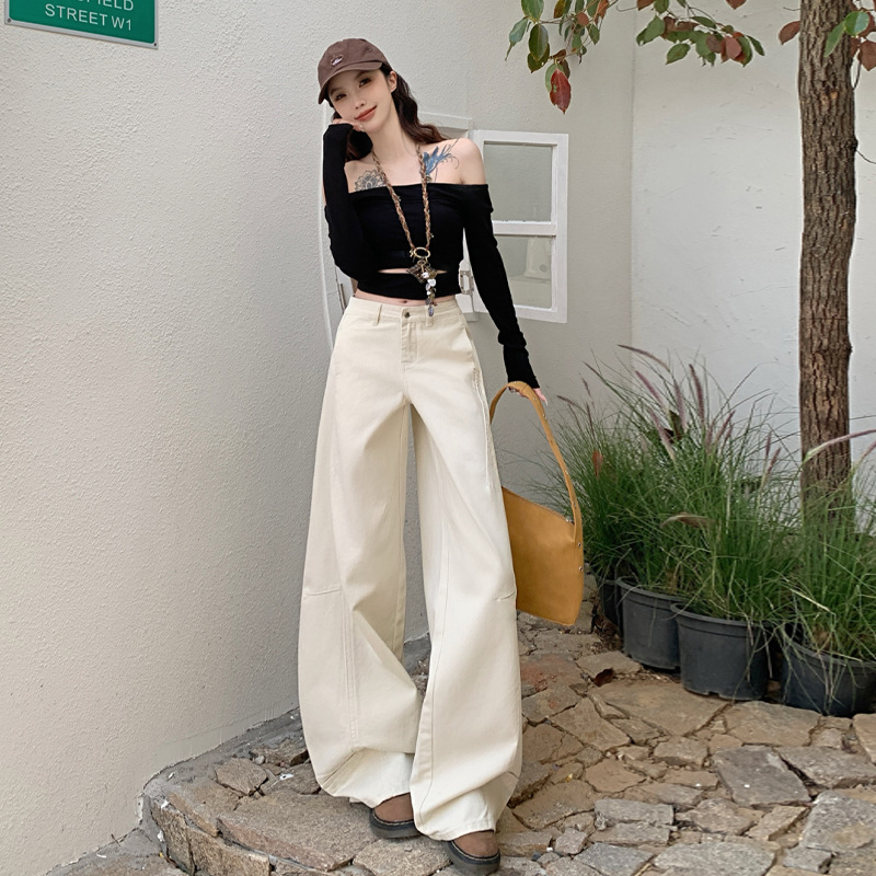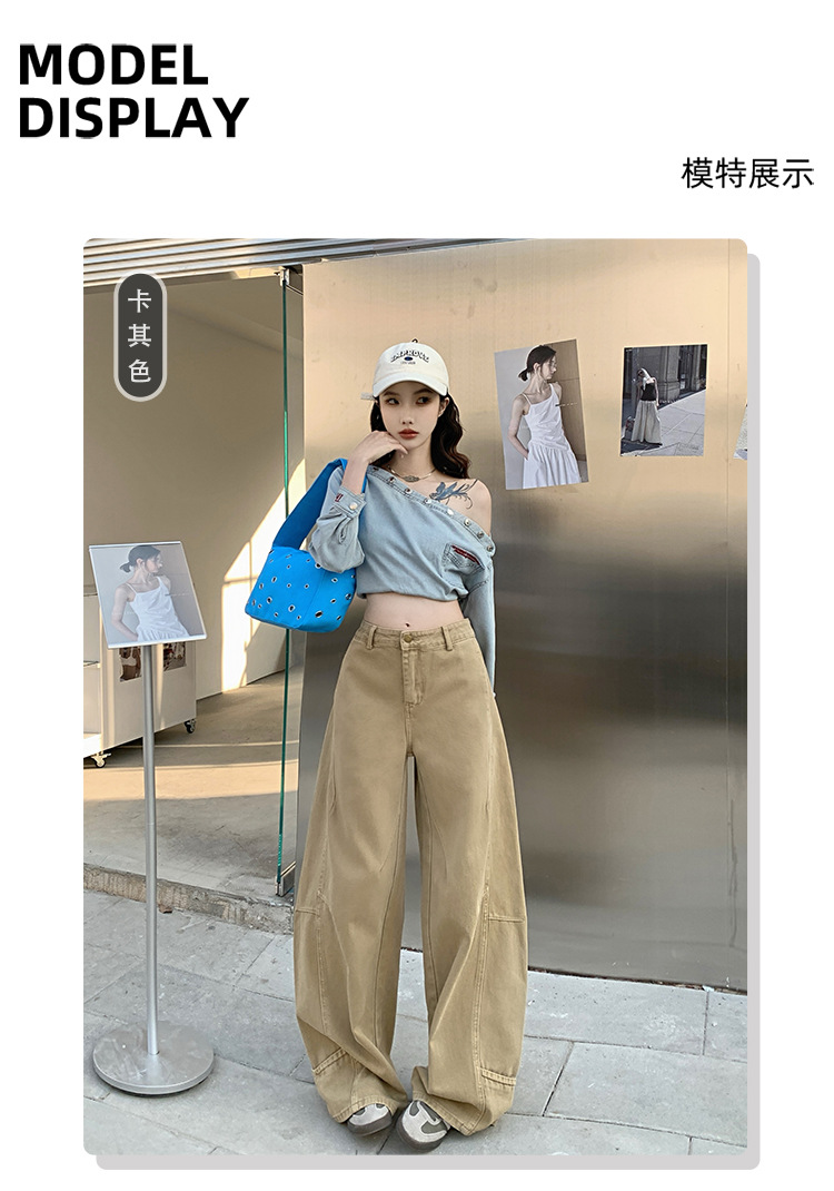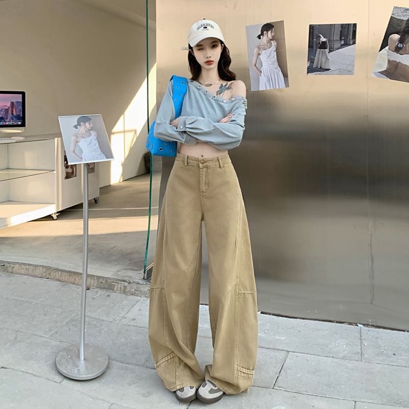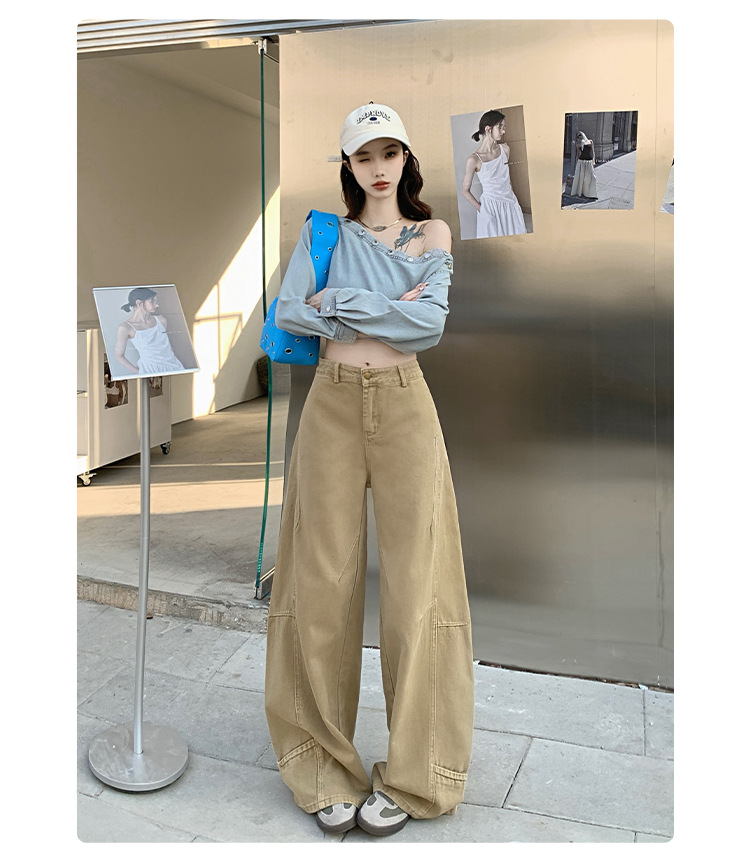 카키색 세이버 진 여성용 겨울용 기모 안감 두꺼운 레트로 스플라이싱 디자인 루즈핏 와이드 레그 카이트 팬츠 트렌디스토어 가기