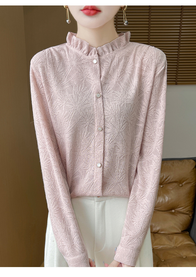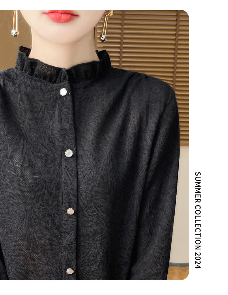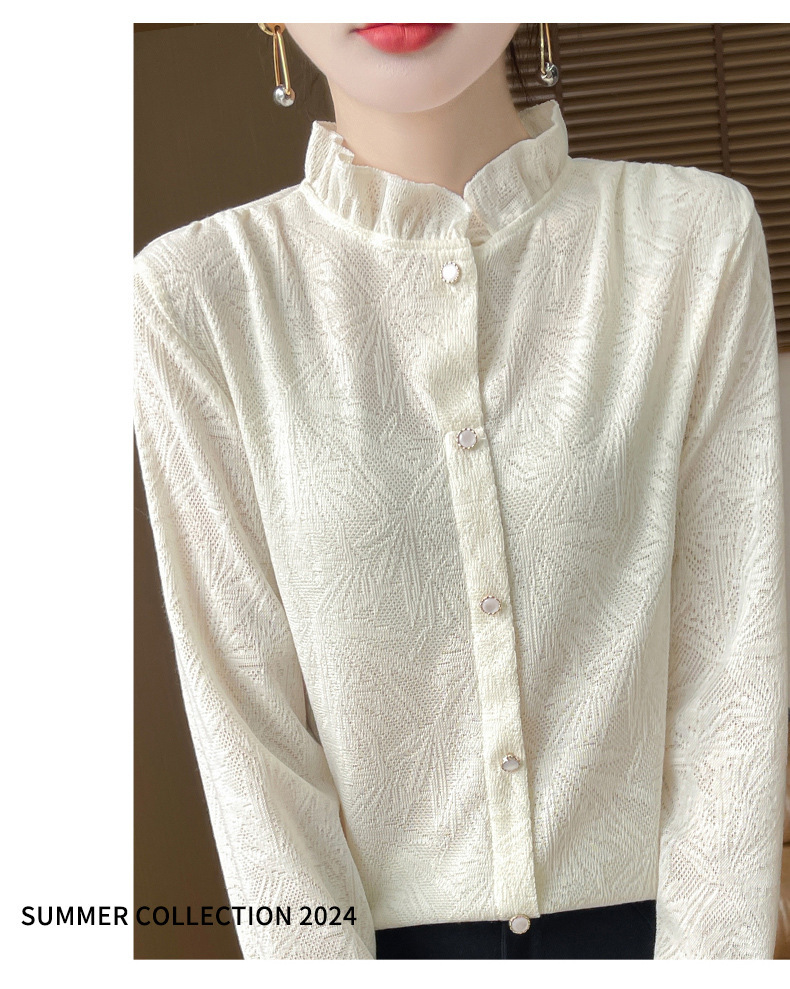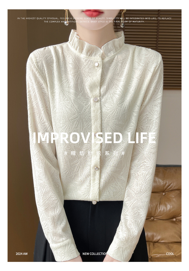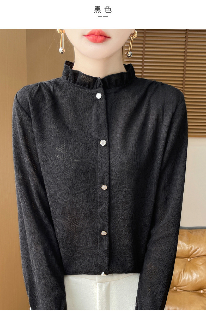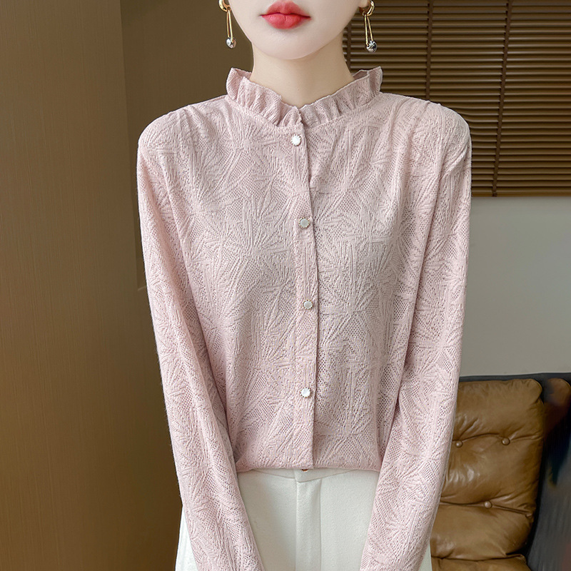 프렌치 할로우 아웃 얇은 탑 여성의 봄과 여름 어깨 우아한 우드 이어 칼라 솔리드 컬러 니트베이스 셔츠 하프 하이 칼라 셔츠