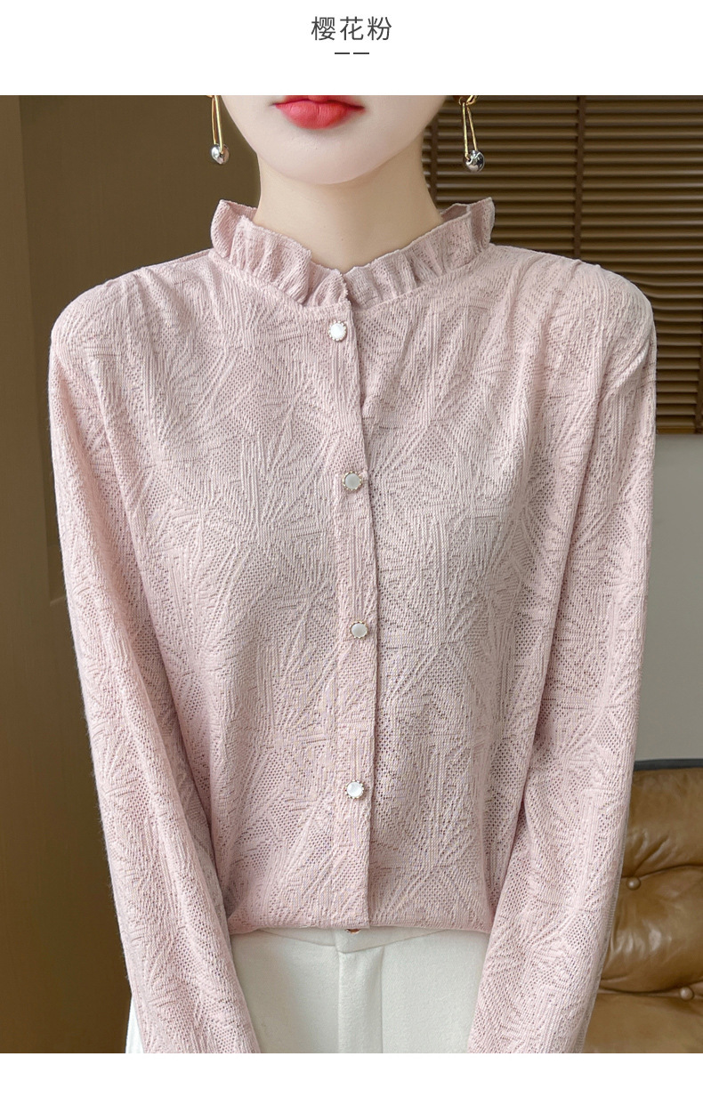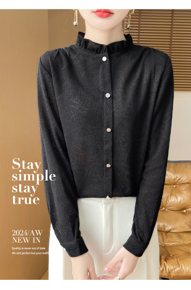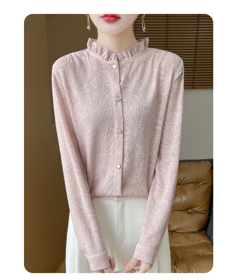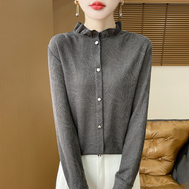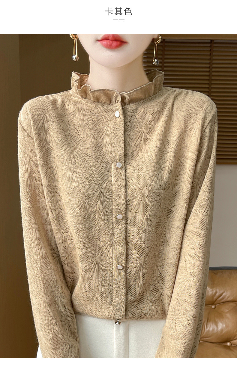 프렌치 할로우 아웃 얇은 탑 여성의 봄과 여름 어깨 우아한 우드 이어 칼라 솔리드 컬러 니트베이스 셔츠 하프 하이 칼라 셔츠