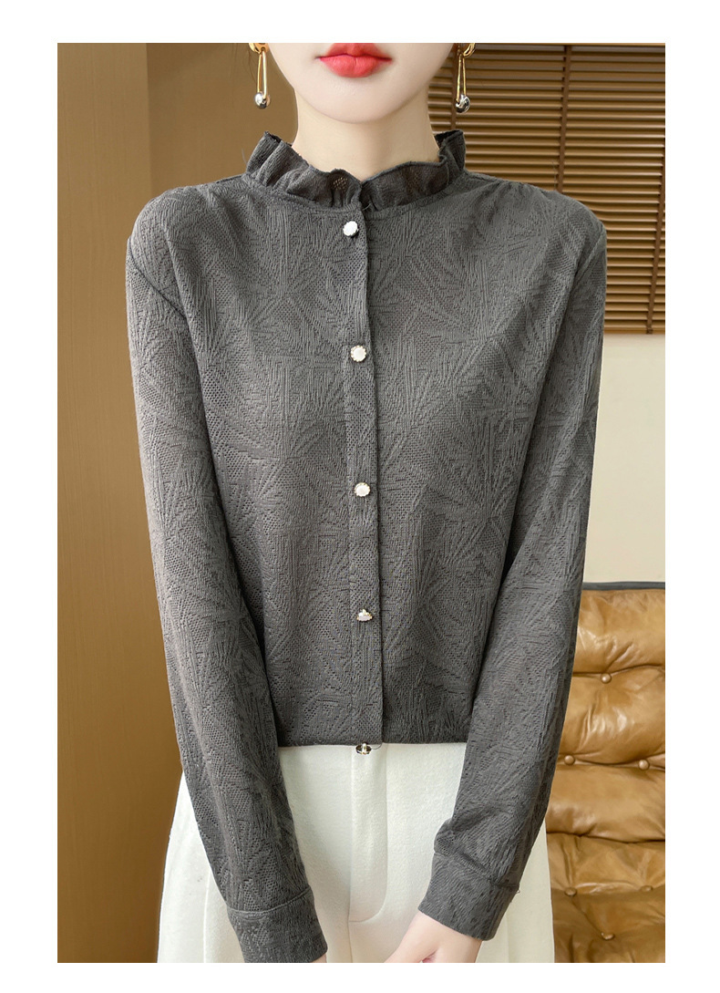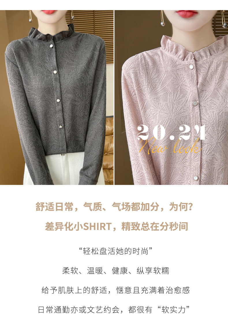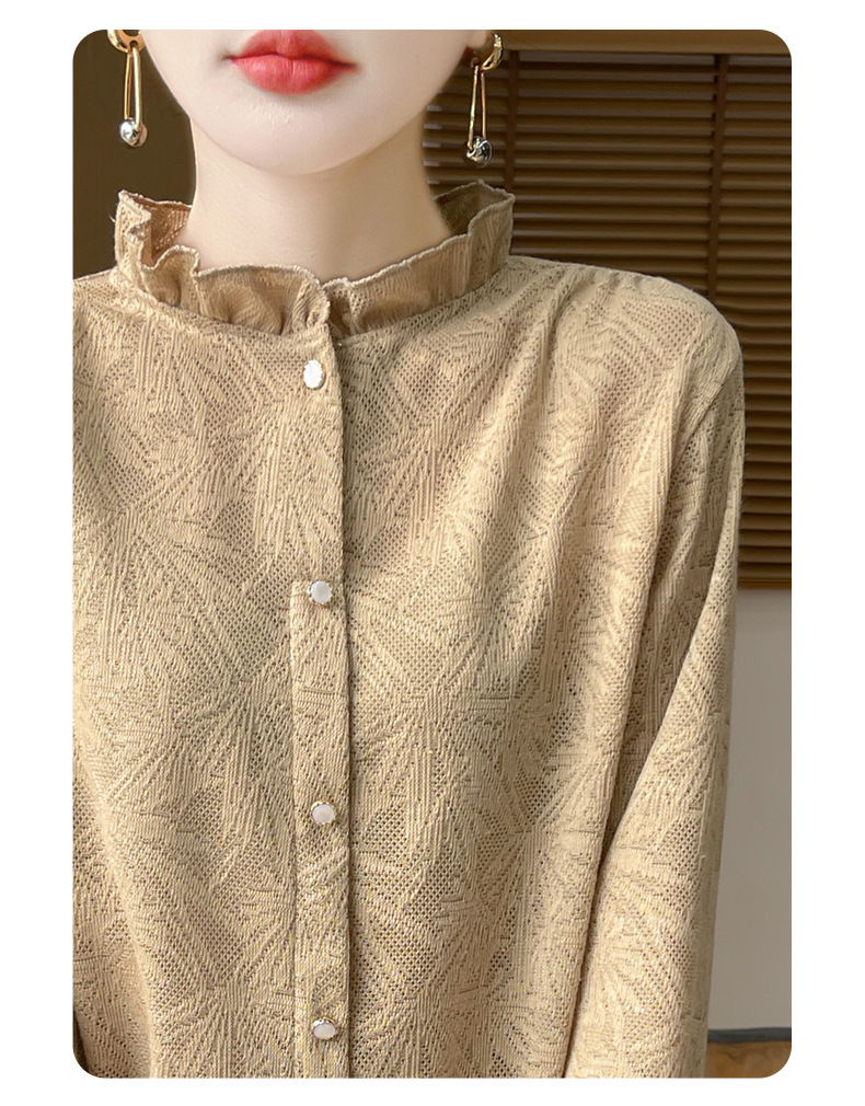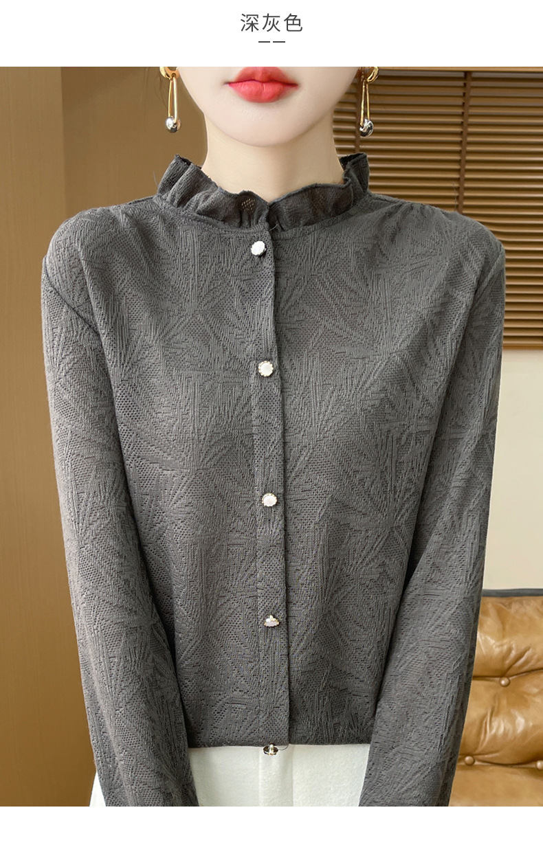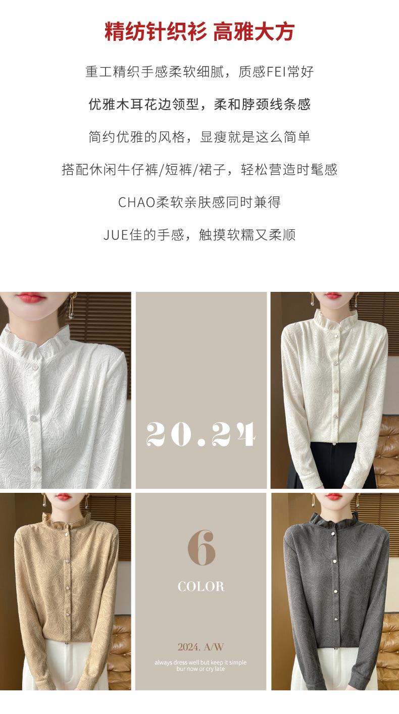 프렌치 할로우 아웃 얇은 탑 여성의 봄과 여름 어깨 우아한 우드 이어 칼라 솔리드 컬러 니트베이스 셔츠 하프 하이 칼라 셔츠