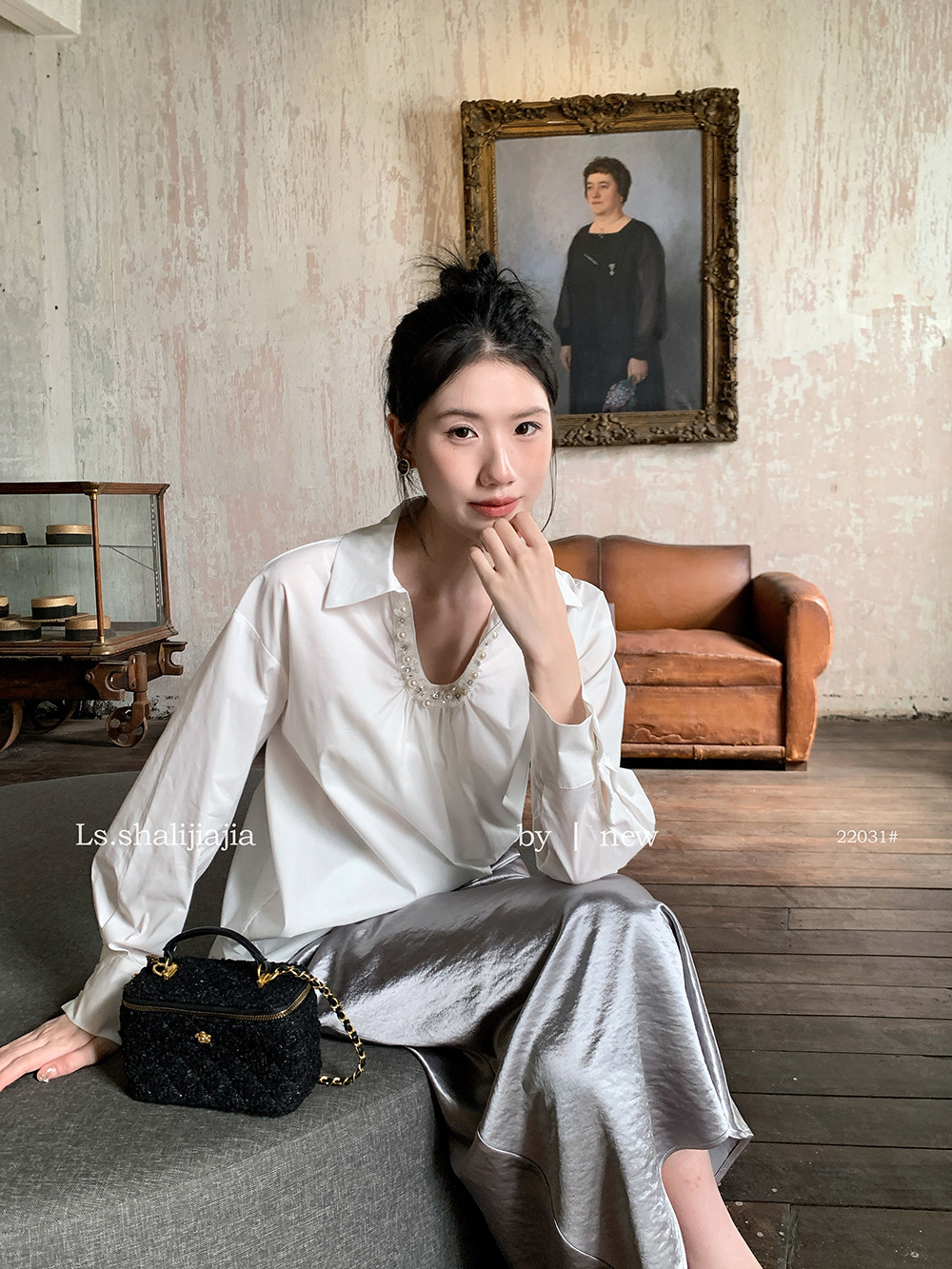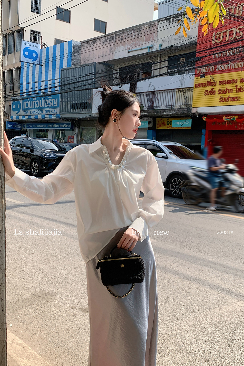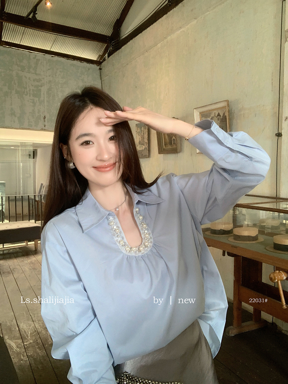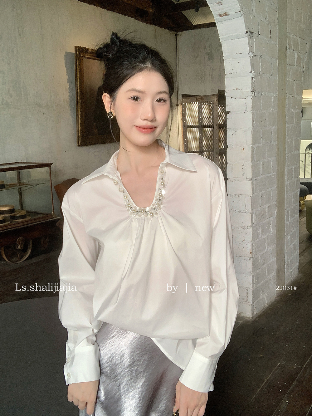 봄과 여름 2025 새로운 프랑스 스타일 절묘한 하이 엔드 우아한 U 칼라 구슬 꽃 셔츠 느슨한 간단한 패션 상단