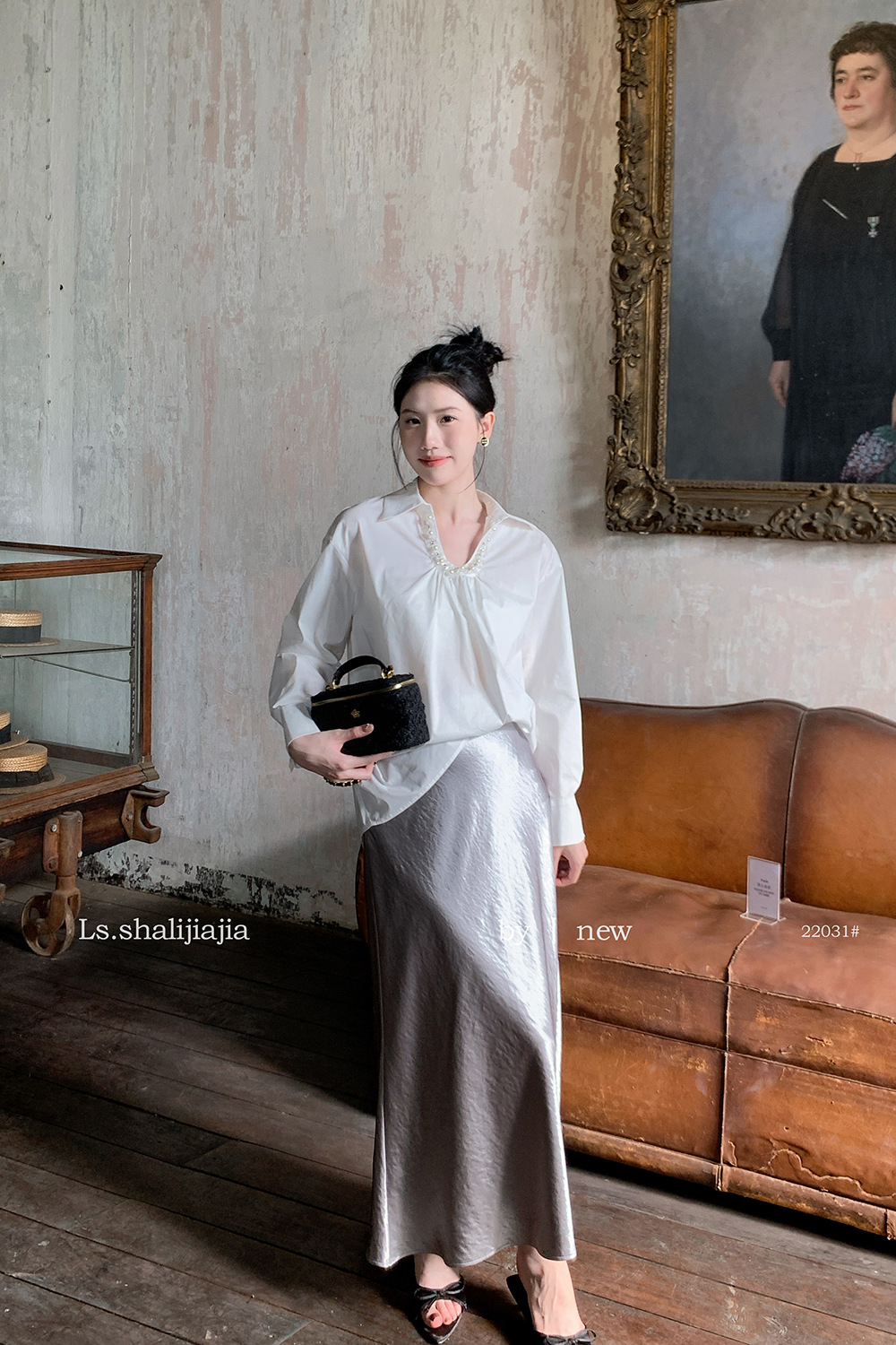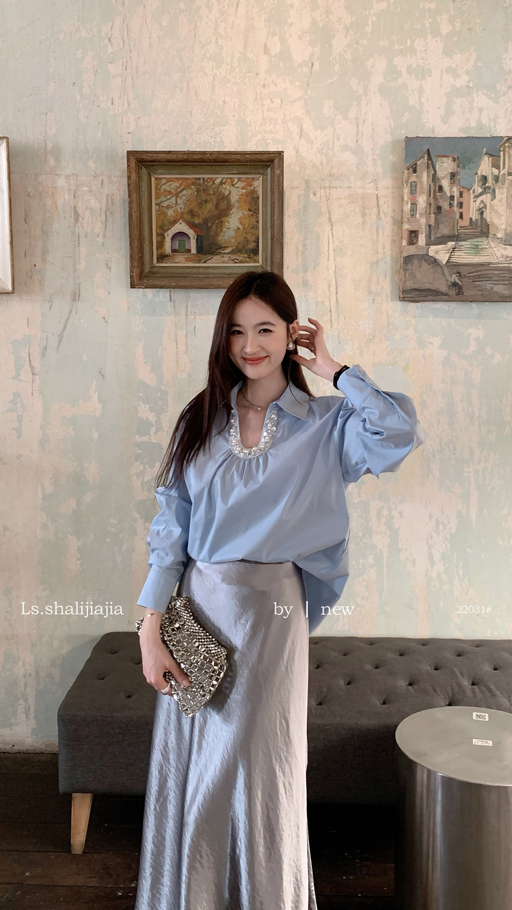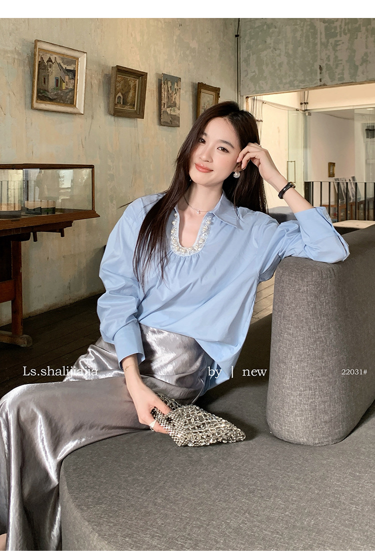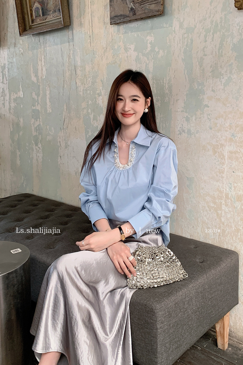 봄과 여름 2025 새로운 프랑스 스타일 절묘한 하이 엔드 우아한 U 칼라 구슬 꽃 셔츠 느슨한 간단한 패션 상단