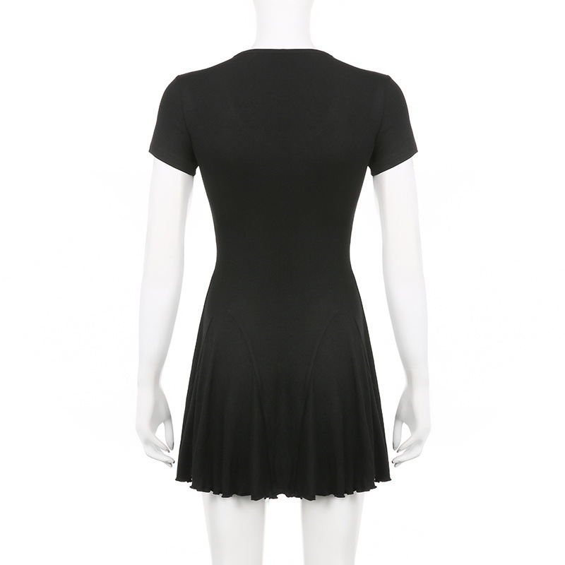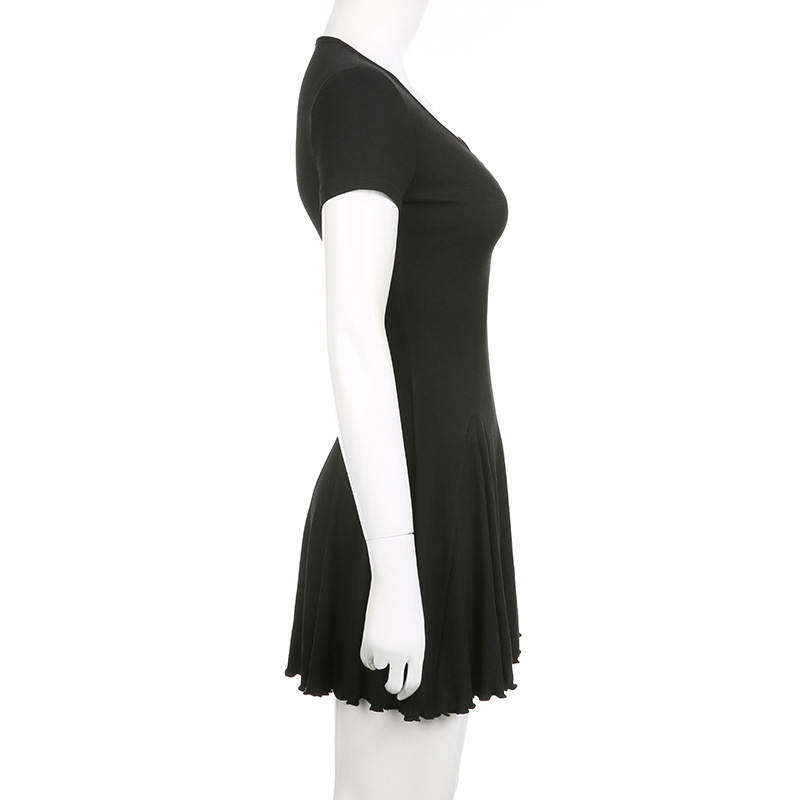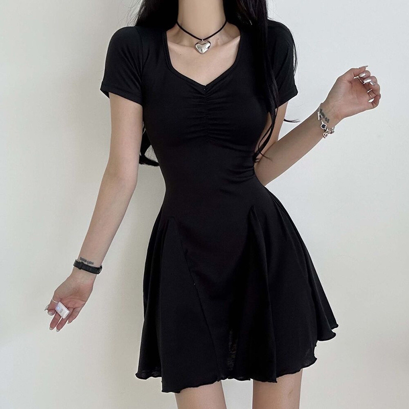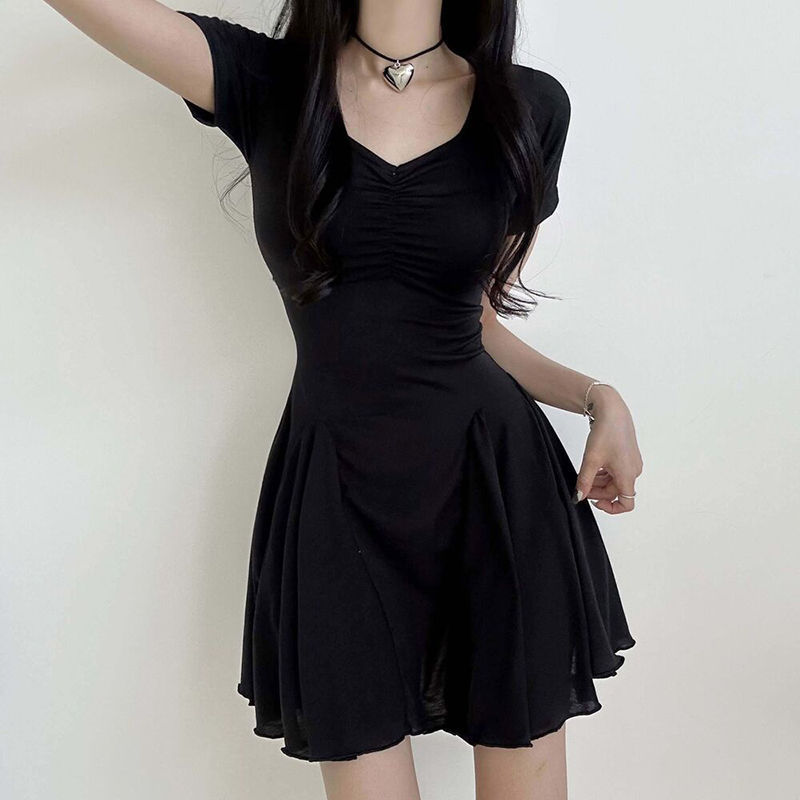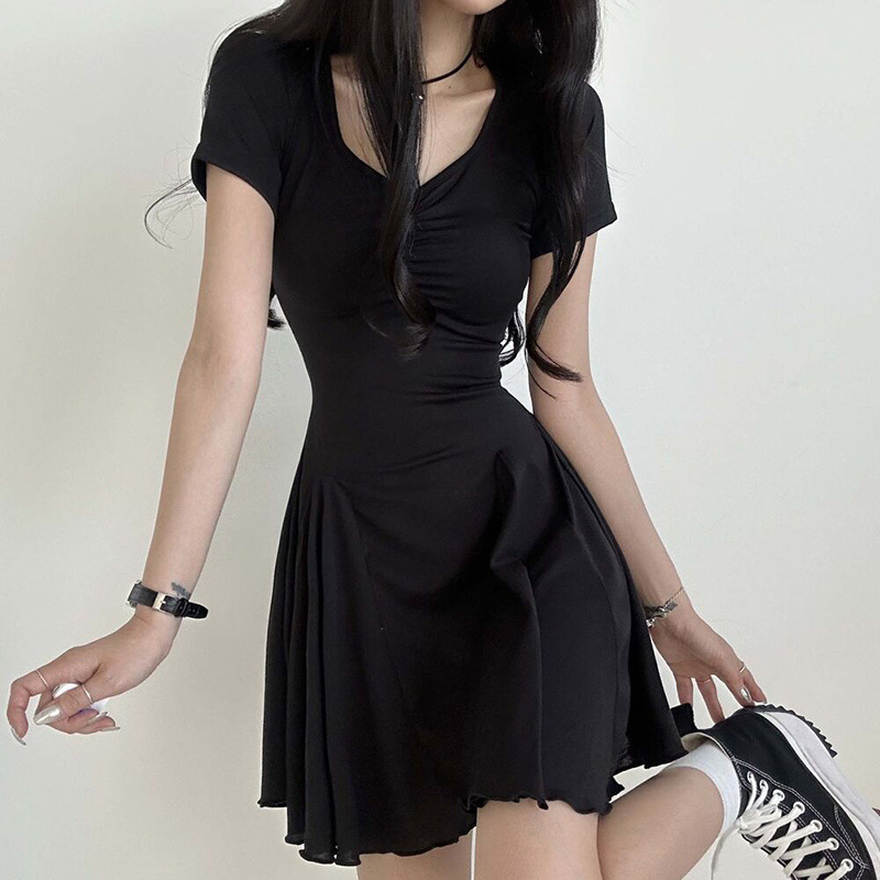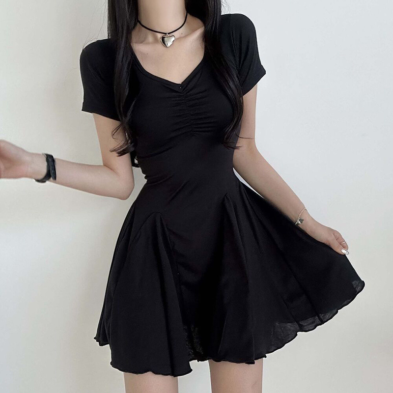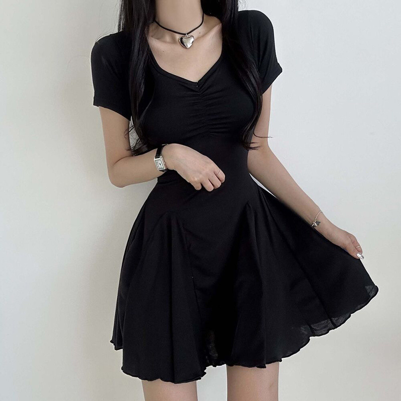프랑스 솔리드 컬러 주름 패치 워크 V 넥 우아한 우산 스커트 여성용 슬림핏 하이 엔드 쇼트 원피스스토어 가기