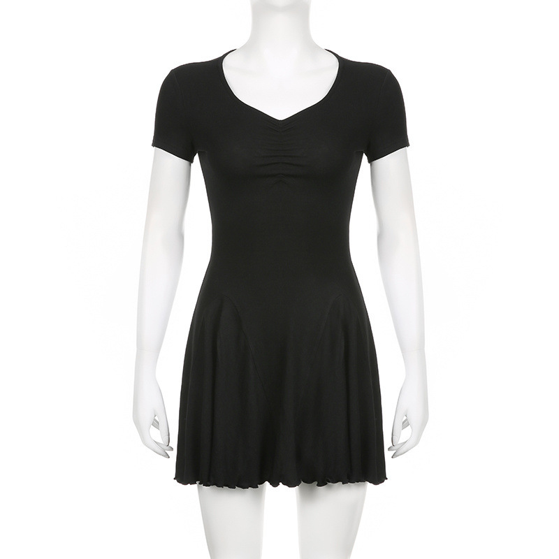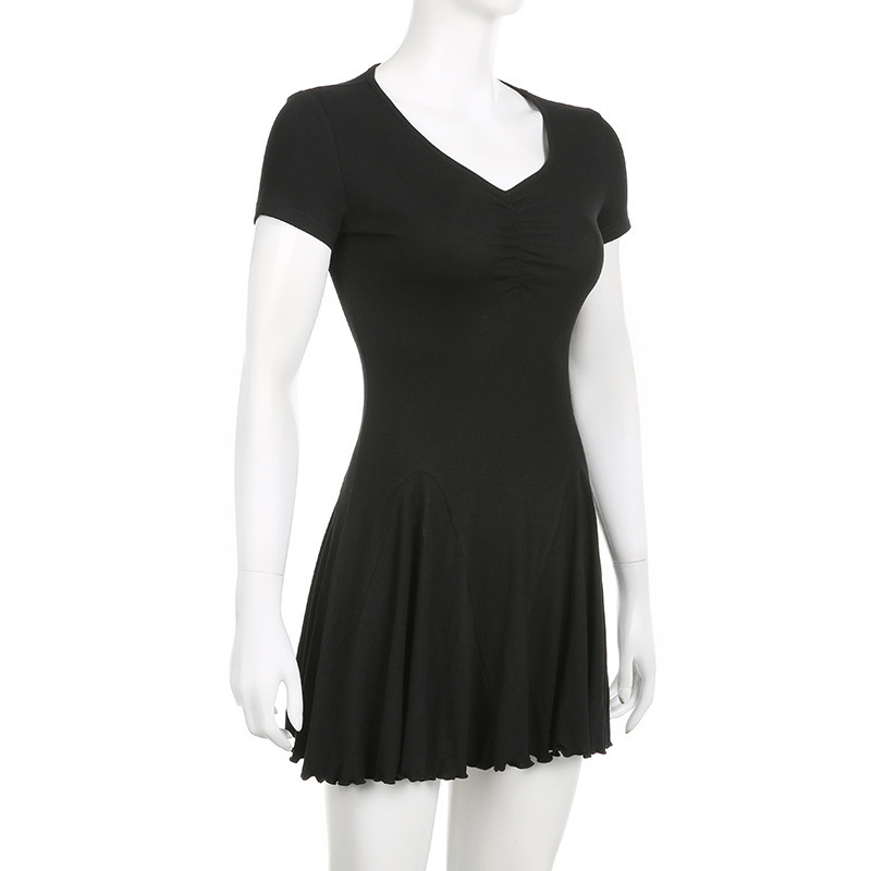 프랑스 솔리드 컬러 주름 패치 워크 V 넥 우아한 우산 스커트 여성용 슬림핏 하이 엔드 쇼트 원피스