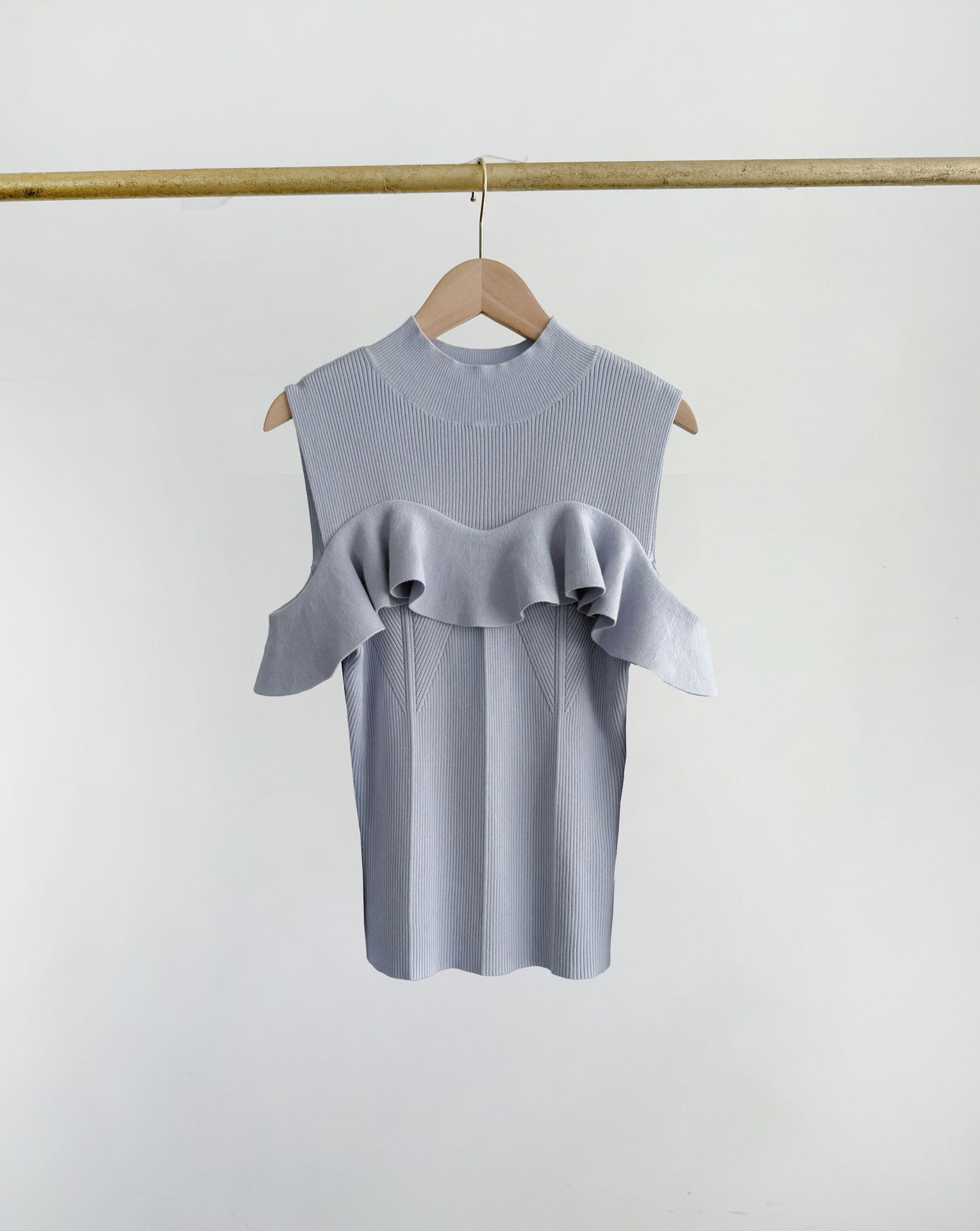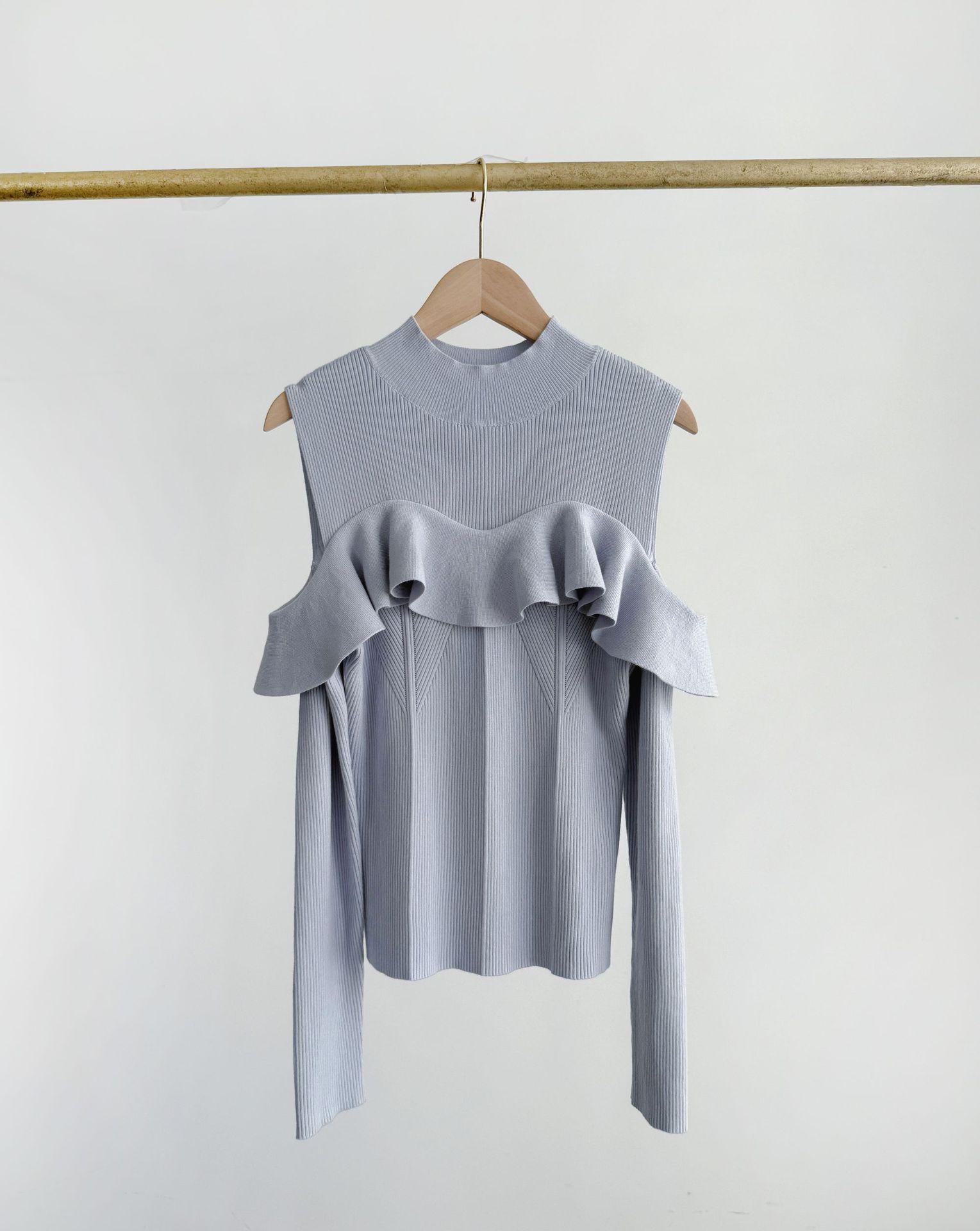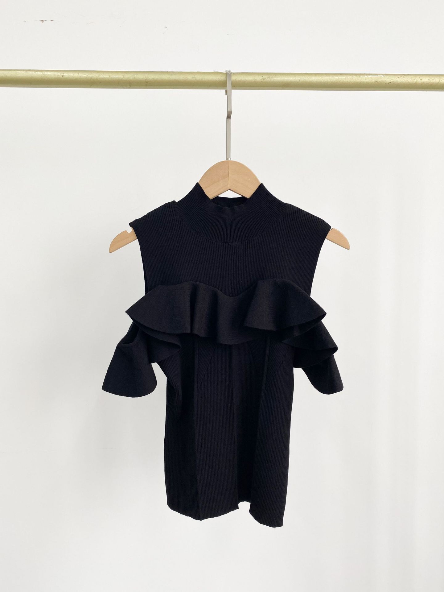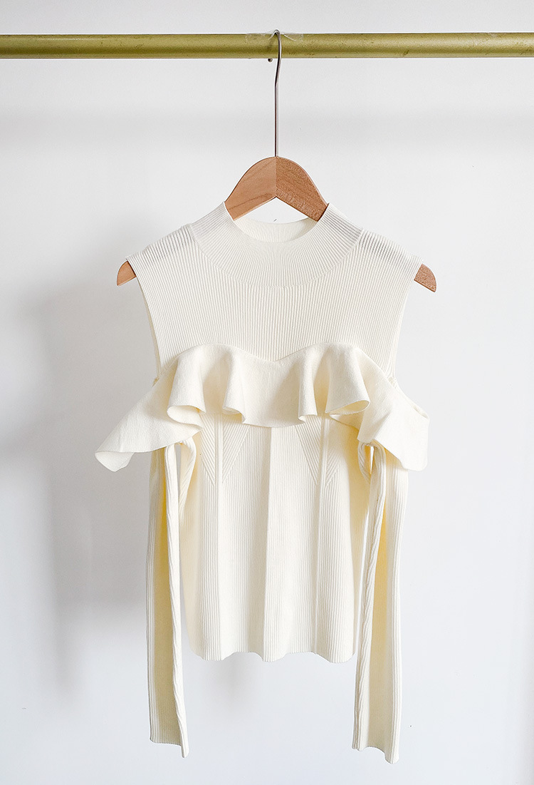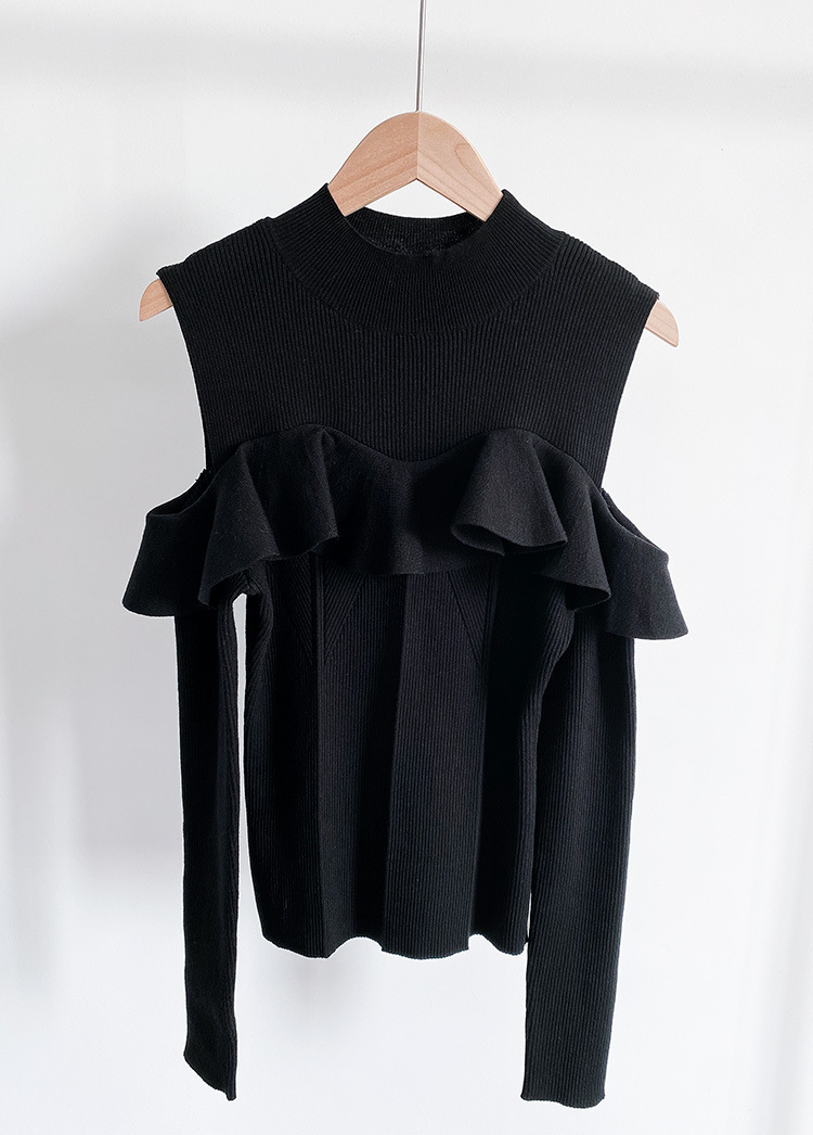 [후이 린] 국경 간 일본 봄/여름 2023 세미 하이 칼라 러플 숄더 노출 니트 스웨터 23B041/24B125스토어 가기