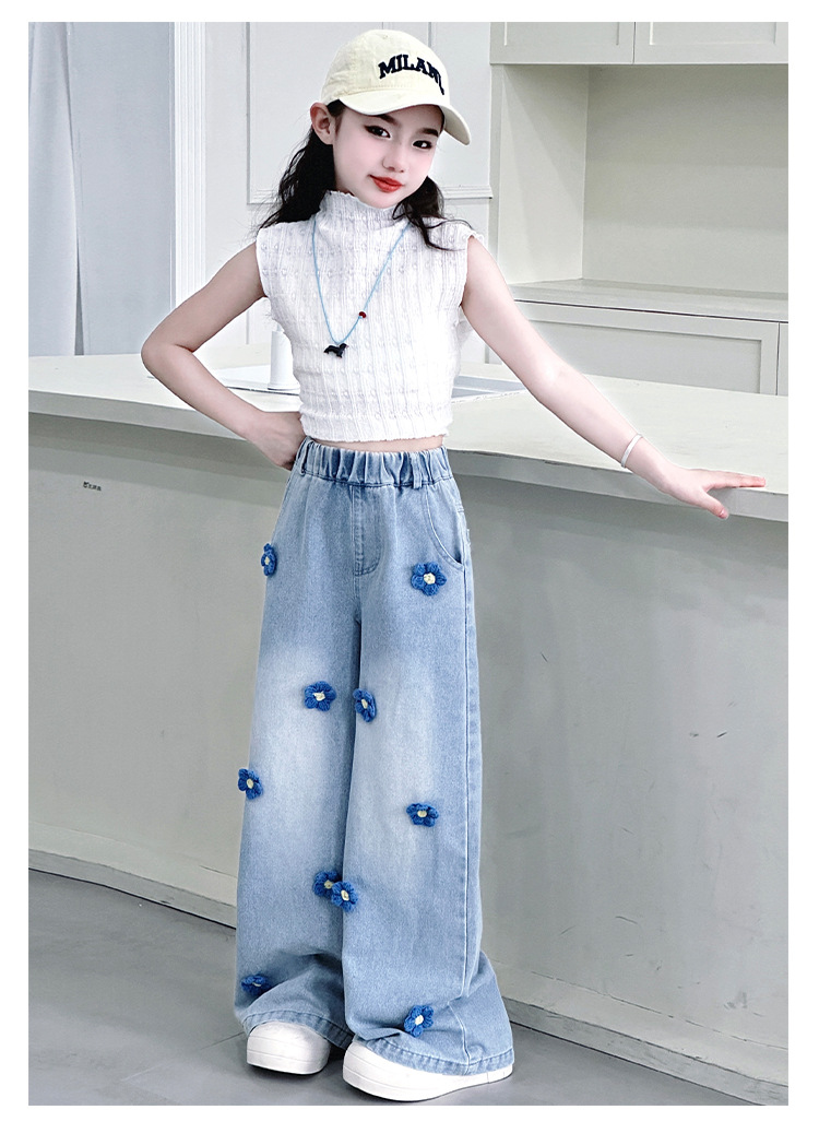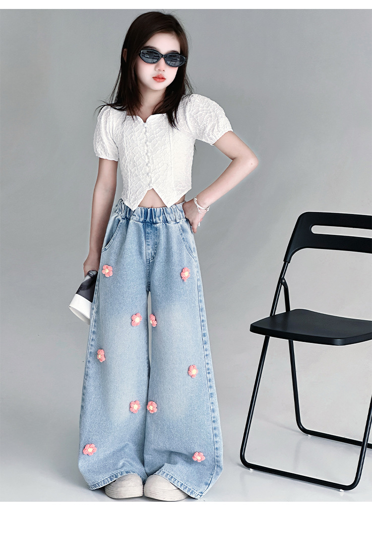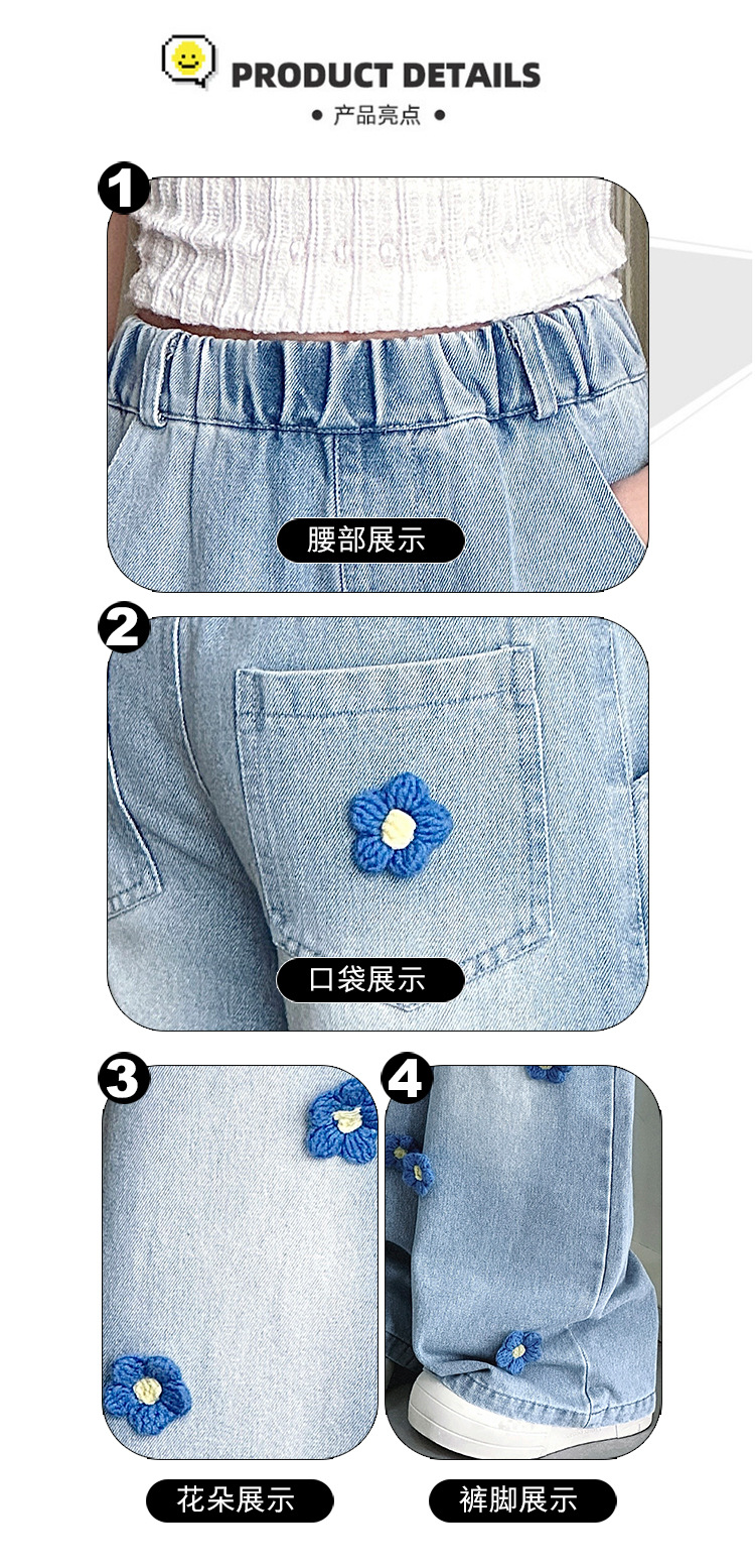 소녀 꽃 데님 바지 2025 봄 새로운 한국 스타일 중대형 어린이 입체 꽃 넓은 다리 바지 유행스토어 가기