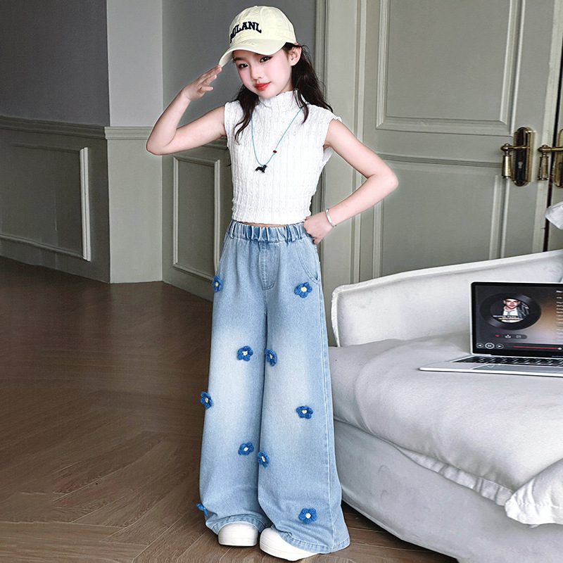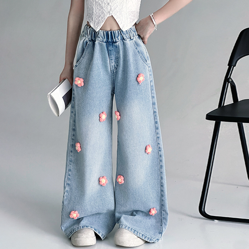 소녀 꽃 데님 바지 2025 봄 새로운 한국 스타일 중대형 어린이 입체 꽃 넓은 다리 바지 유행