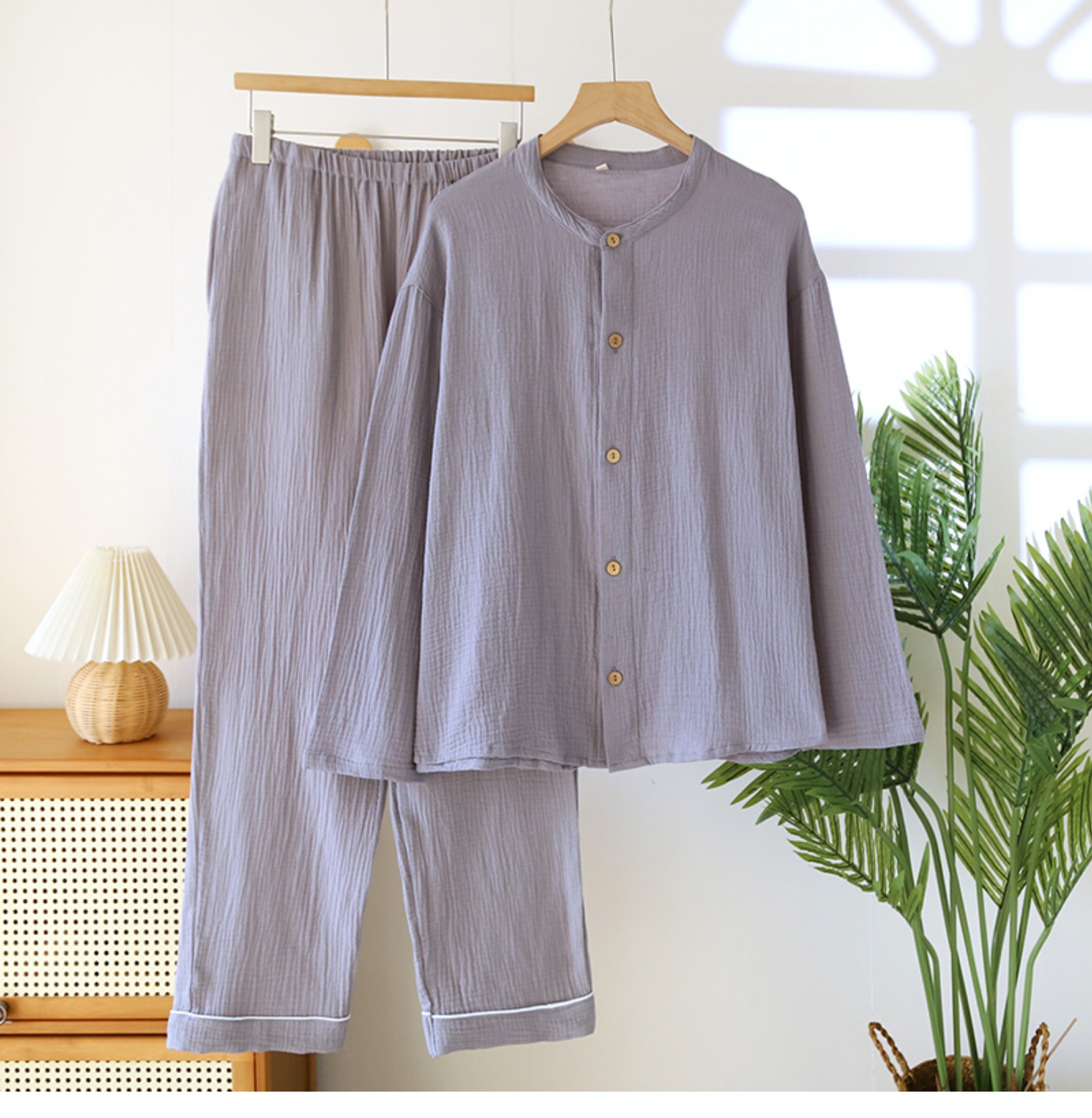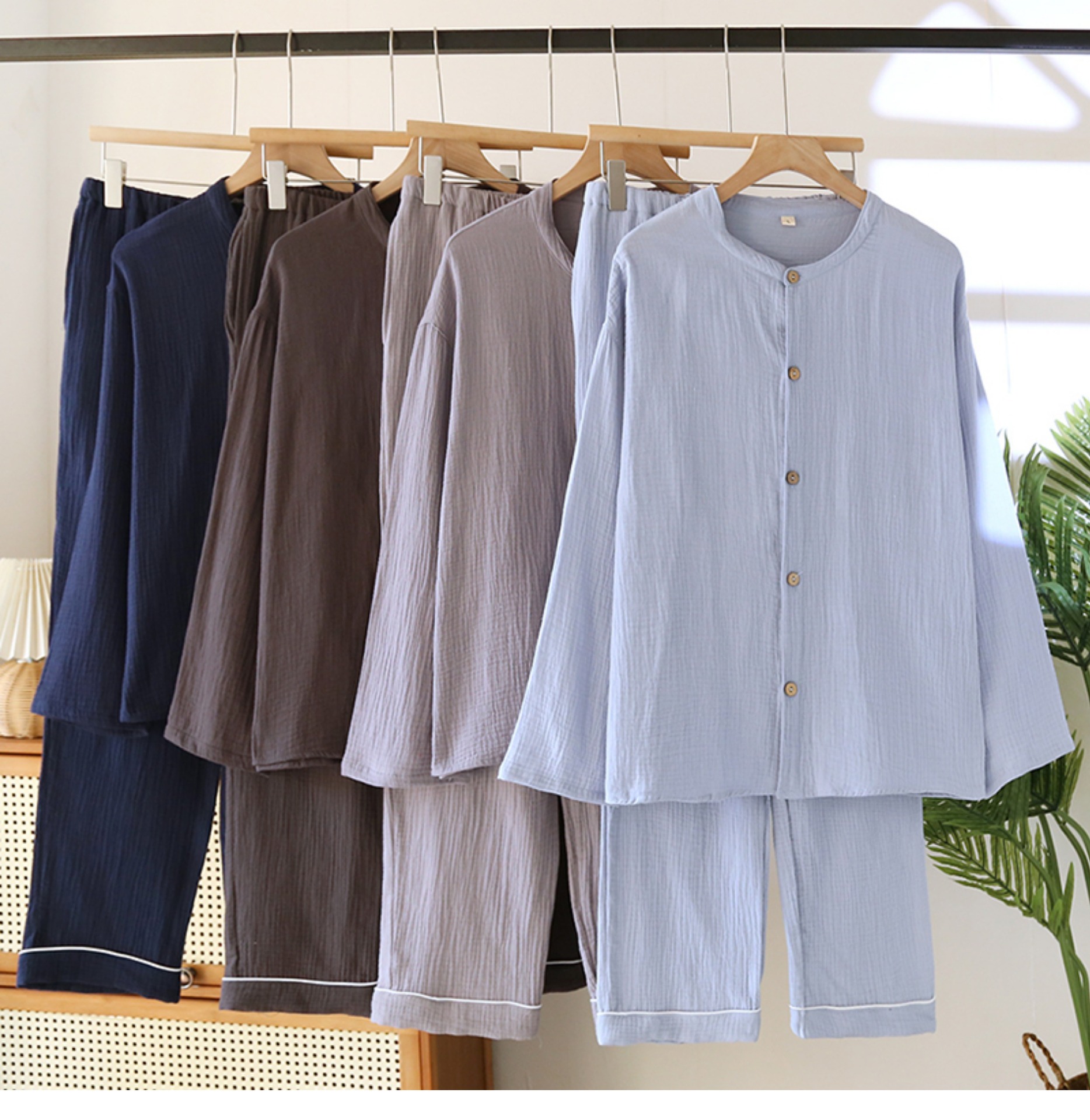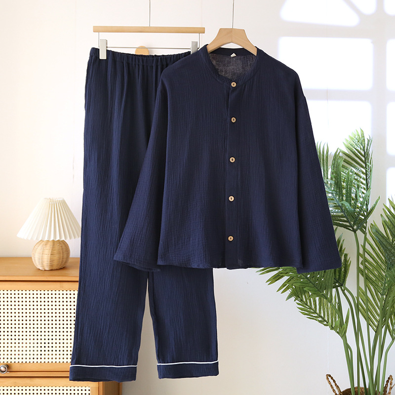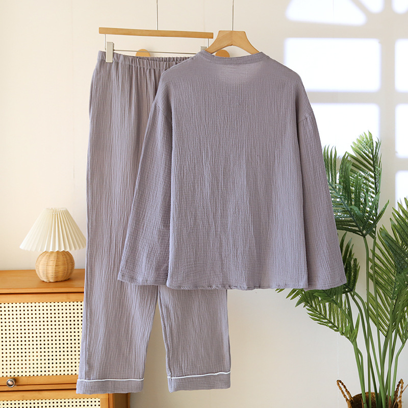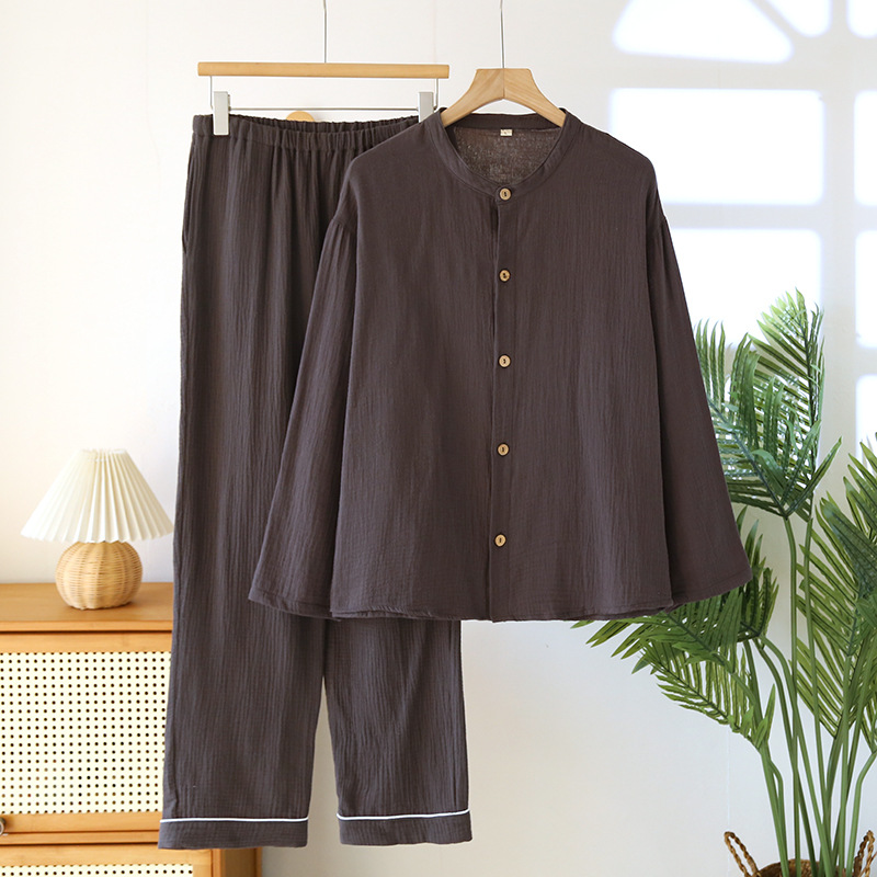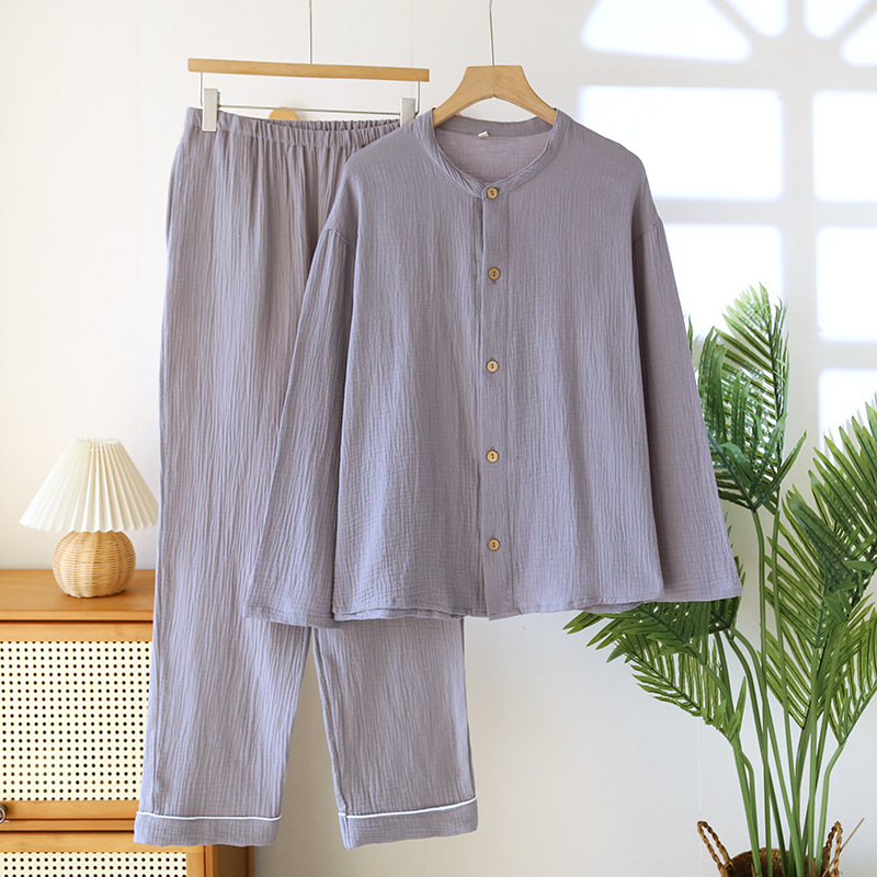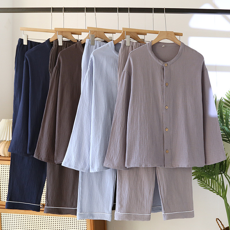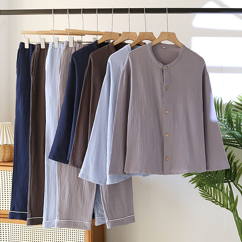 일본 남성 순면 잠옷 더블 레이어 거즈 크루 넥 긴팔 카디건 홈 의류 세트 봄 여름 가을 간단한 느슨한스토어 가기