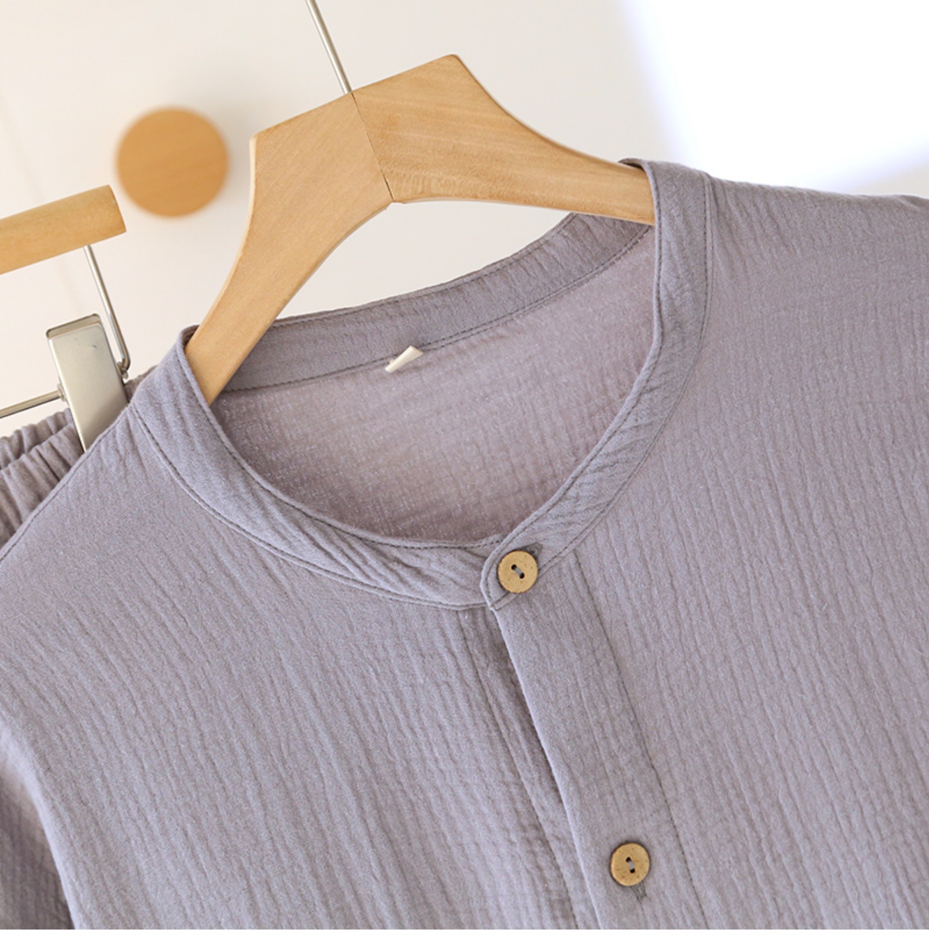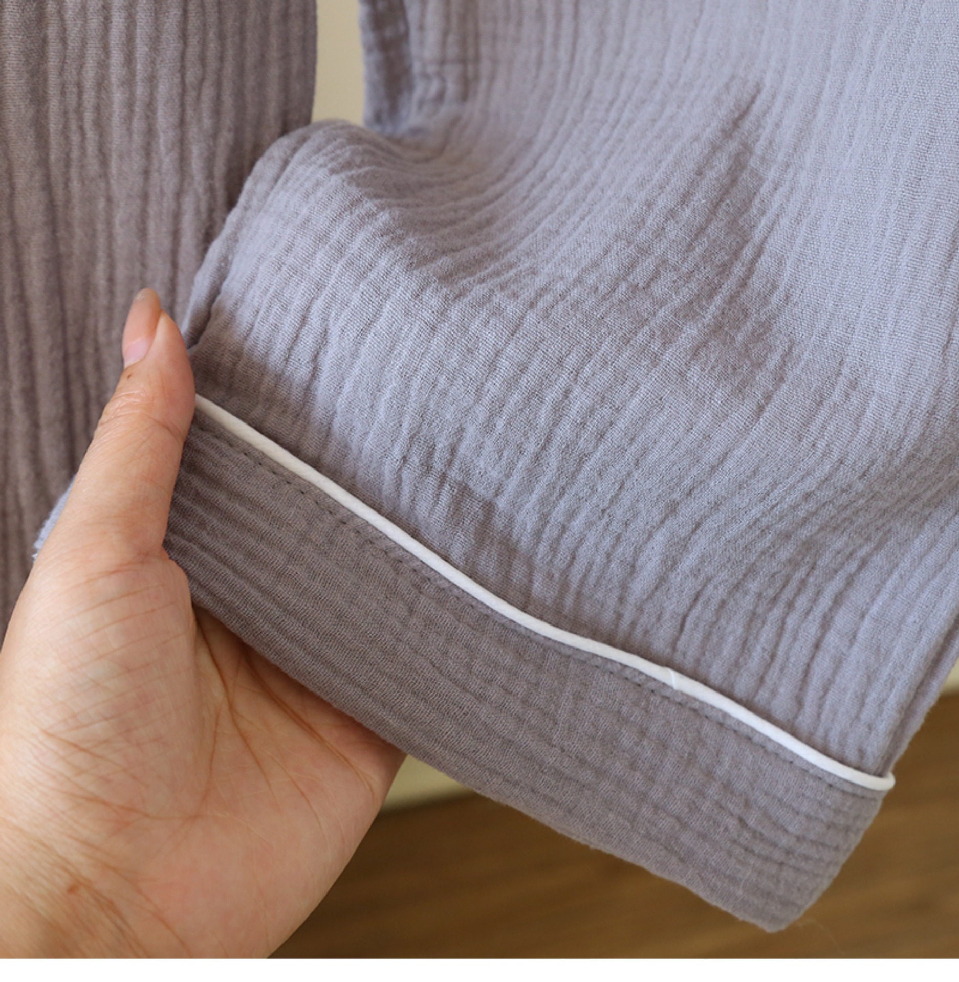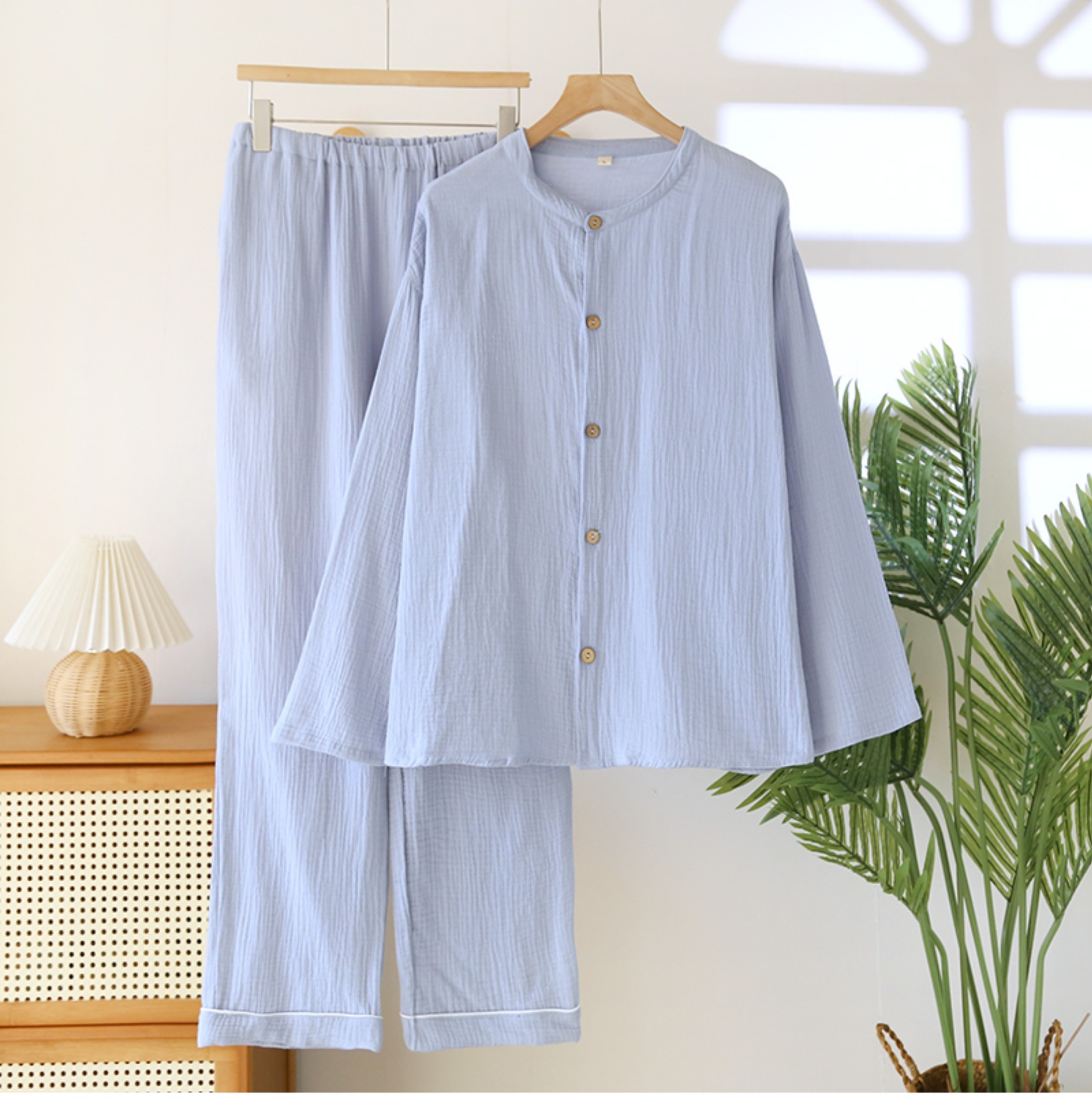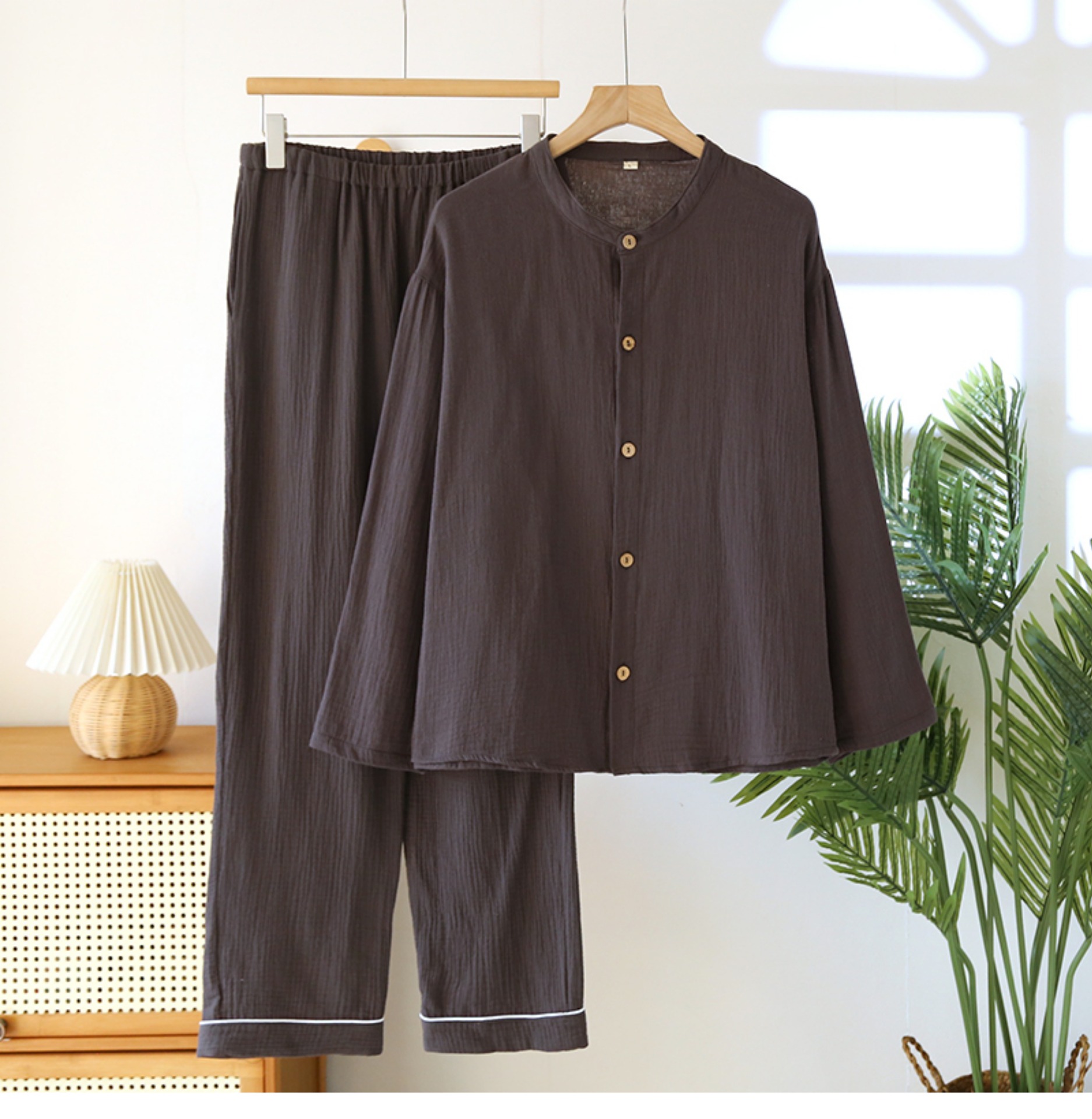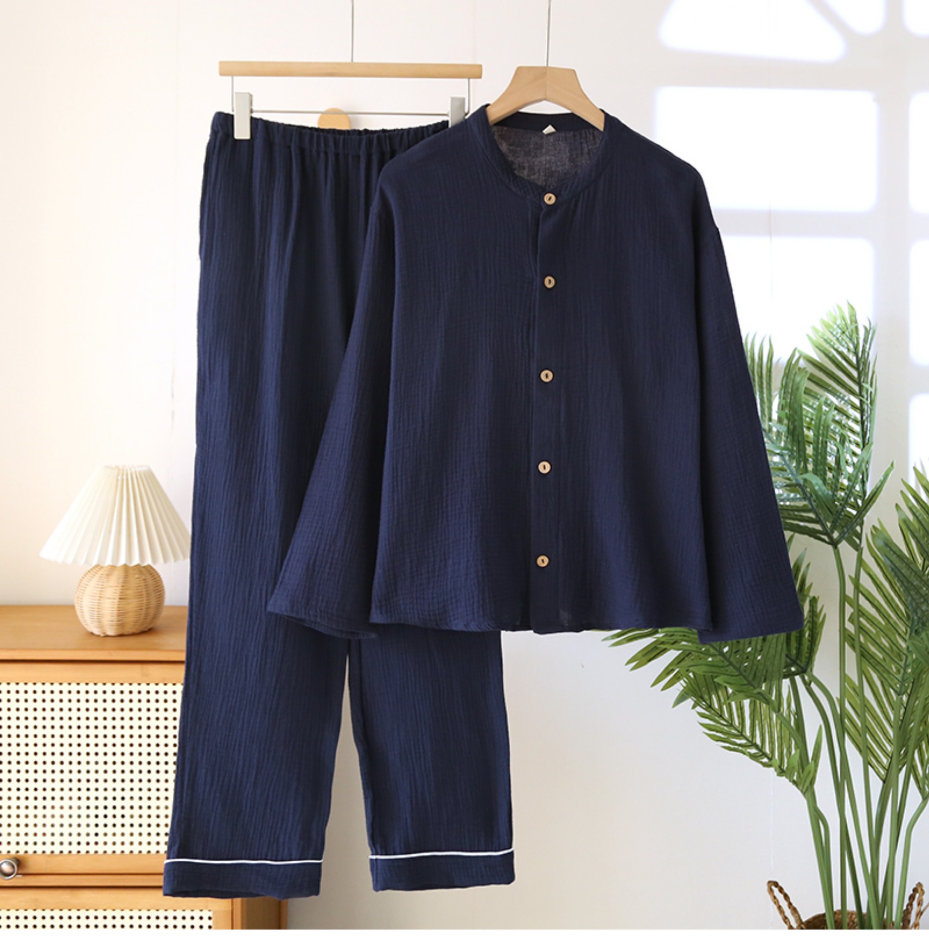 일본 남성 순면 잠옷 더블 레이어 거즈 크루 넥 긴팔 카디건 홈 의류 세트 봄 여름 가을 간단한 느슨한스토어 가기