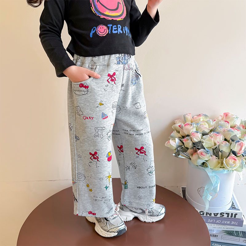 소녀의 봄 만화 운동복 2025 새로운 아동복 바지 한국 스타일 서양식 낙서 인쇄 바지 스트레이트 다리 바지스토어 가기
