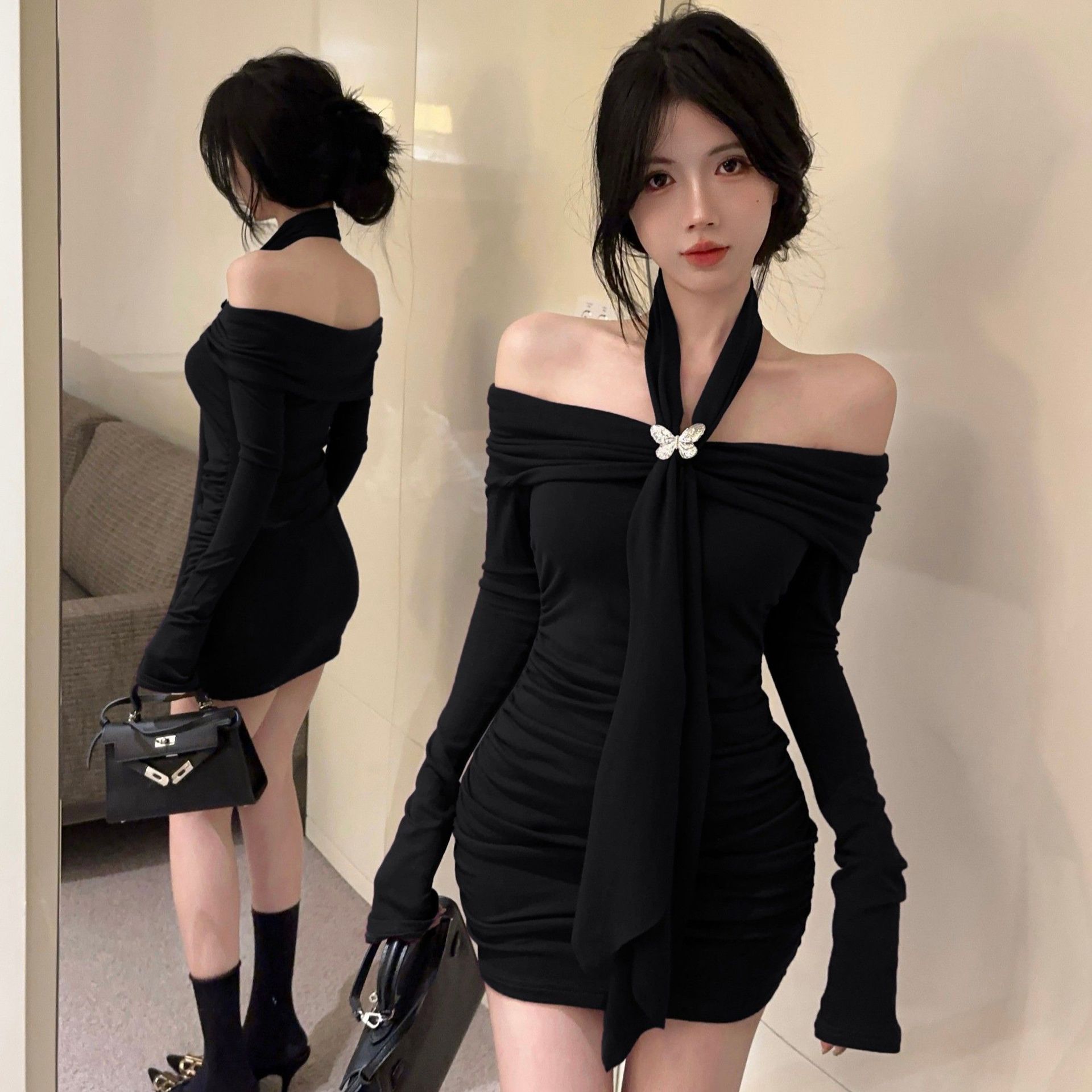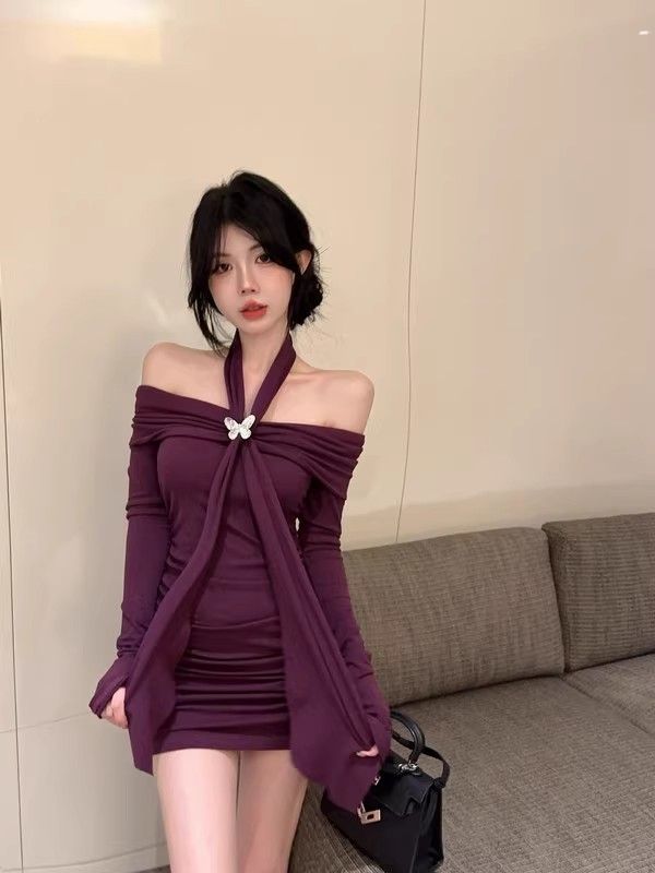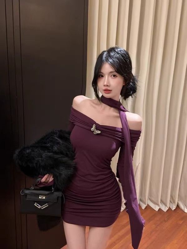 오프 숄더 보라색 목 긴 소매 원피스 여성의 가을 슬림 허리 스커트 순수한 바람 꽉 엉덩이 치마