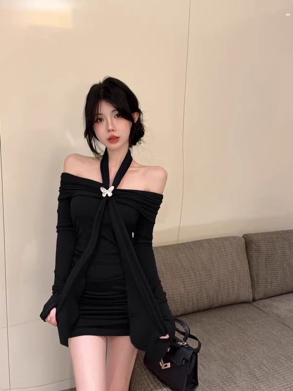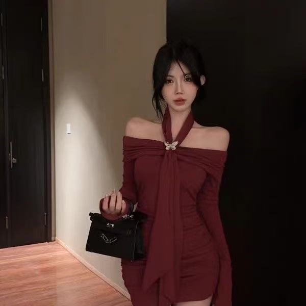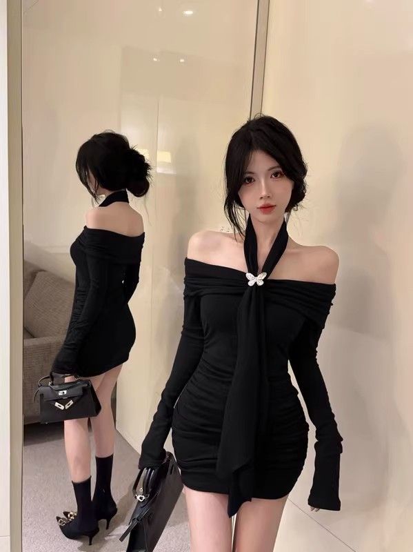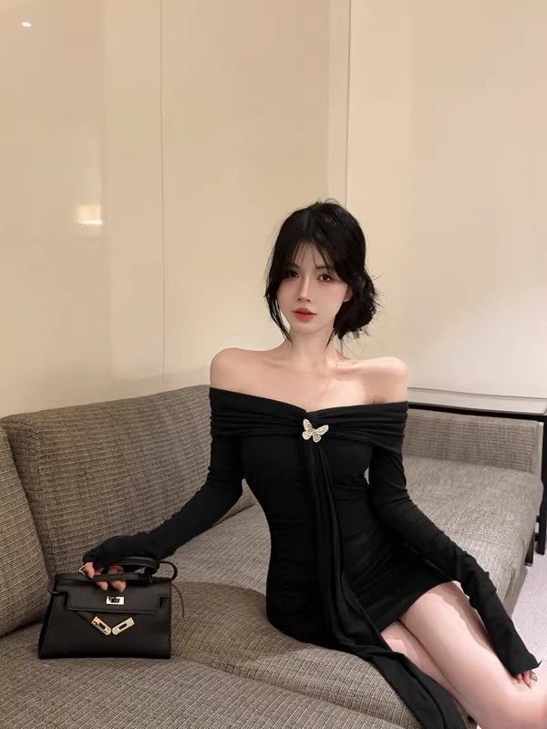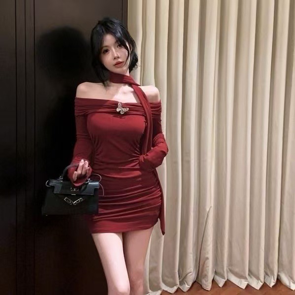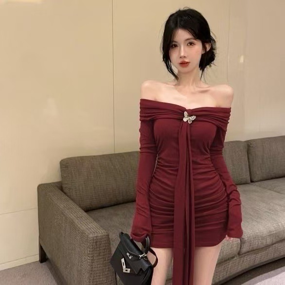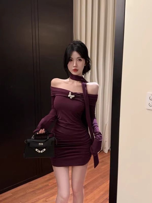 오프 숄더 보라색 목 긴 소매 원피스 여성의 가을 슬림 허리 스커트 순수한 바람 꽉 엉덩이 치마스토어 가기