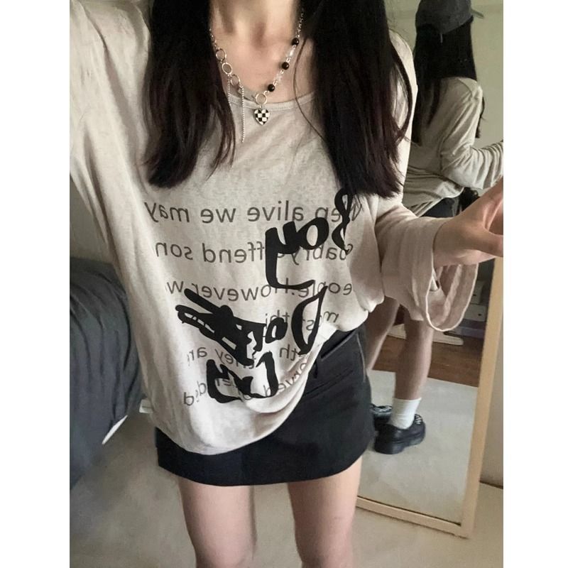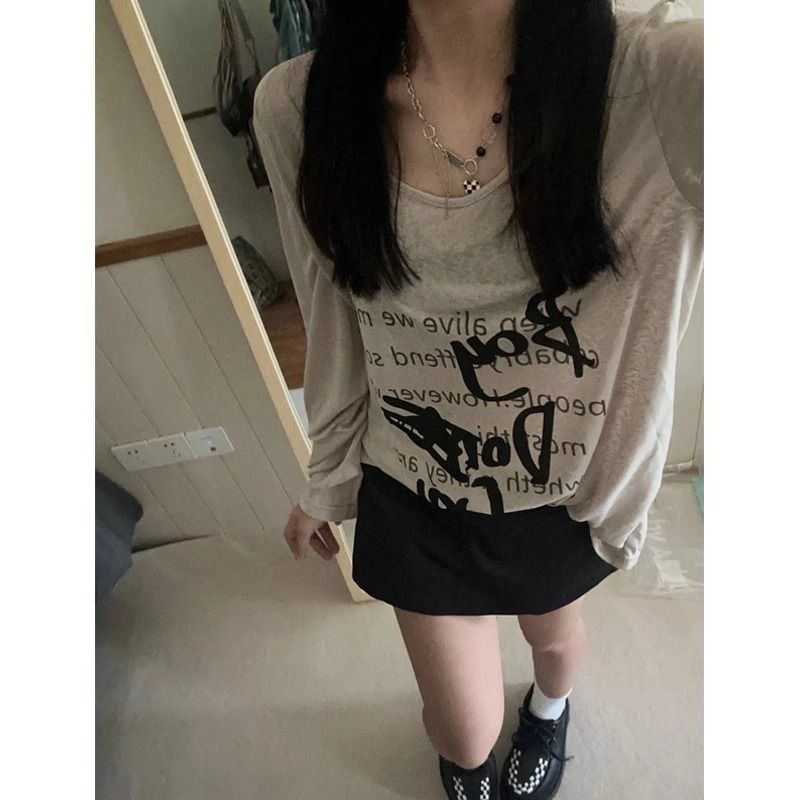게으른 스타일 편지 인쇄 긴팔 선 스크린 티셔츠 여성의 가을 디자인 느슨한 얇은 뜨거운 소녀 탑