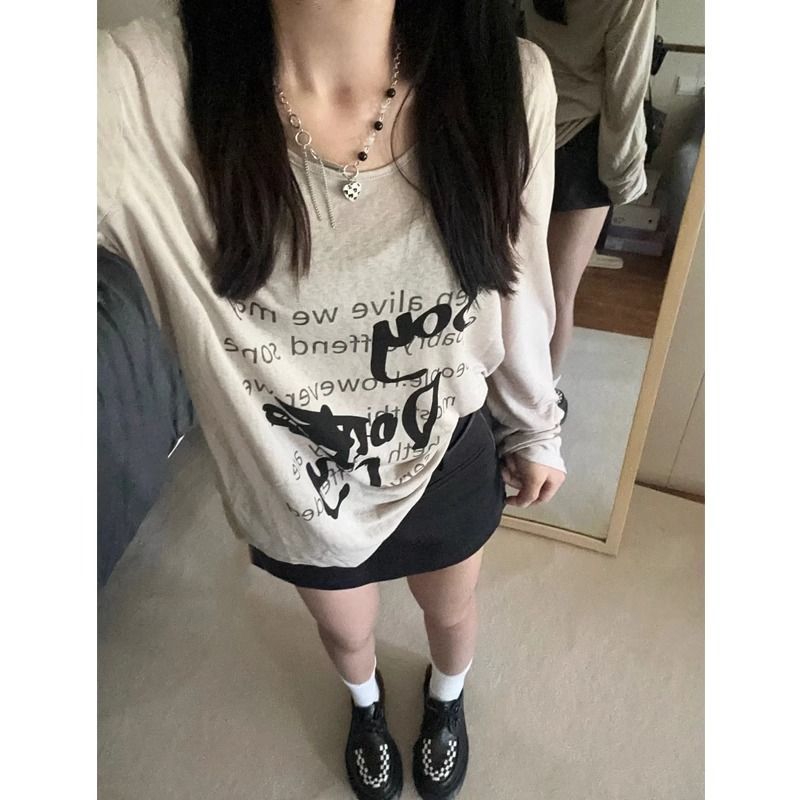 게으른 스타일 편지 인쇄 긴팔 선 스크린 티셔츠 여성의 가을 디자인 느슨한 얇은 뜨거운 소녀 탑스토어 가기