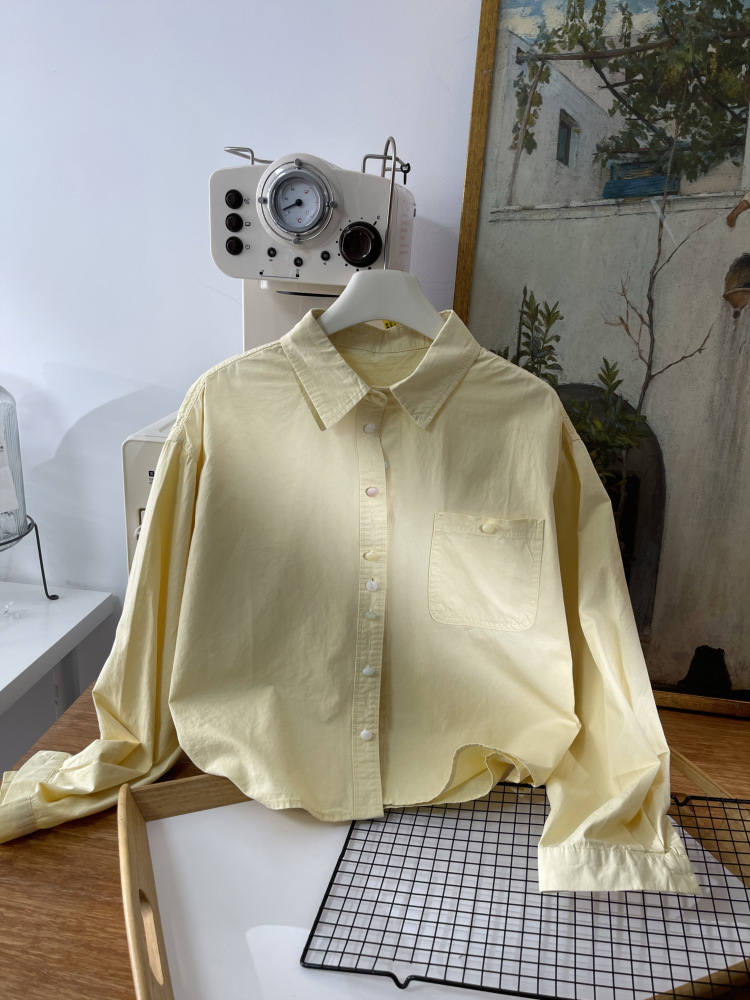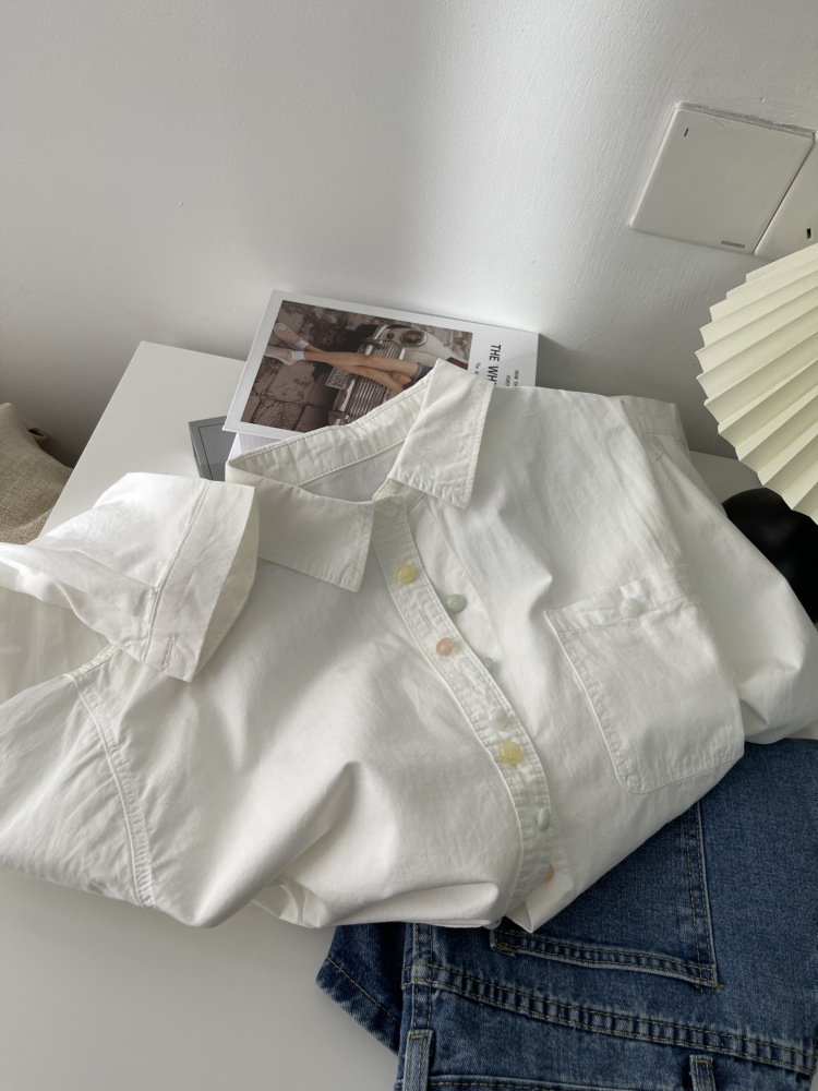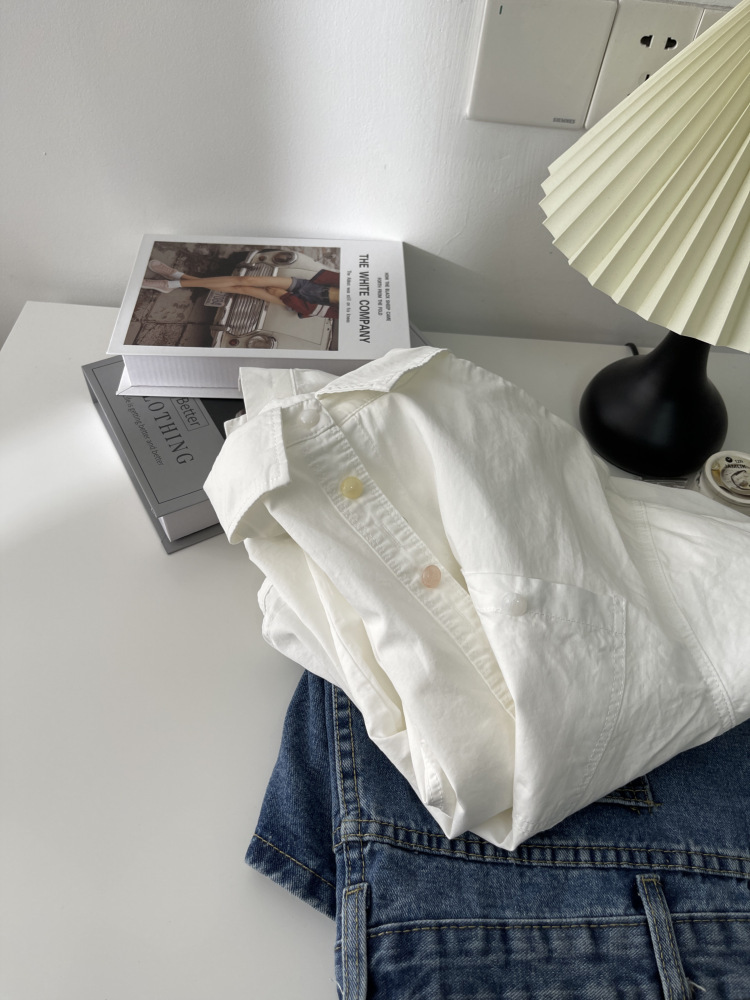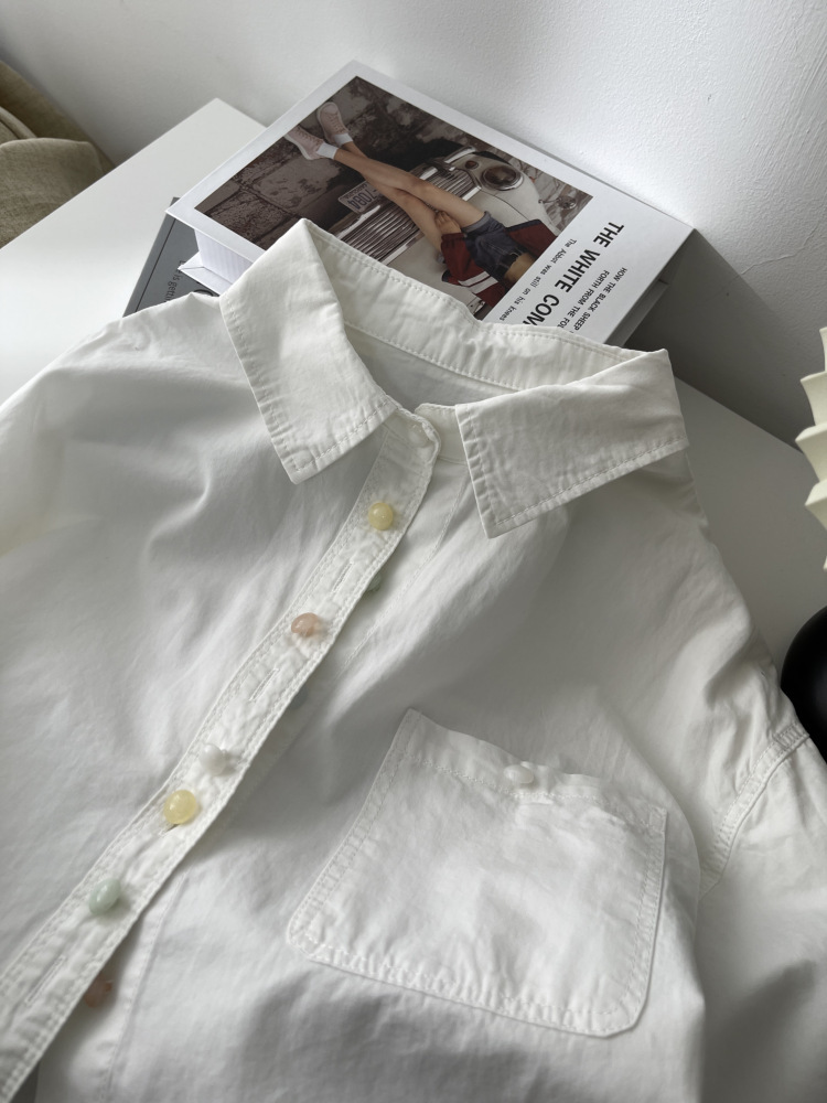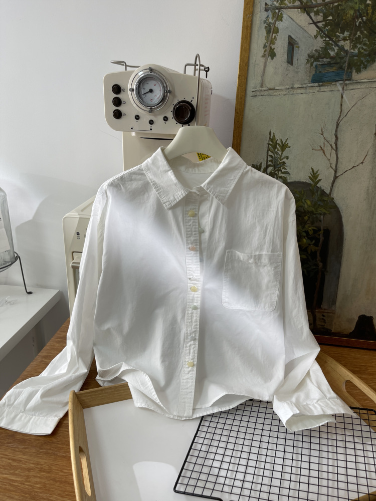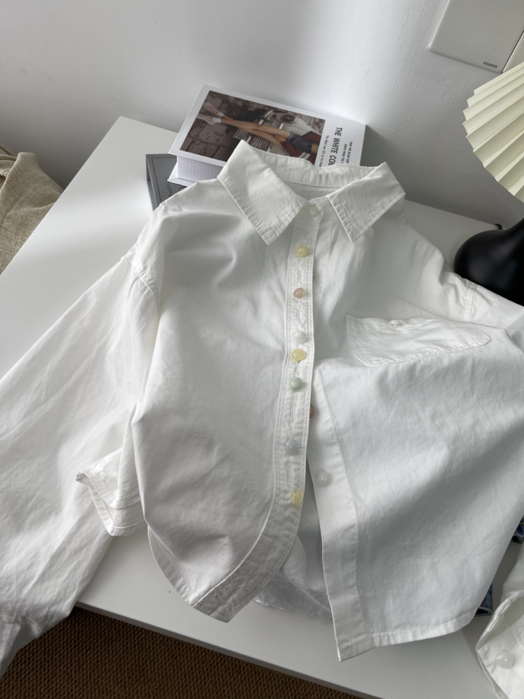 2025 짧은 셔츠 여성의 새로운 스타일 작은 내부 스택 셔츠 긴 소매 미터 감각 틈새 화이트 톱 5211
