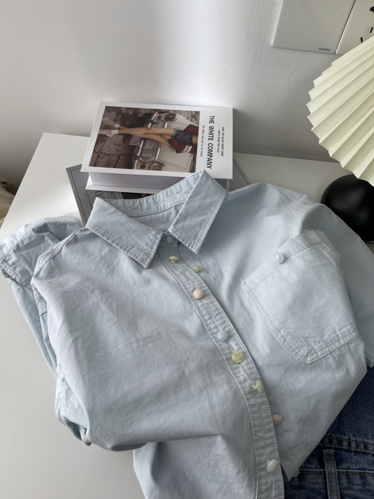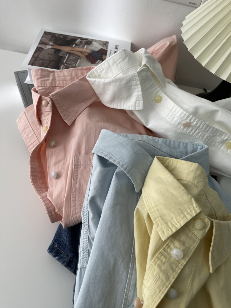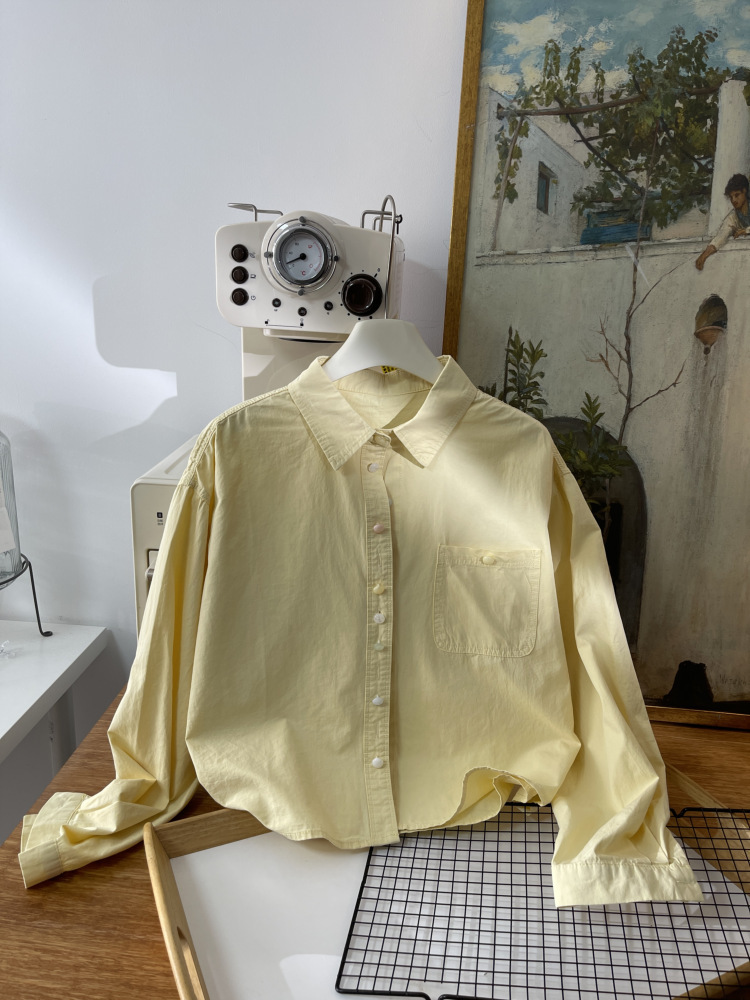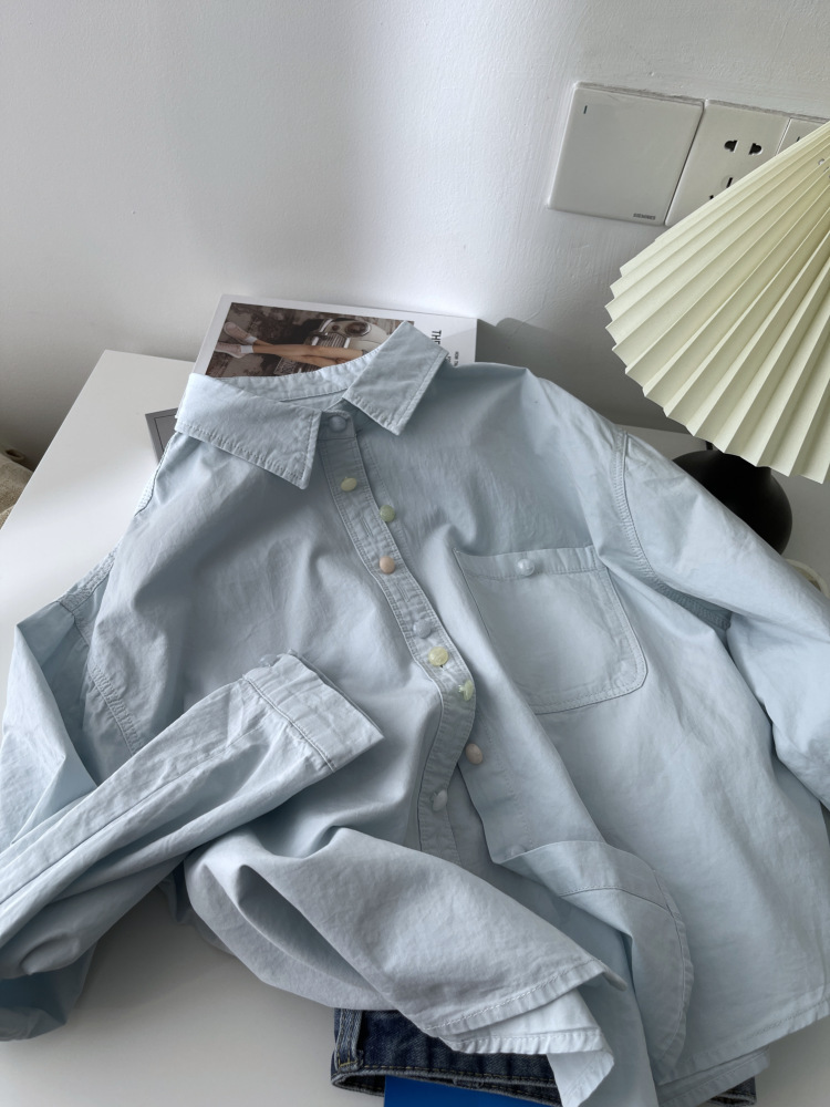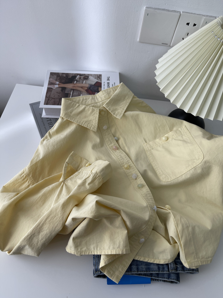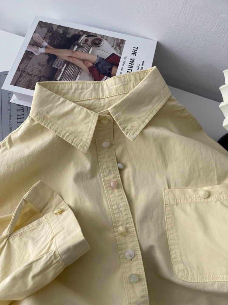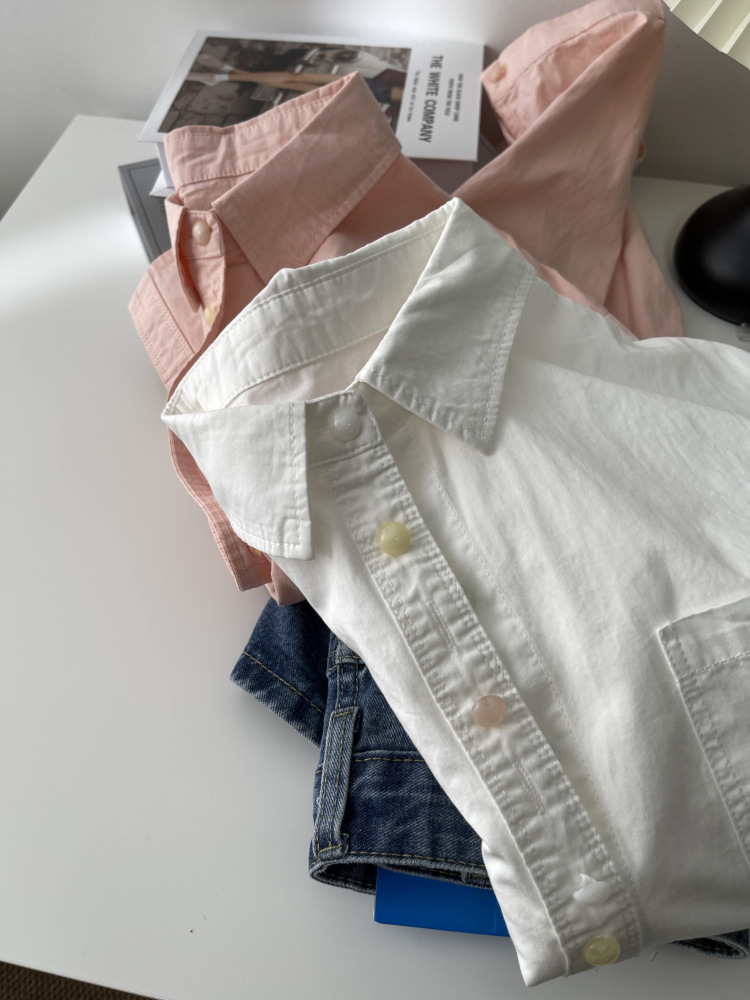 2025 짧은 셔츠 여성의 새로운 스타일 작은 내부 스택 셔츠 긴 소매 미터 감각 틈새 화이트 톱 5211