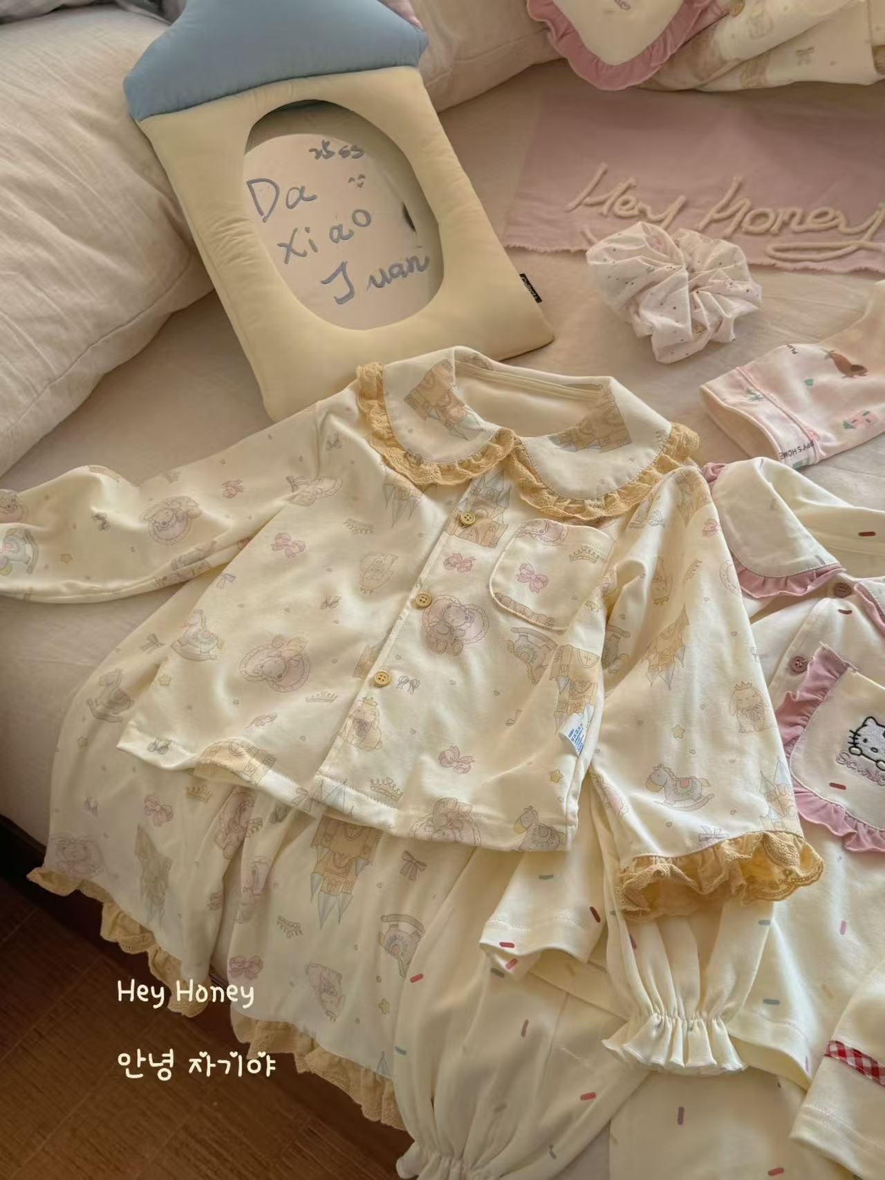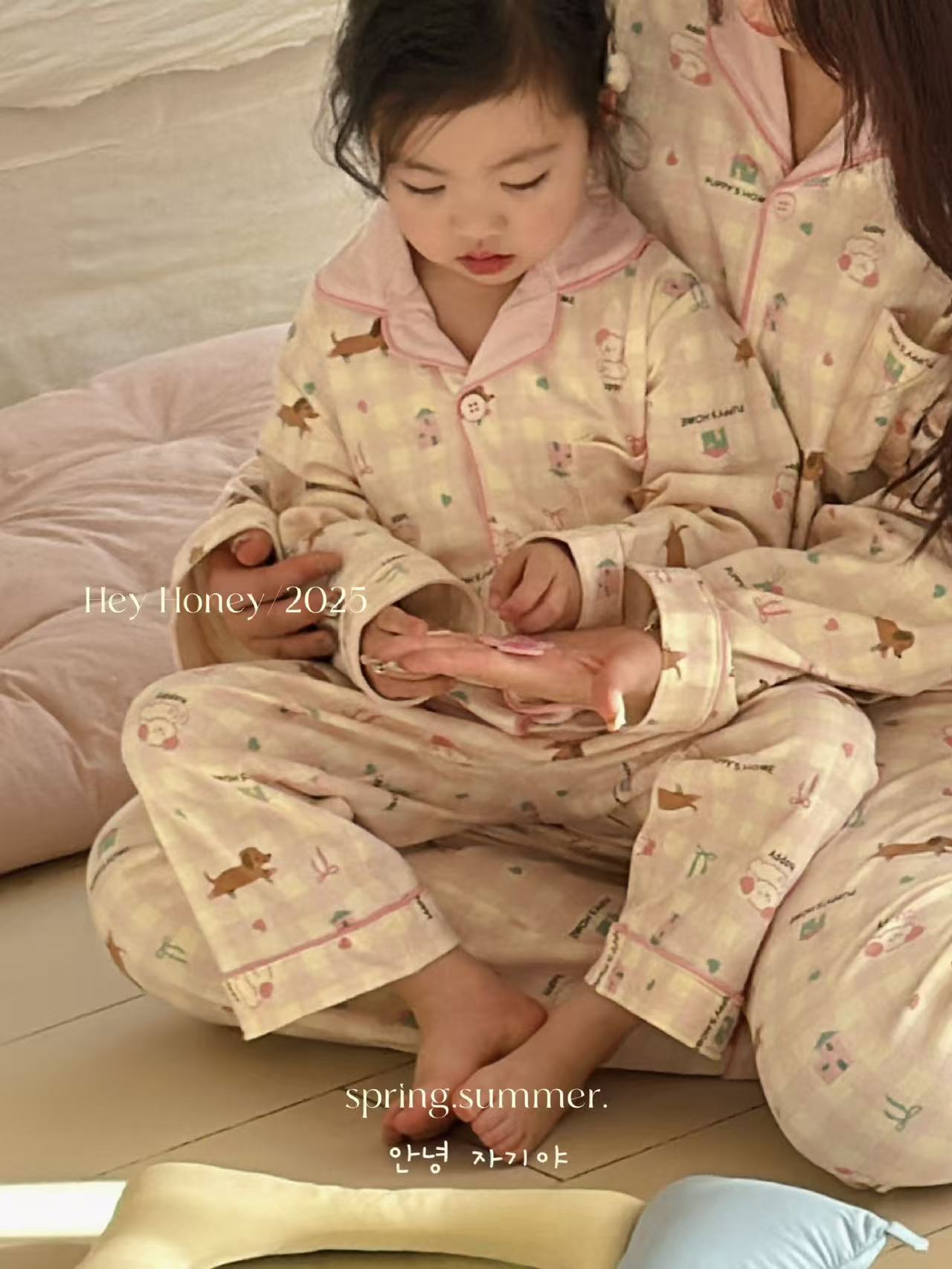 재고 있음 Hey Sweetheart 사이즈 롤 25 봄, 가을 프린트 한국 단일 행 오픈 버튼 투피스 부모-자식 잠옷 세트 홈웨어스토어 가기