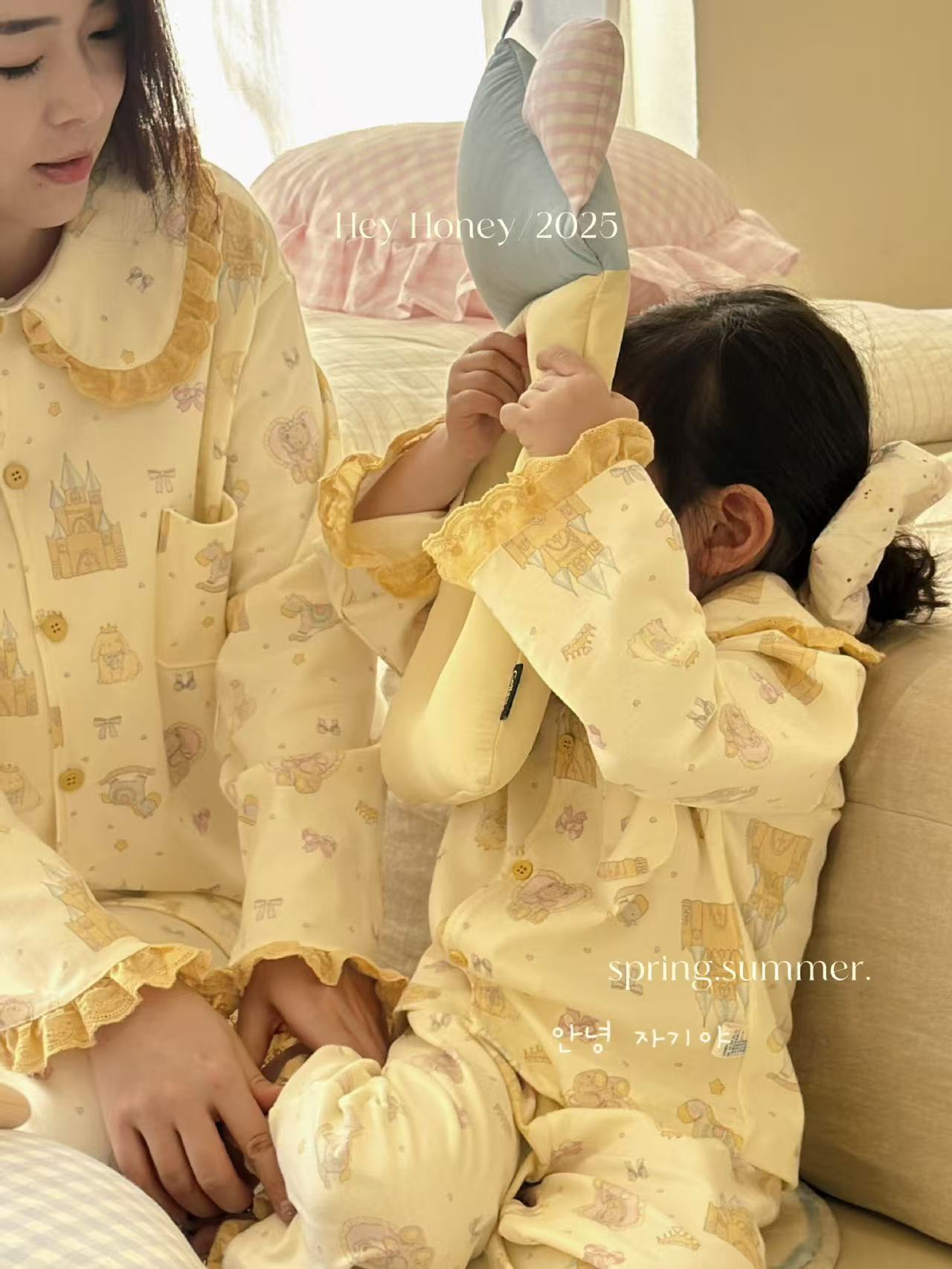 재고 있음 Hey Sweetheart 사이즈 롤 25 봄, 가을 프린트 한국 단일 행 오픈 버튼 투피스 부모-자식 잠옷 세트 홈웨어