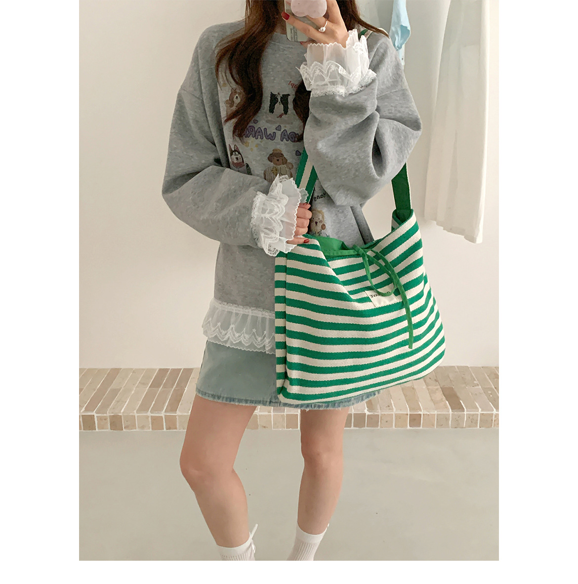 2025 봄과 여름 새로운 어깨 크로스 바디 백 신선한 녹색 스트라이프 듀얼 사용 더블 빵 대용량 캔버스 가방
