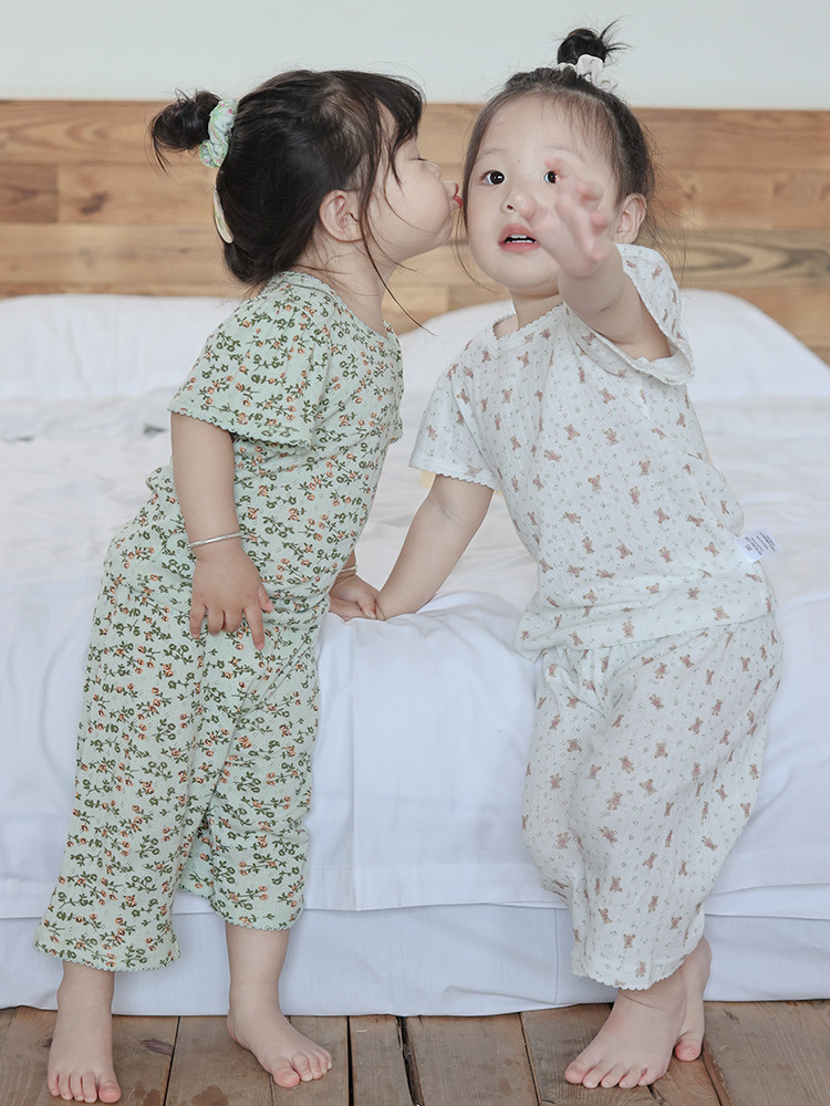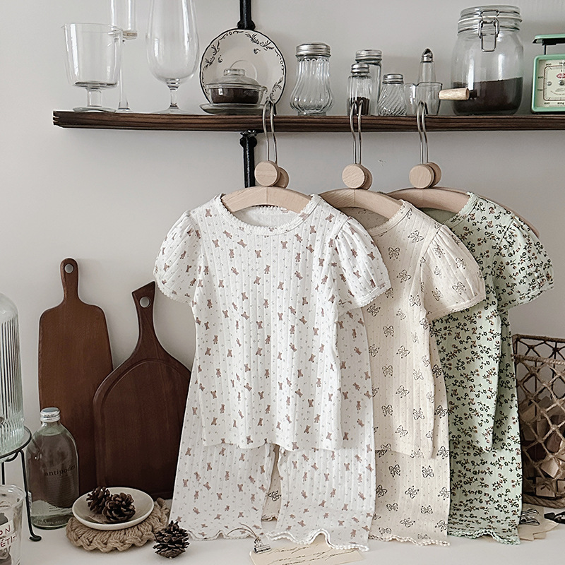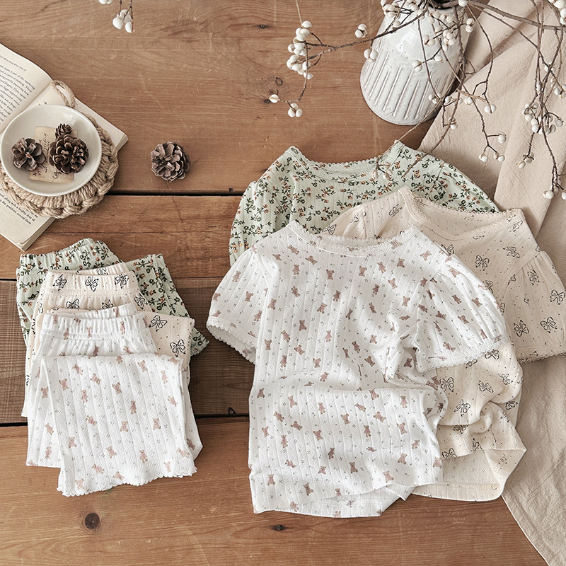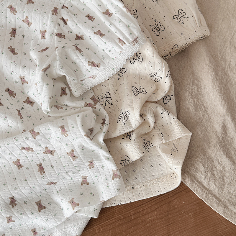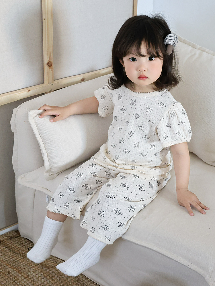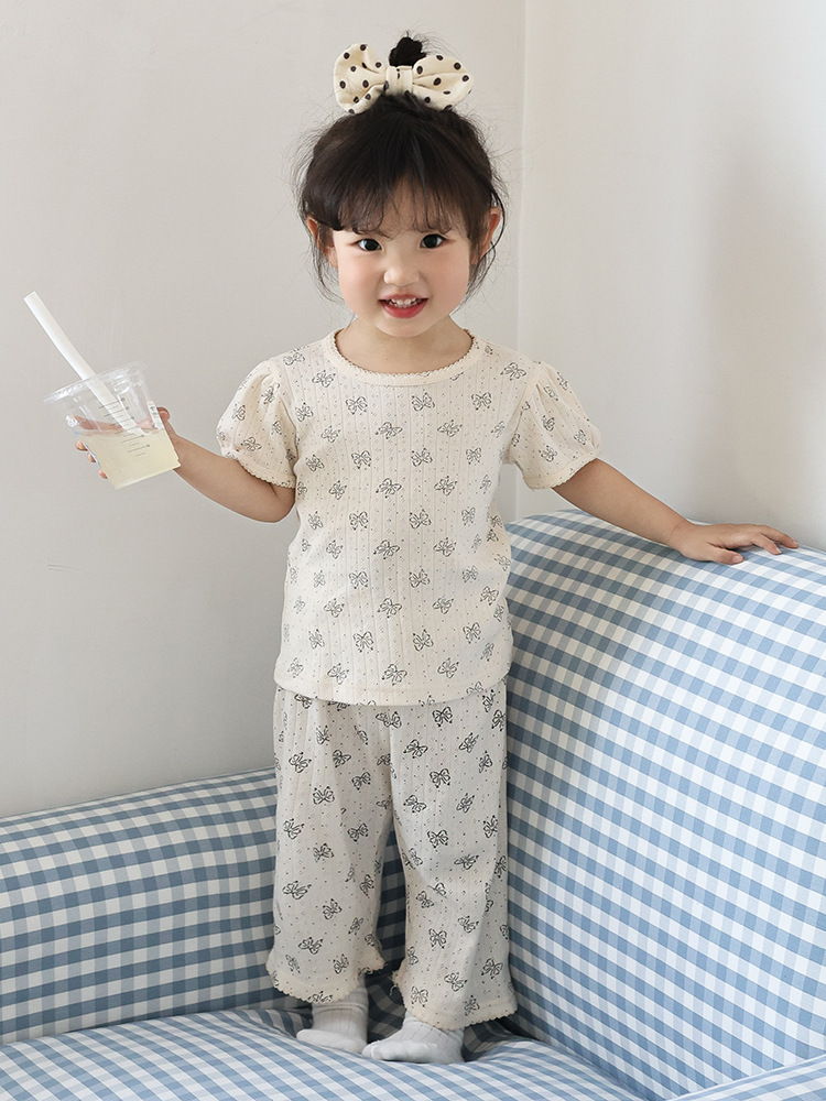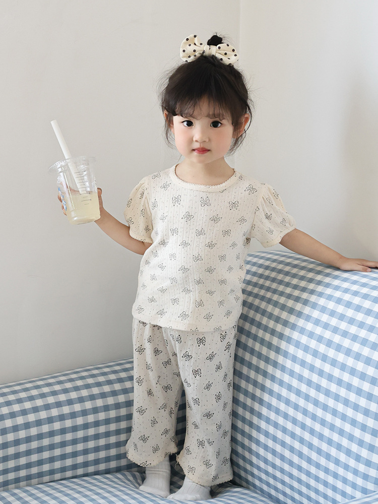 2025 년 소녀의 여름 홈 의류 세트 어린이 서양식 버블 슬리브 느슨한 편안한 소녀 잠옷 에어컨 옷스토어 가기