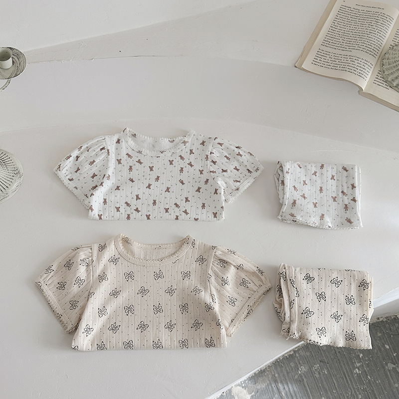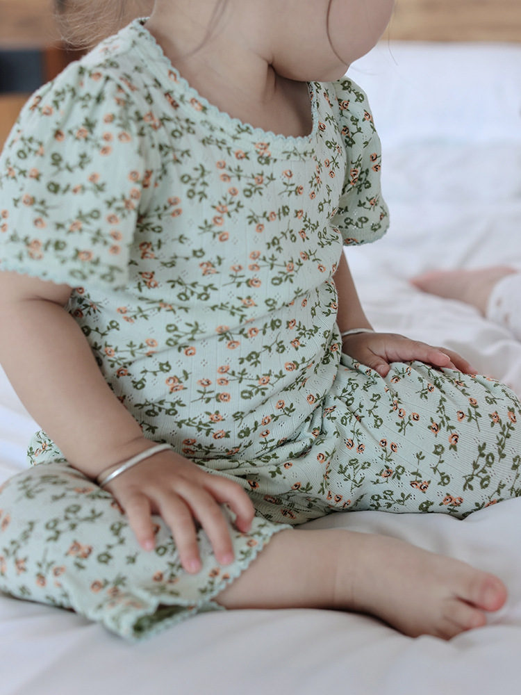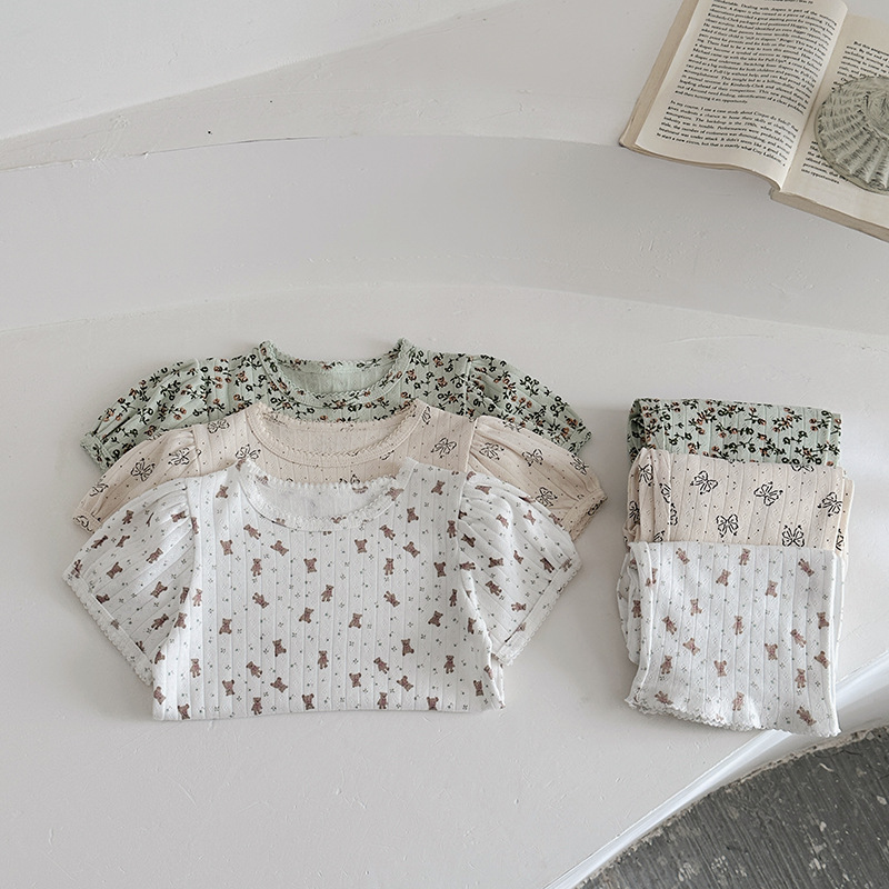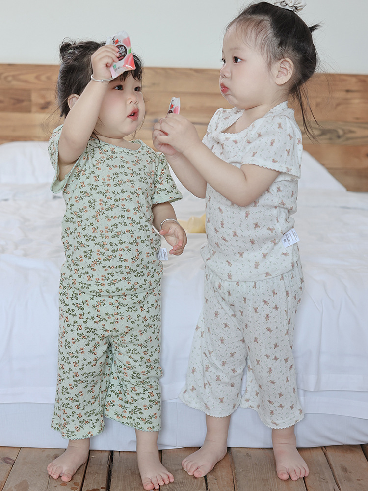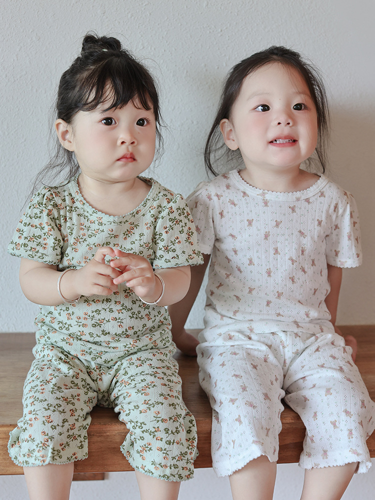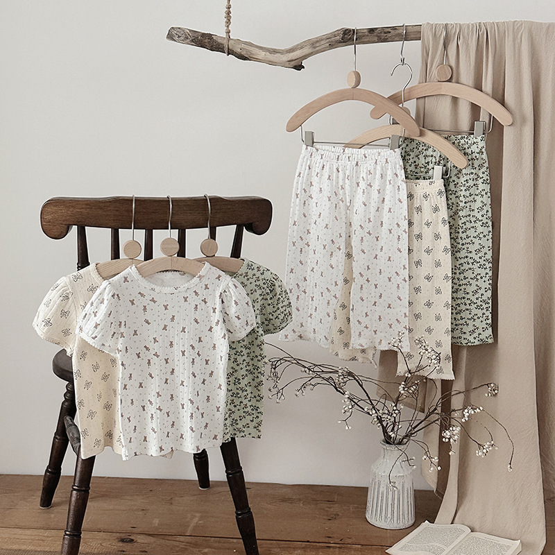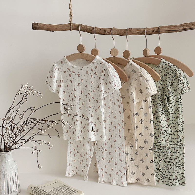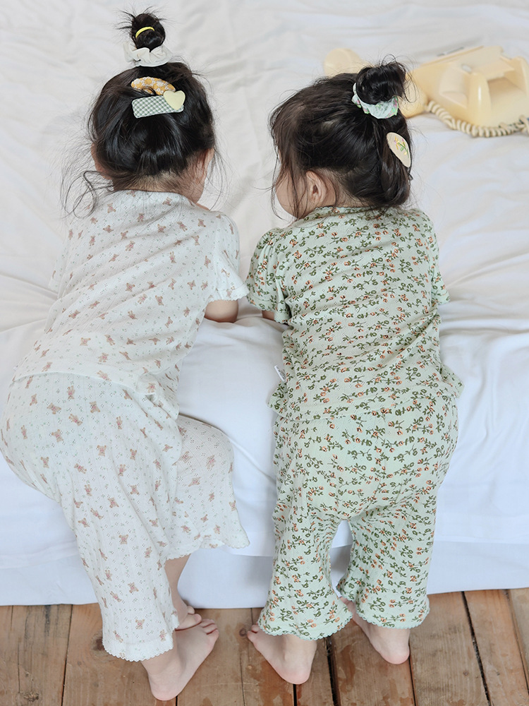 2025 년 소녀의 여름 홈 의류 세트 어린이 서양식 버블 슬리브 느슨한 편안한 소녀 잠옷 에어컨 옷스토어 가기