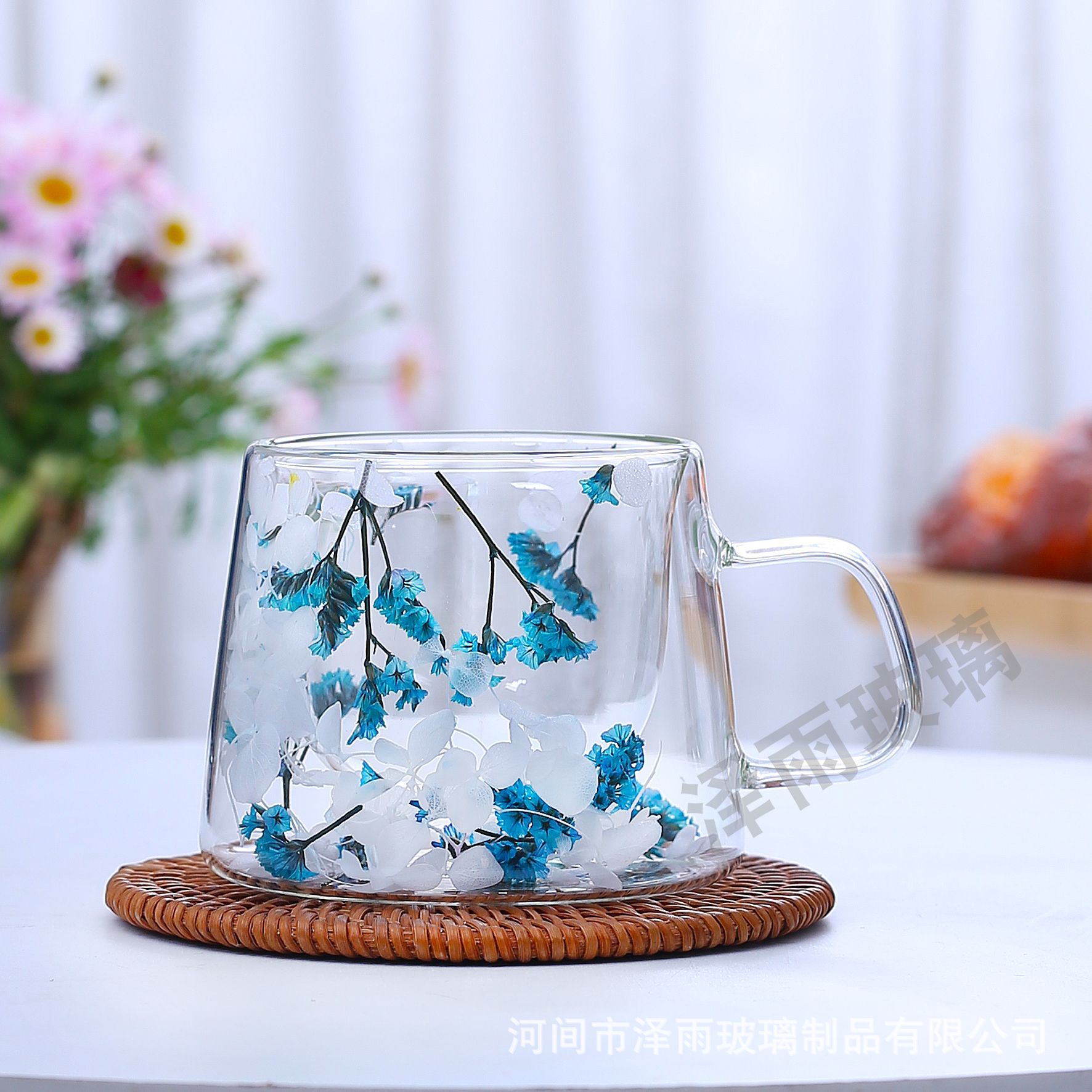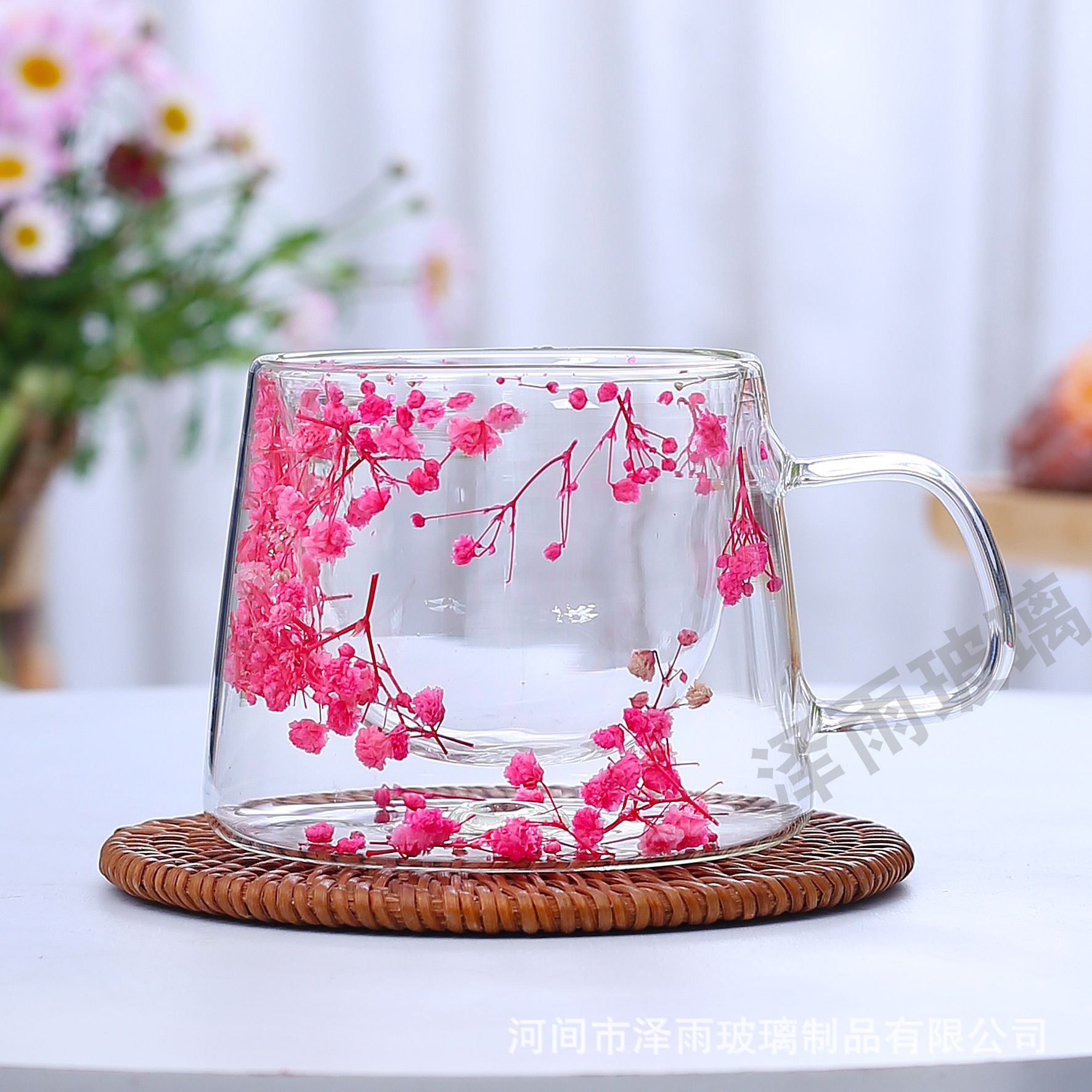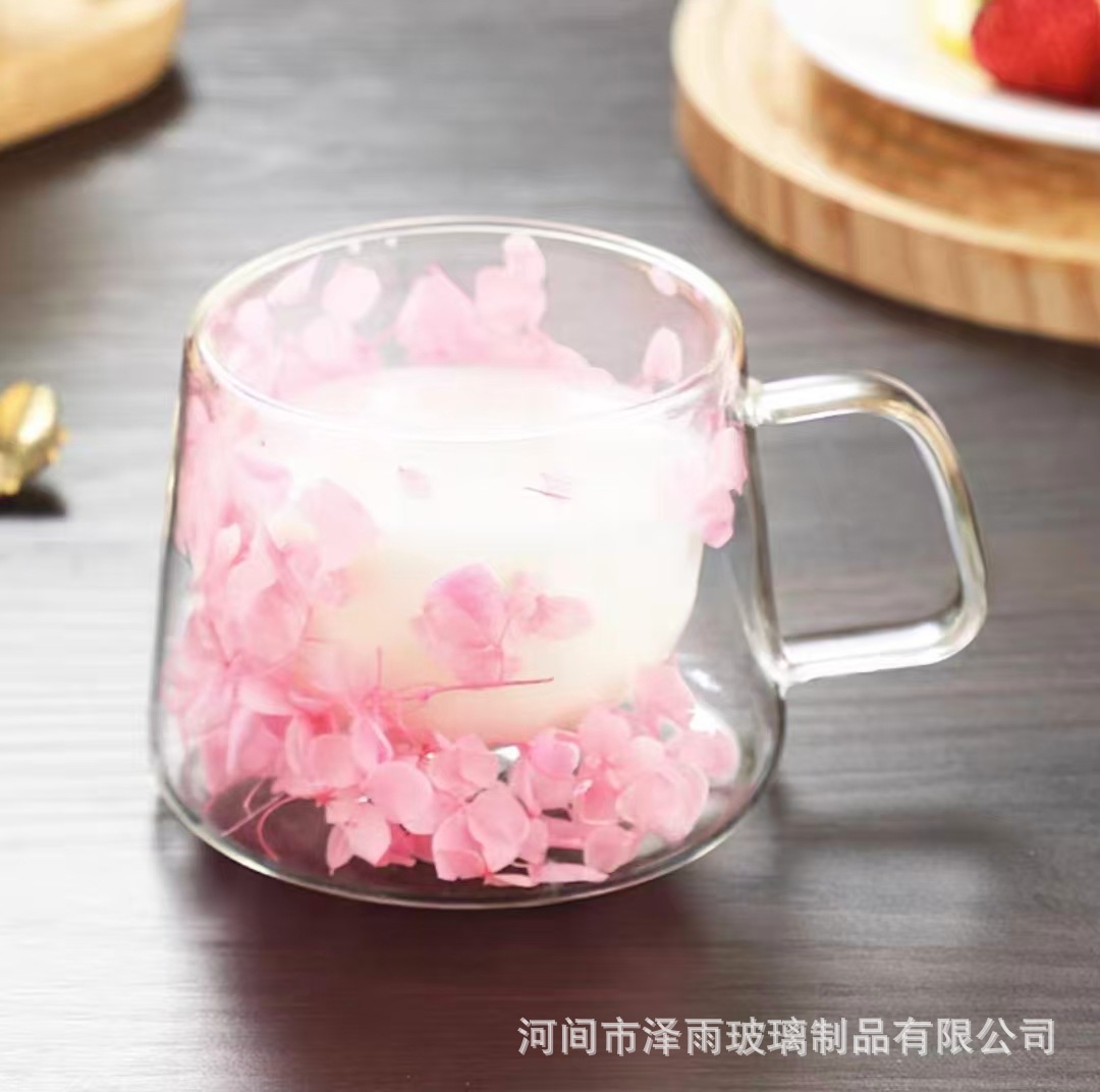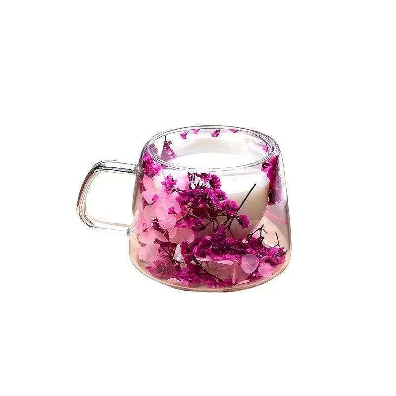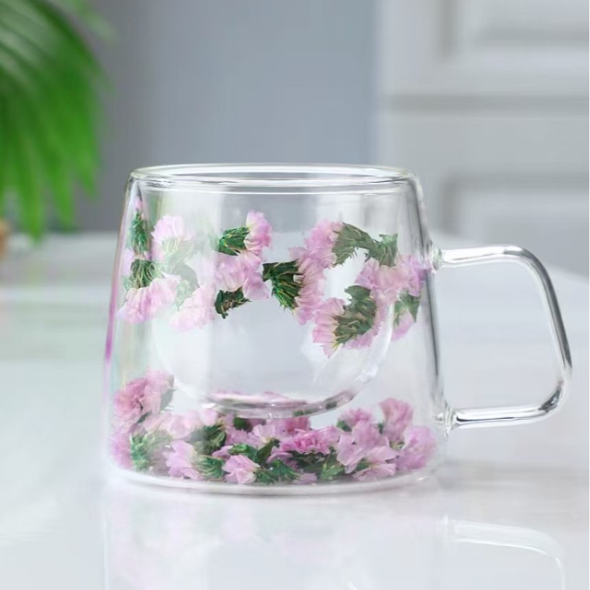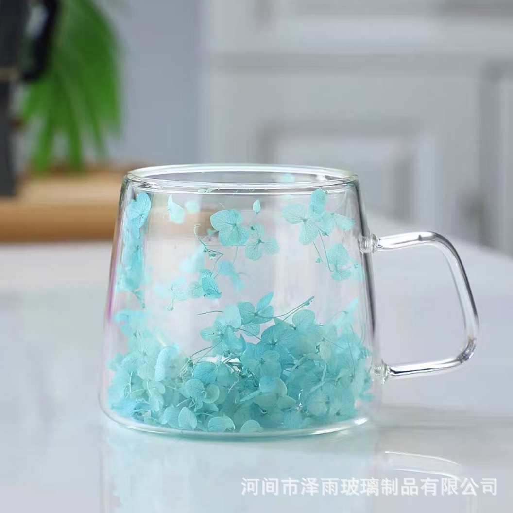 말린 꽃 더블 꽃잎 유리 유사 컵 크리 에이 티브 크로스 보더 고온 방지 투명 실제 꽃 고 붕규산 커피 컵