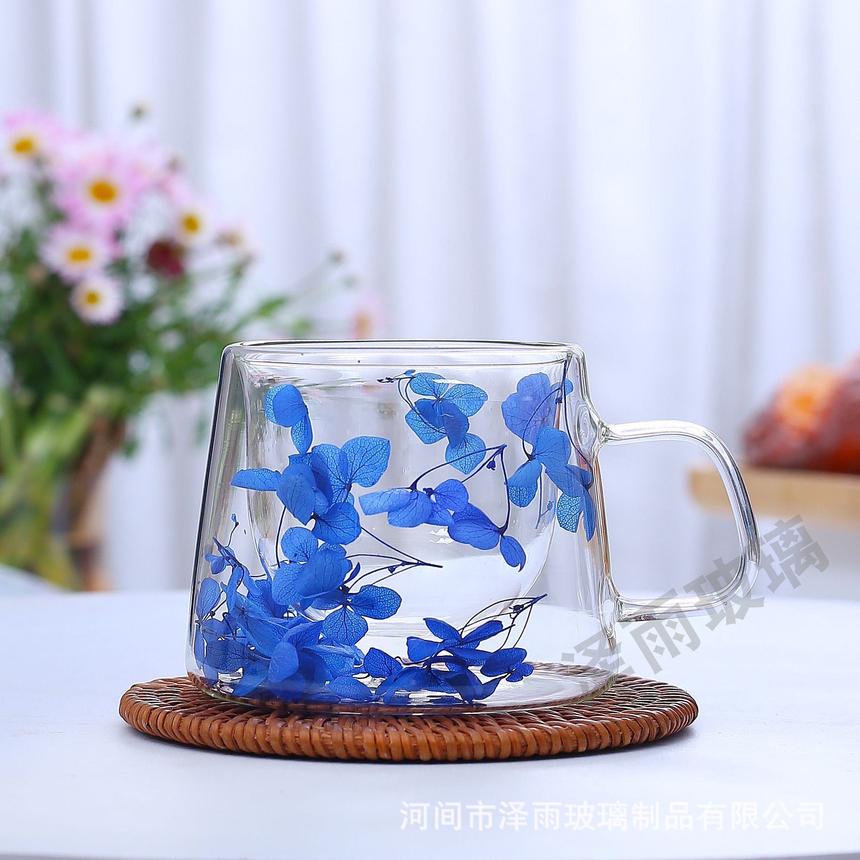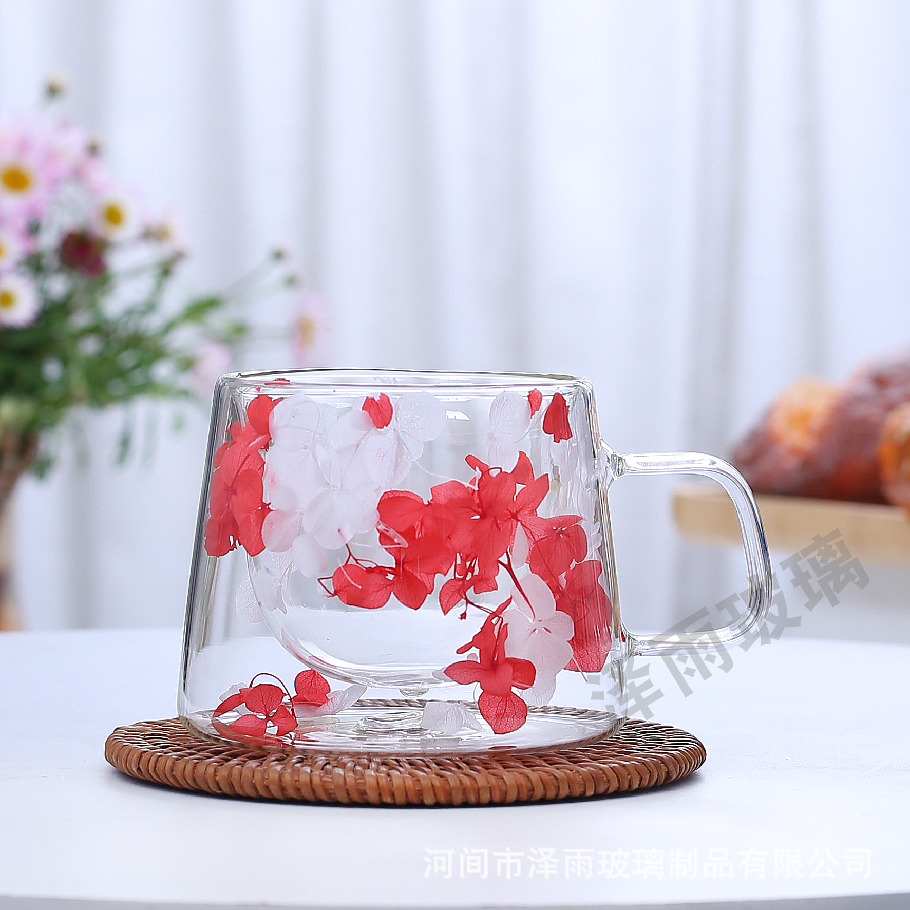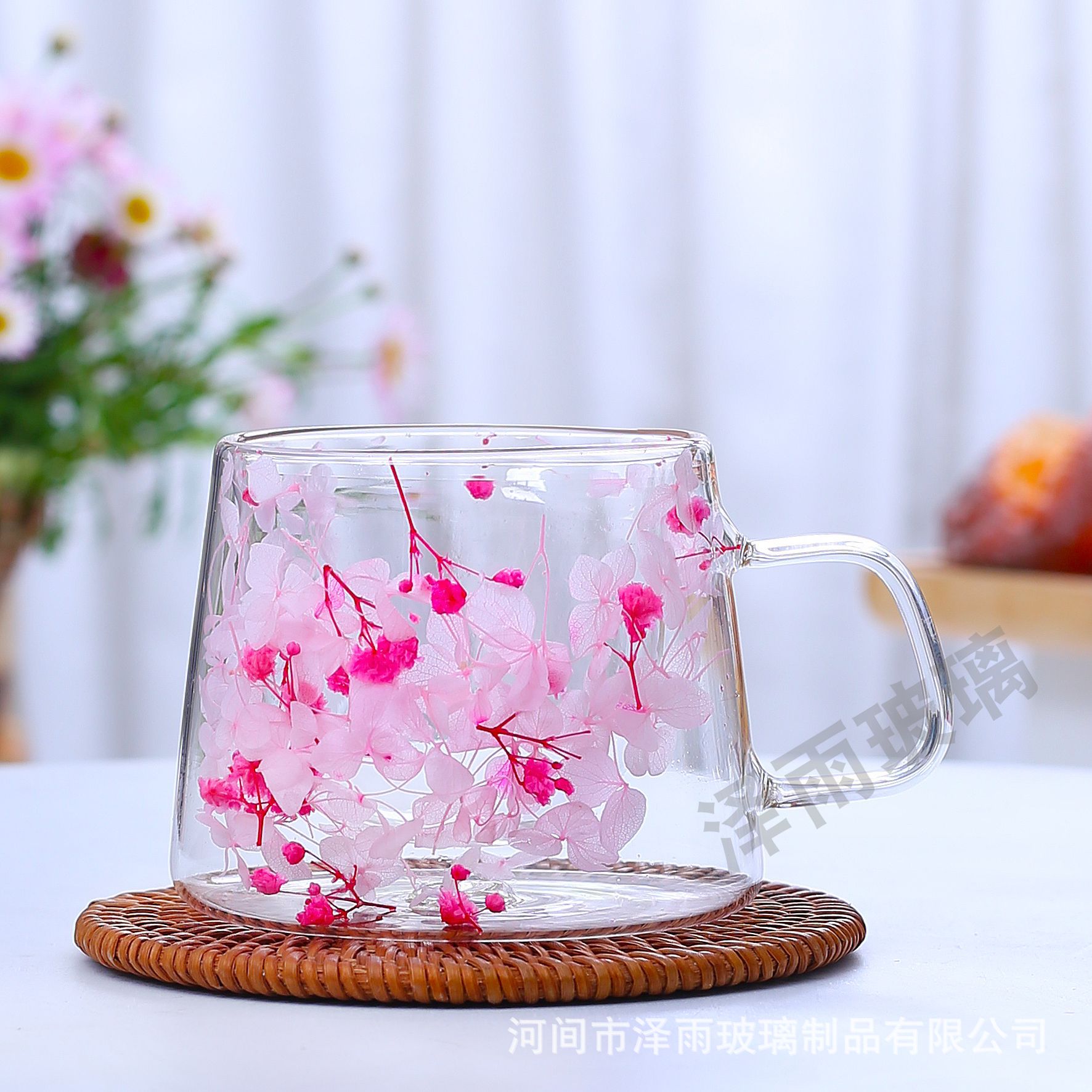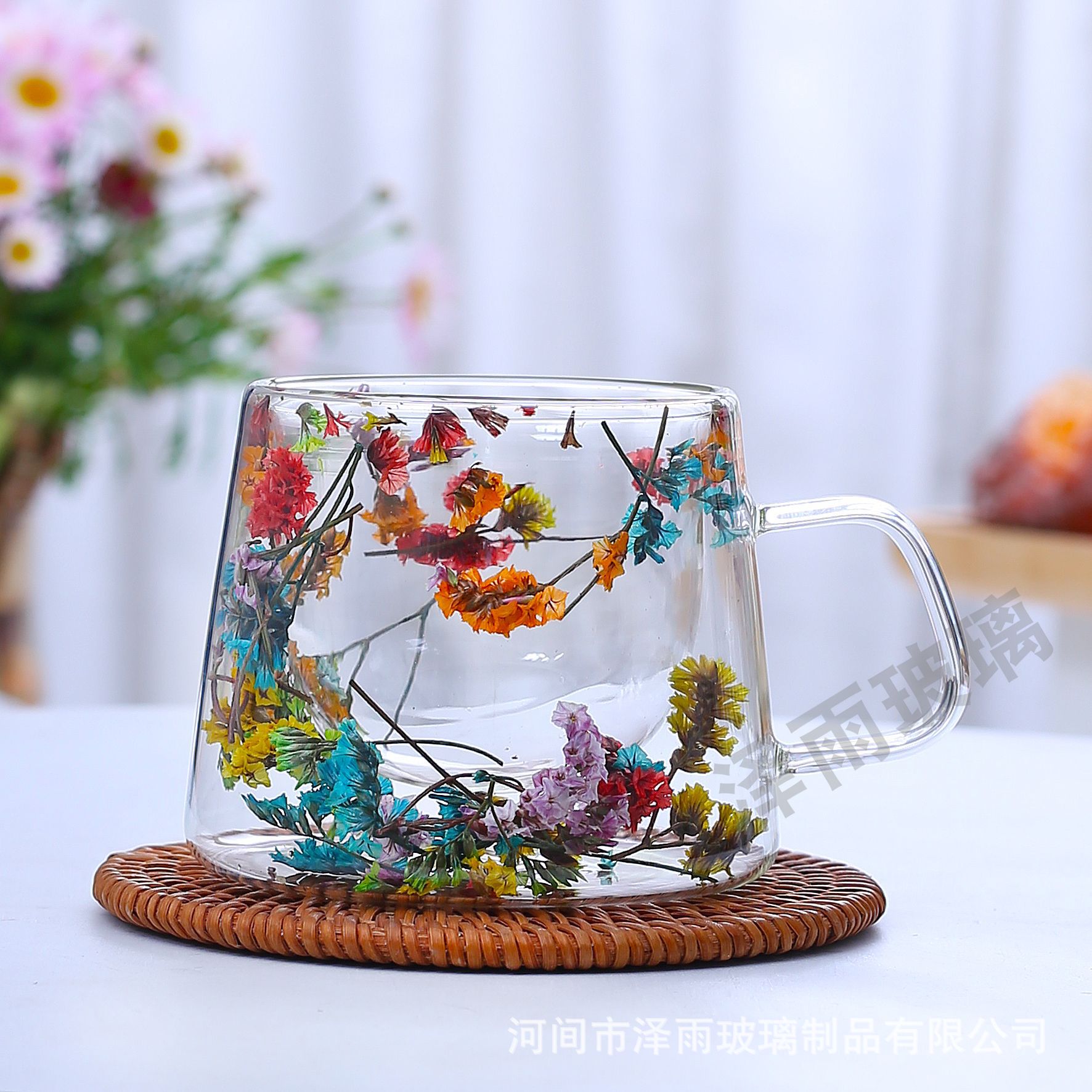 말린 꽃 더블 꽃잎 유리 유사 컵 크리 에이 티브 크로스 보더 고온 방지 투명 실제 꽃 고 붕규산 커피 컵
