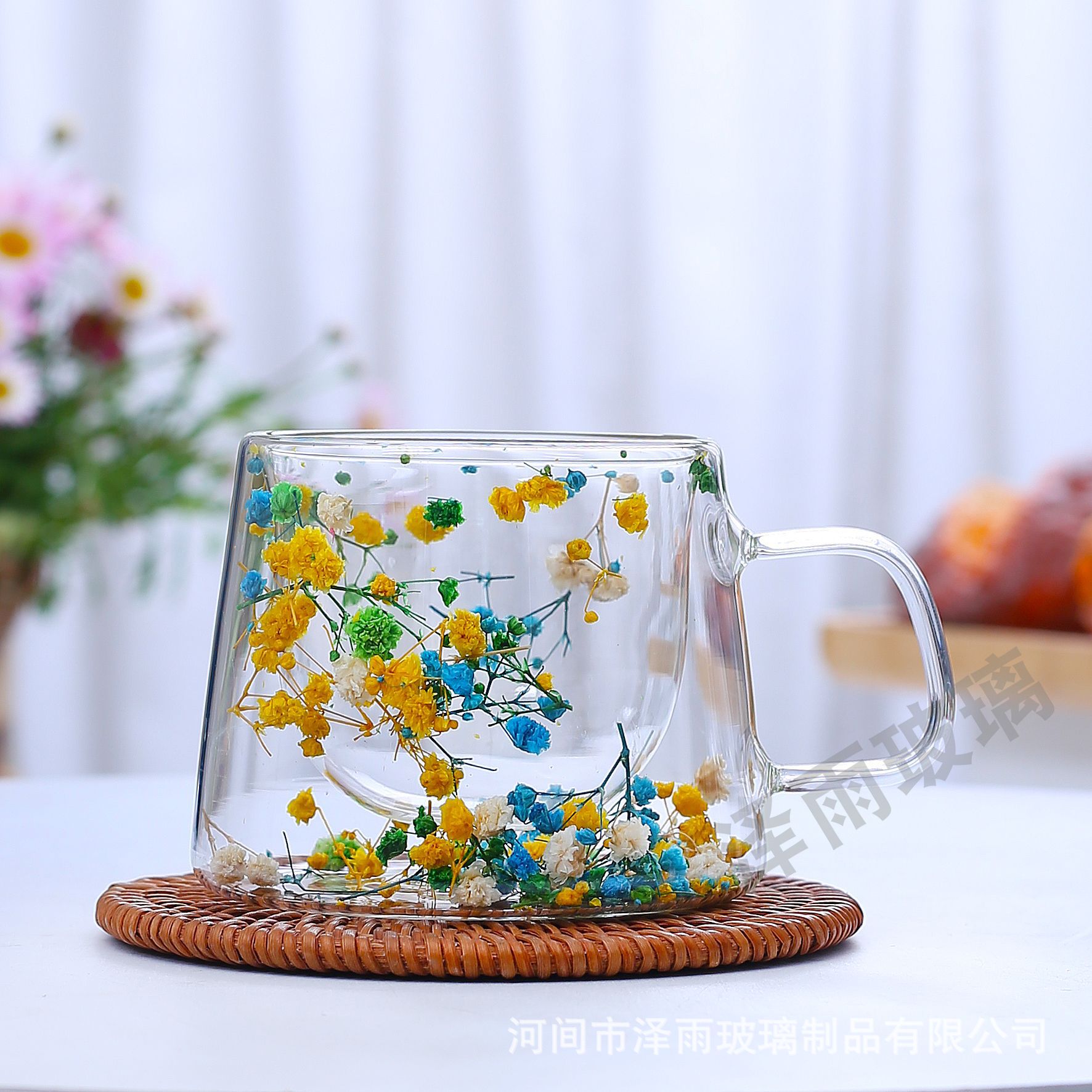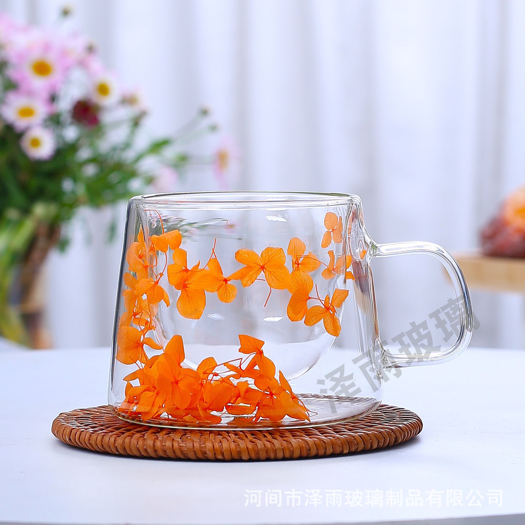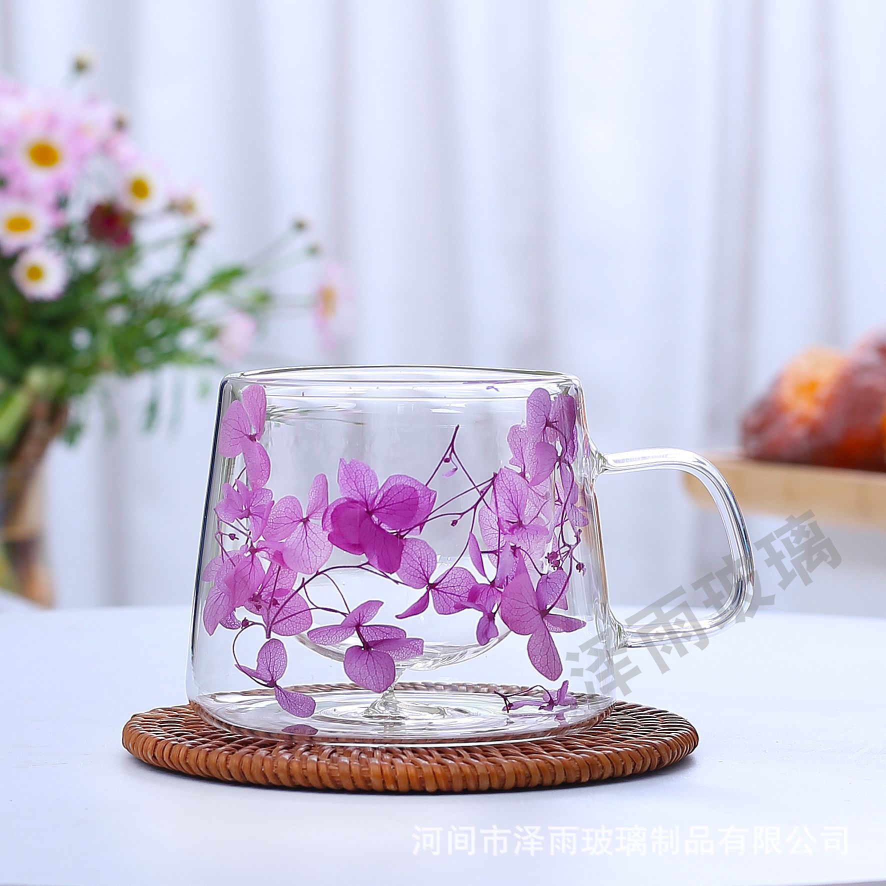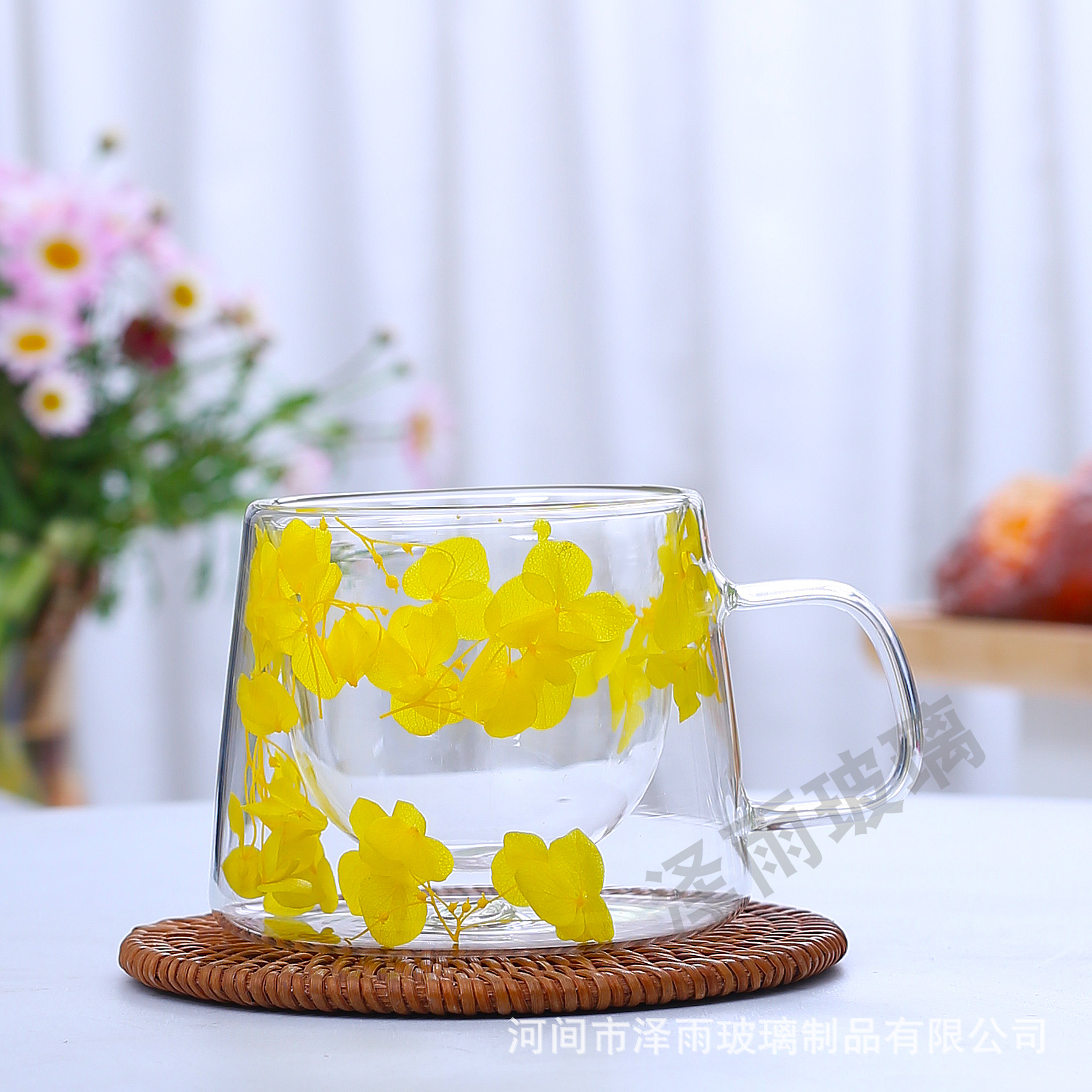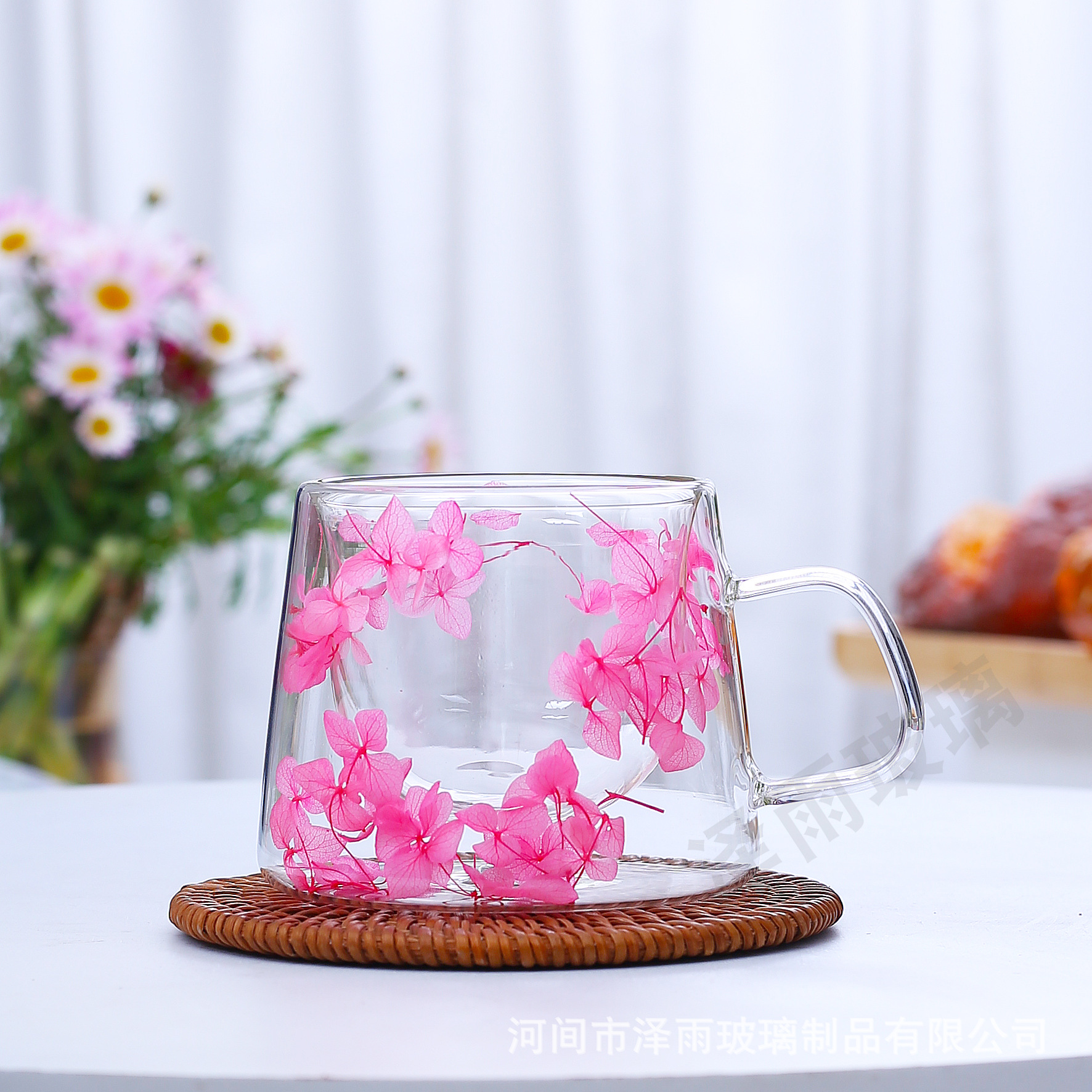 말린 꽃 더블 꽃잎 유리 유사 컵 크리 에이 티브 크로스 보더 고온 방지 투명 실제 꽃 고 붕규산 커피 컵