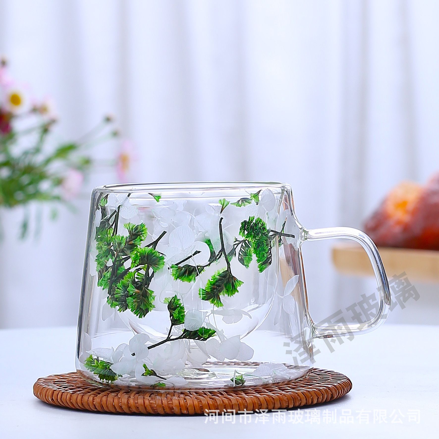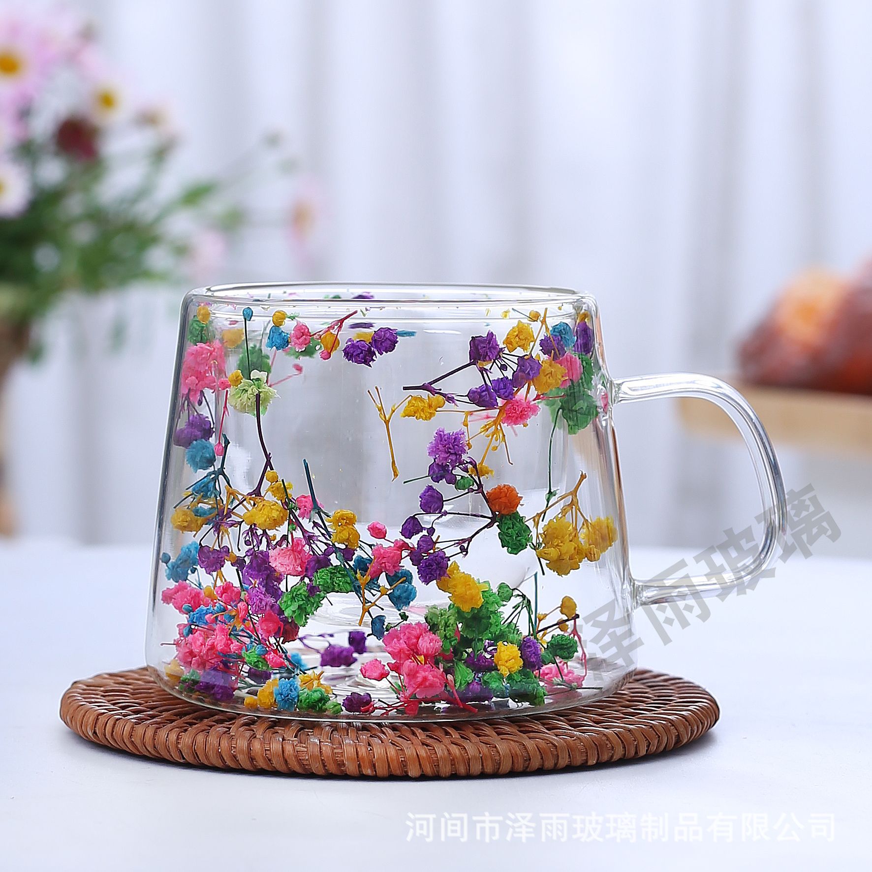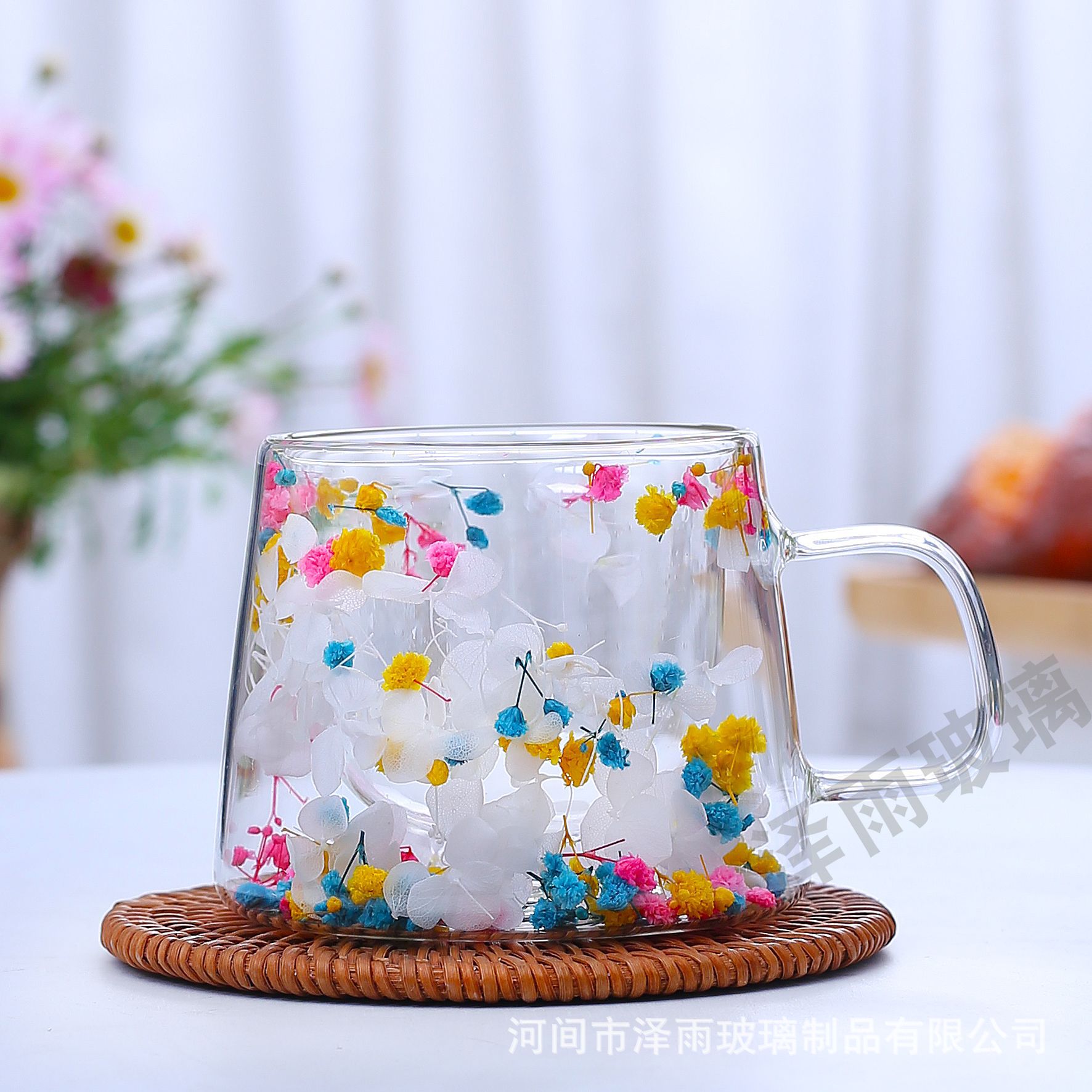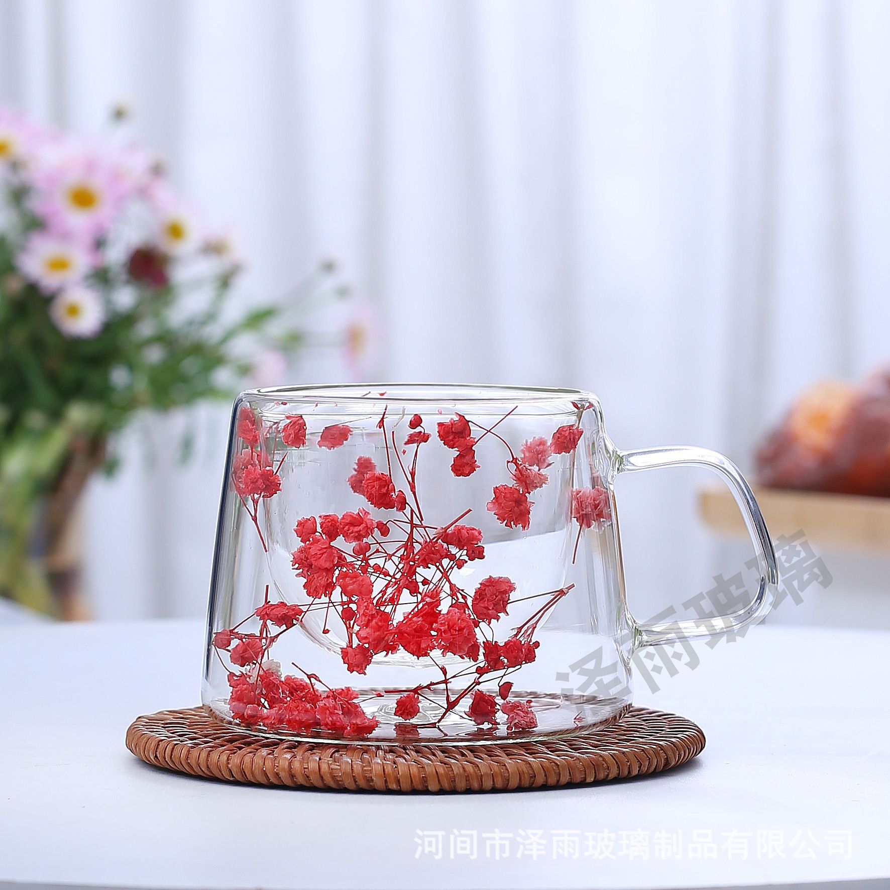 말린 꽃 더블 꽃잎 유리 유사 컵 크리 에이 티브 크로스 보더 고온 방지 투명 실제 꽃 고 붕규산 커피 컵