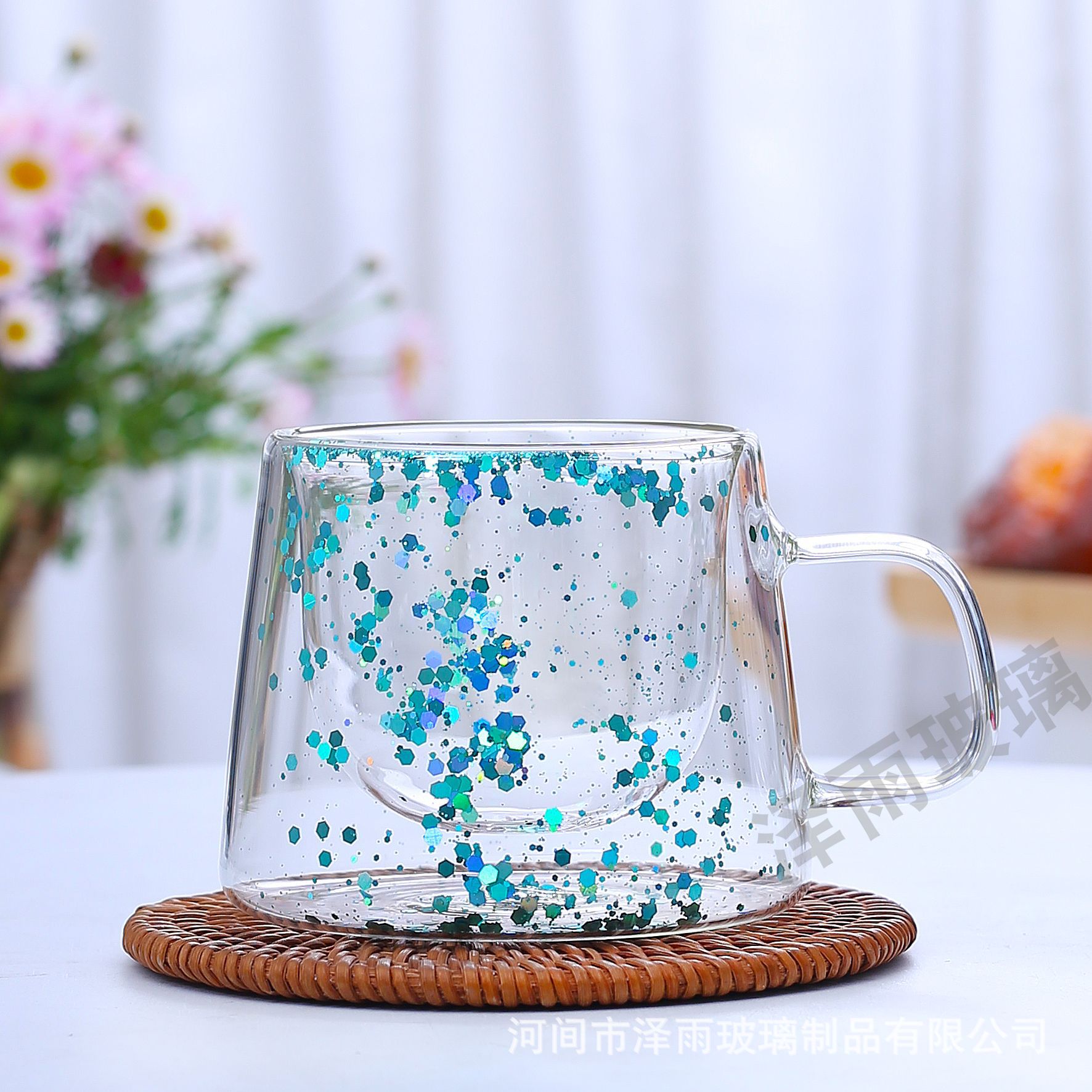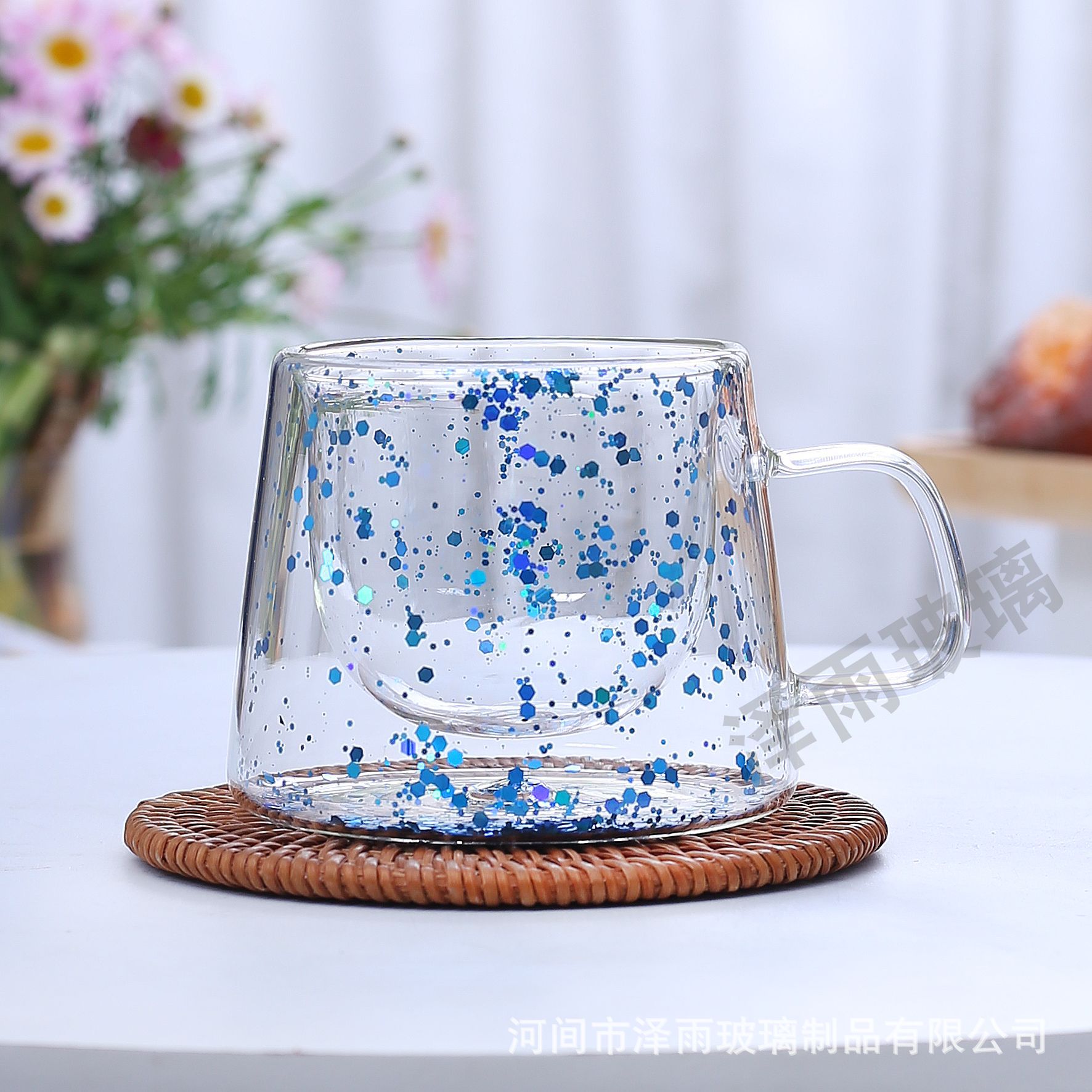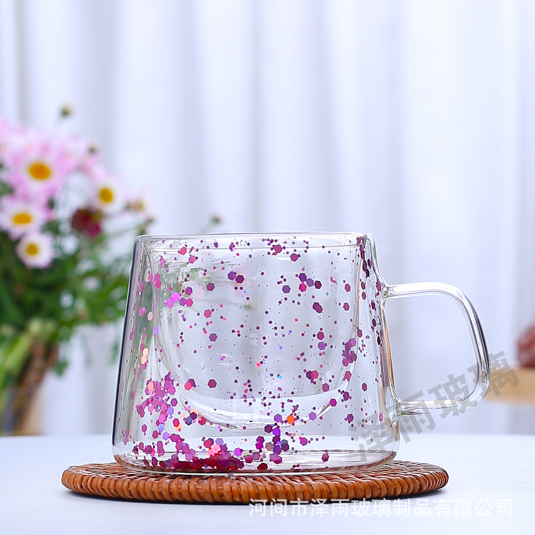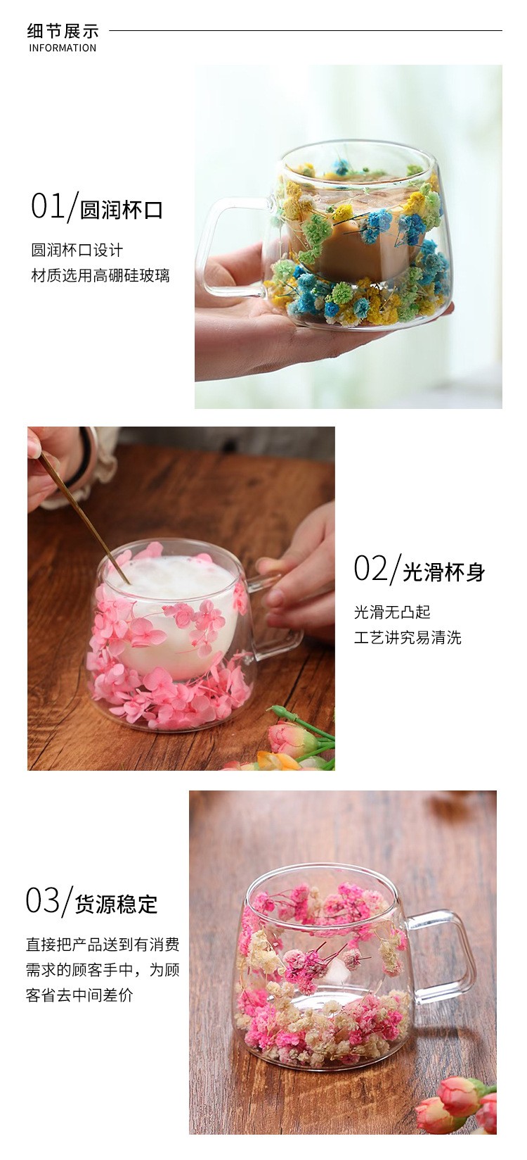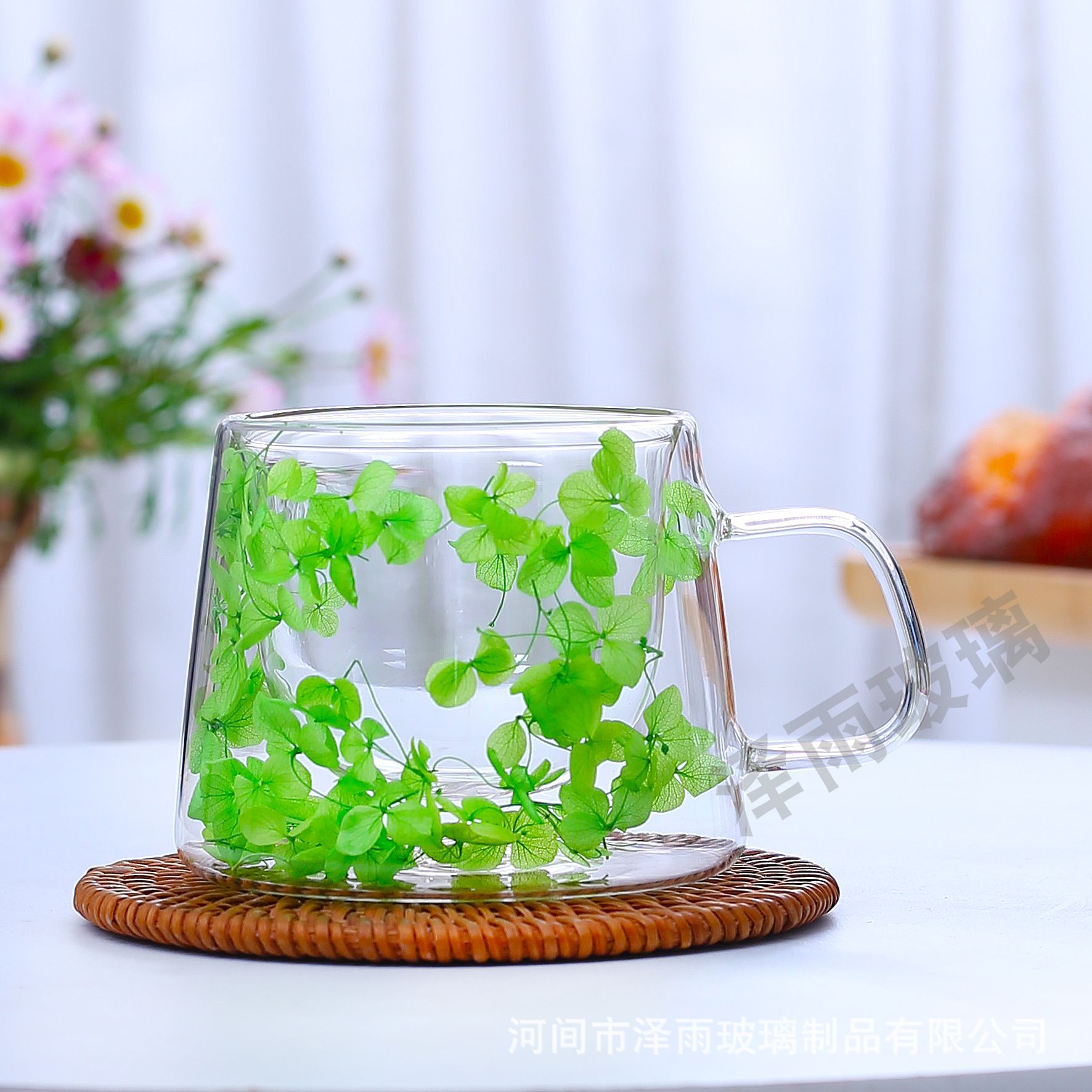 말린 꽃 더블 꽃잎 유리 유사 컵 크리 에이 티브 크로스 보더 고온 방지 투명 실제 꽃 고 붕규산 커피 컵