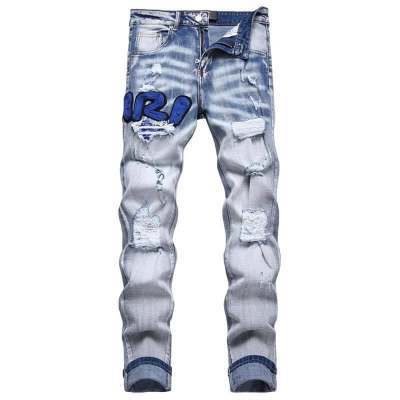 대외 무역 바느질 자수 빈티지 AM 슬림 핏 스키니 바지 남자 바지 찢어진 천 바지