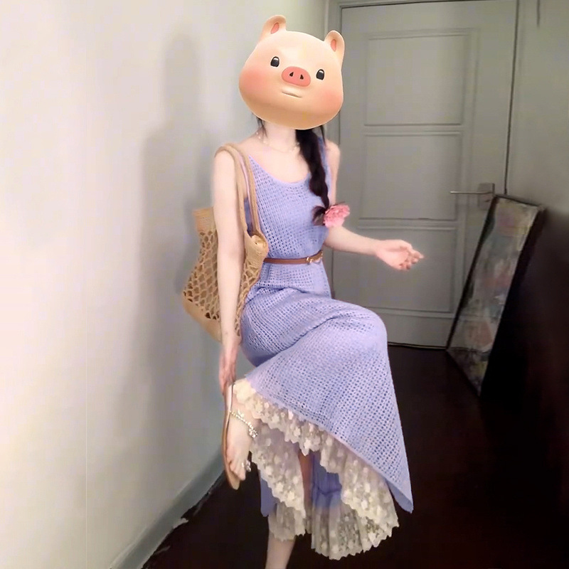 어린이 여름 원피스 보라색 니트 조끼 2025 새로운 도착 작은 허리 슬리밍 할로우 민소매 긴 원피스스토어 가기