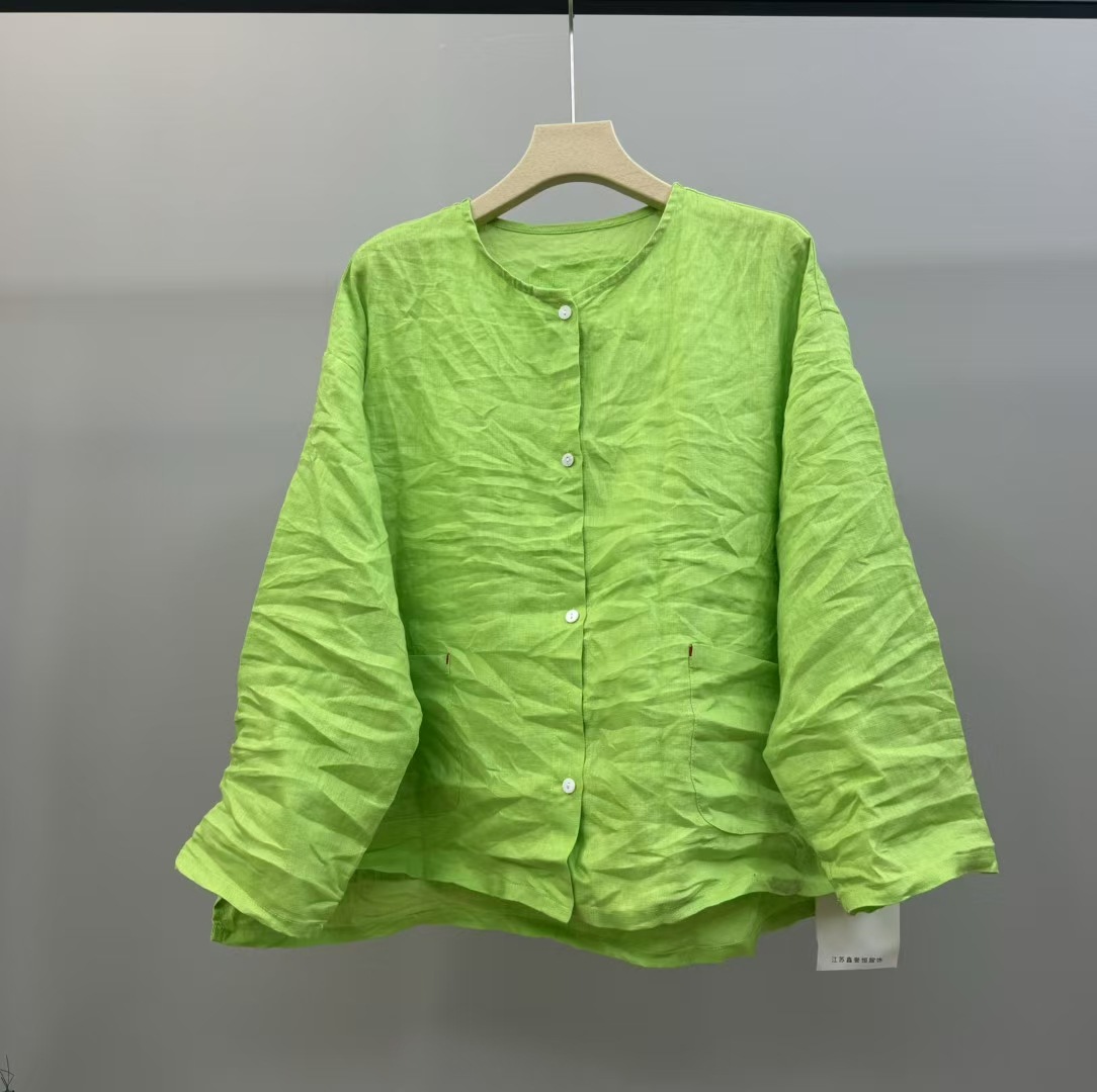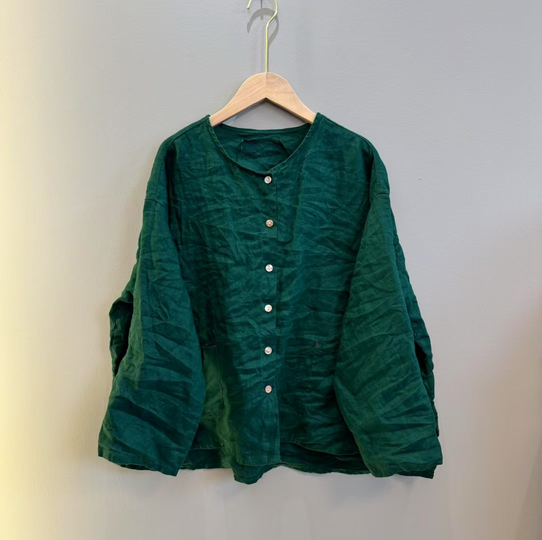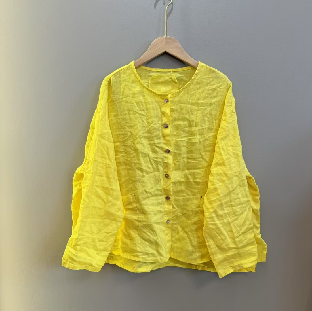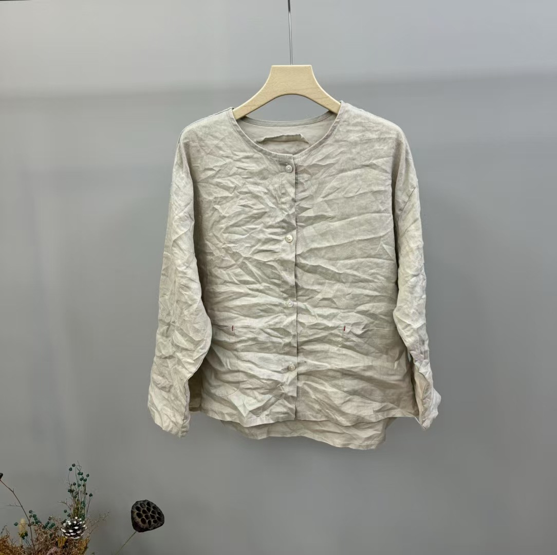 봄 2025 새로운 라운드 넥 예술적 우아한 단색 카디건 느슨한 캐주얼 리넨 셔츠스토어 가기