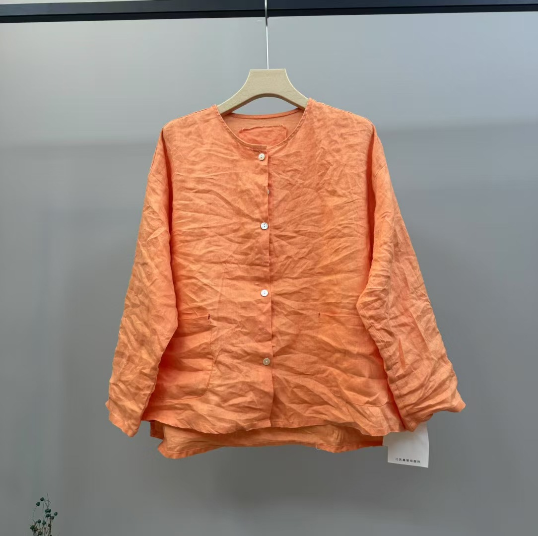 봄 2025 새로운 라운드 넥 예술적 우아한 단색 카디건 느슨한 캐주얼 리넨 셔츠