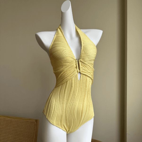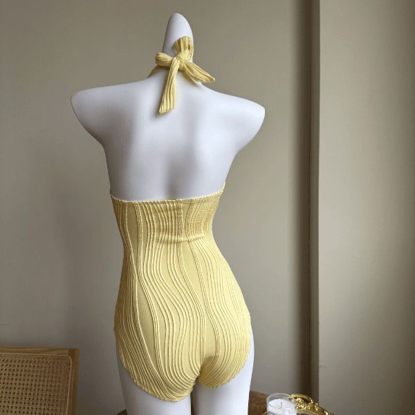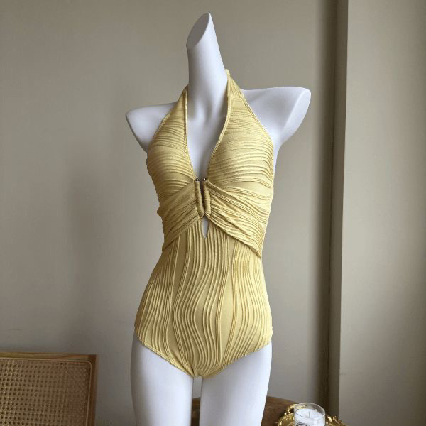 새로운 하이 엔드 간단한 대기 줄무늬 원피스 수영복 슬리밍 해변 휴가 수영복 노란색 흰색 섹시한 여름