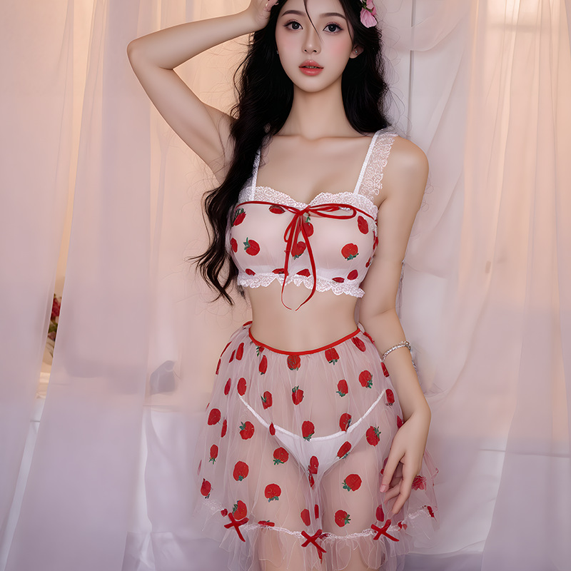 딸기를 먹어라! 티페이 섹시 란제리 시스루 쉬폰 달콤한 메이드 얇은 끈 팬티 세트 순수한 욕망 커플 란제리스토어 가기