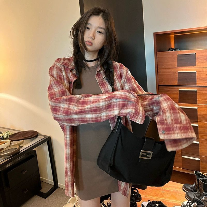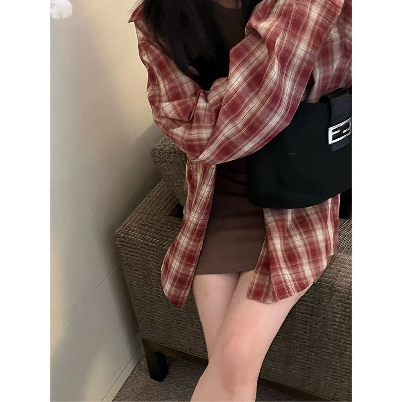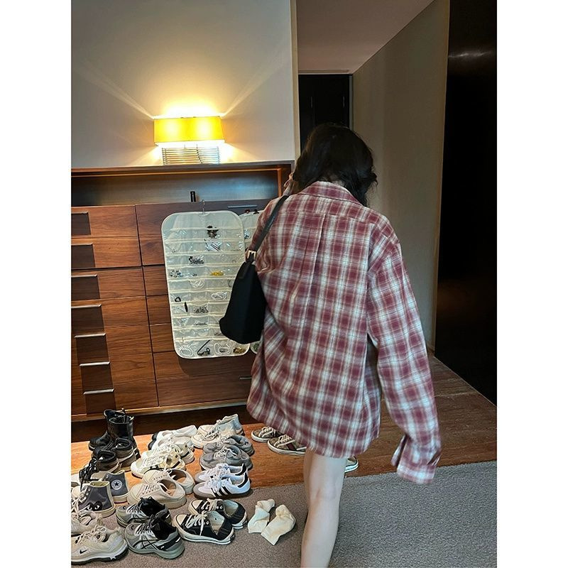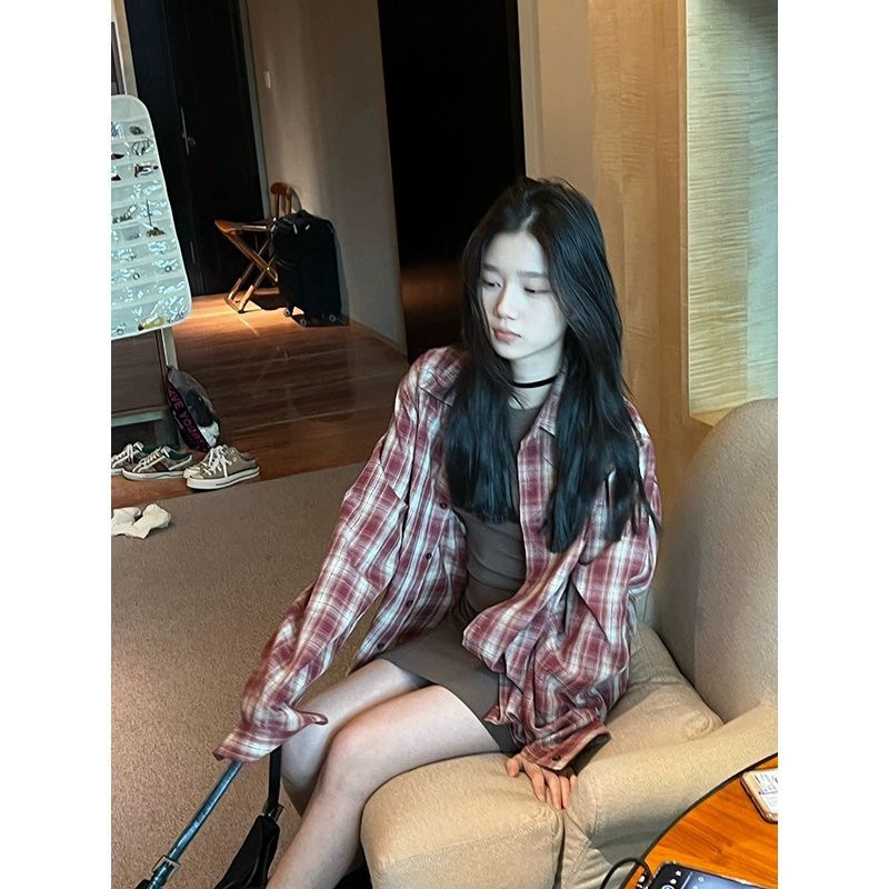 봄과 가을 2025 새로운 격자 무늬 셔츠 여성용 한국식 느슨한 빨간 카디건 긴팔 최고 선스크린 코트 트렌디스토어 가기