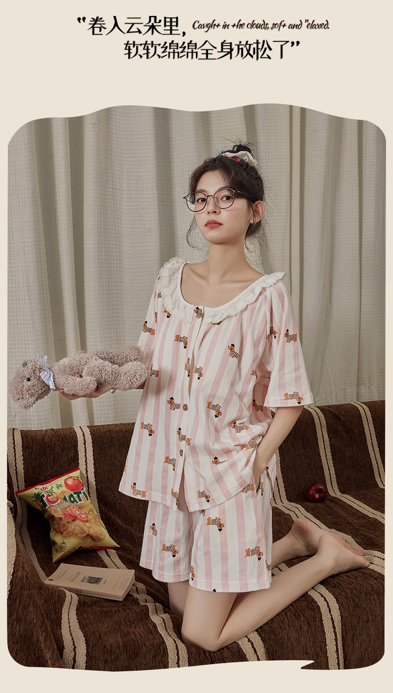 가슴 패드와 샤넬 스타일 잠옷 여성 여름 얇은 카디건 짧은 소매 반바지 인터넷 인기 달콤한 귀여운 느슨한 홈 옷