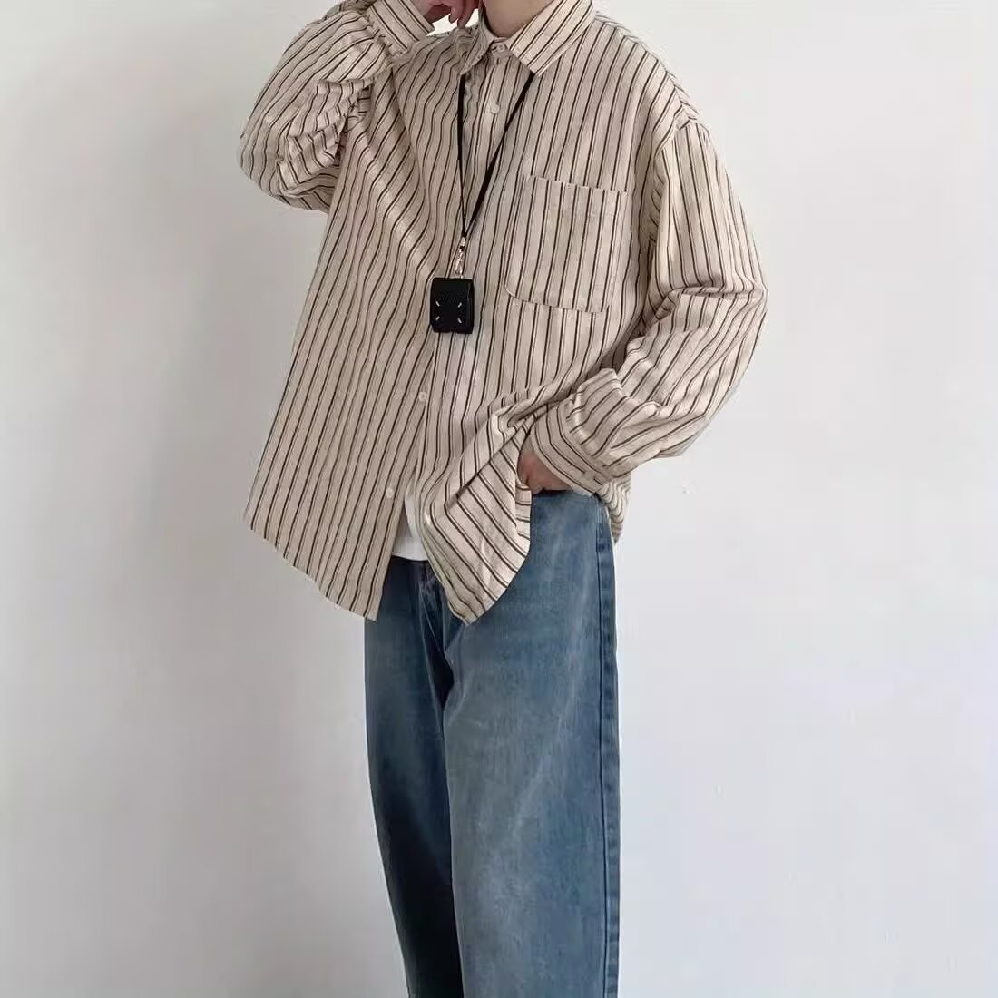 2025 봄과 가을 일본 스타일 레트로 스트라이프 긴팔 셔츠 남성용 트렌디 브랜드 루즈 캐주얼 셔츠 재킷 남성용스토어 가기