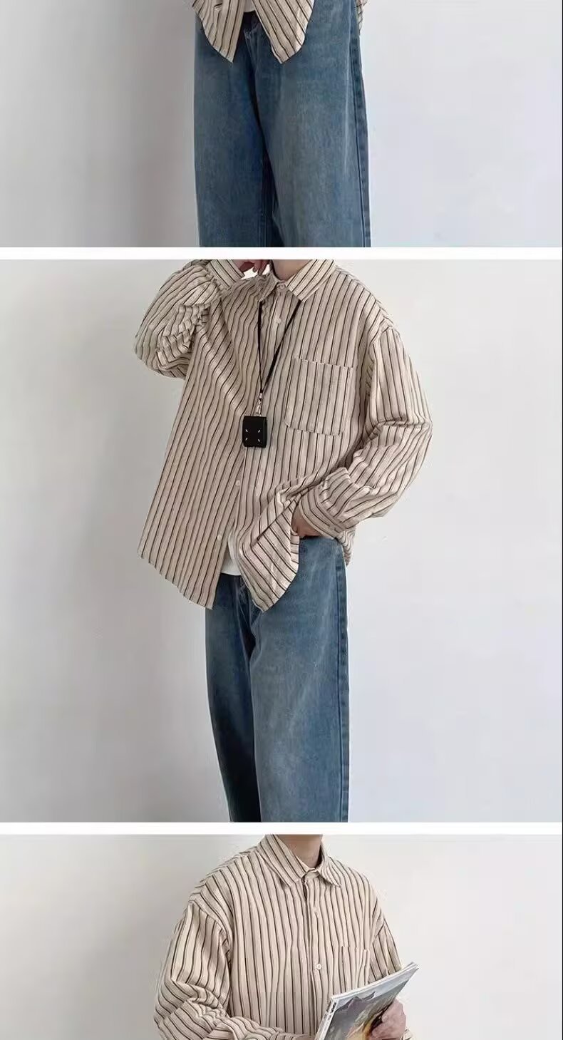 2025 봄과 가을 일본 스타일 레트로 스트라이프 긴팔 셔츠 남성용 트렌디 브랜드 루즈 캐주얼 셔츠 재킷 남성용
